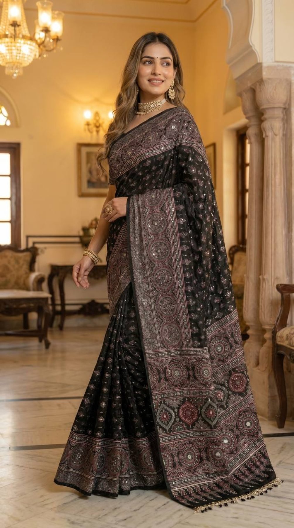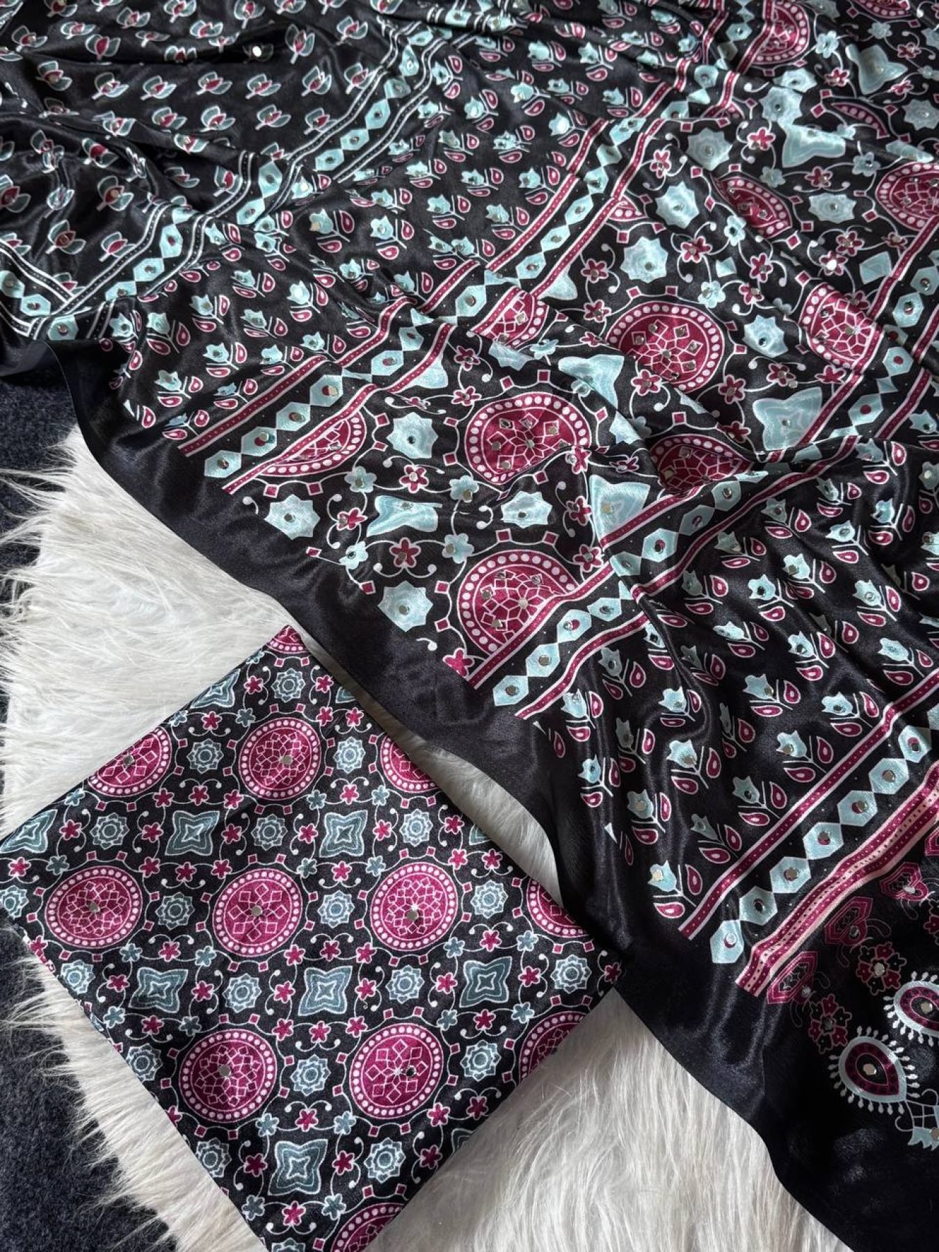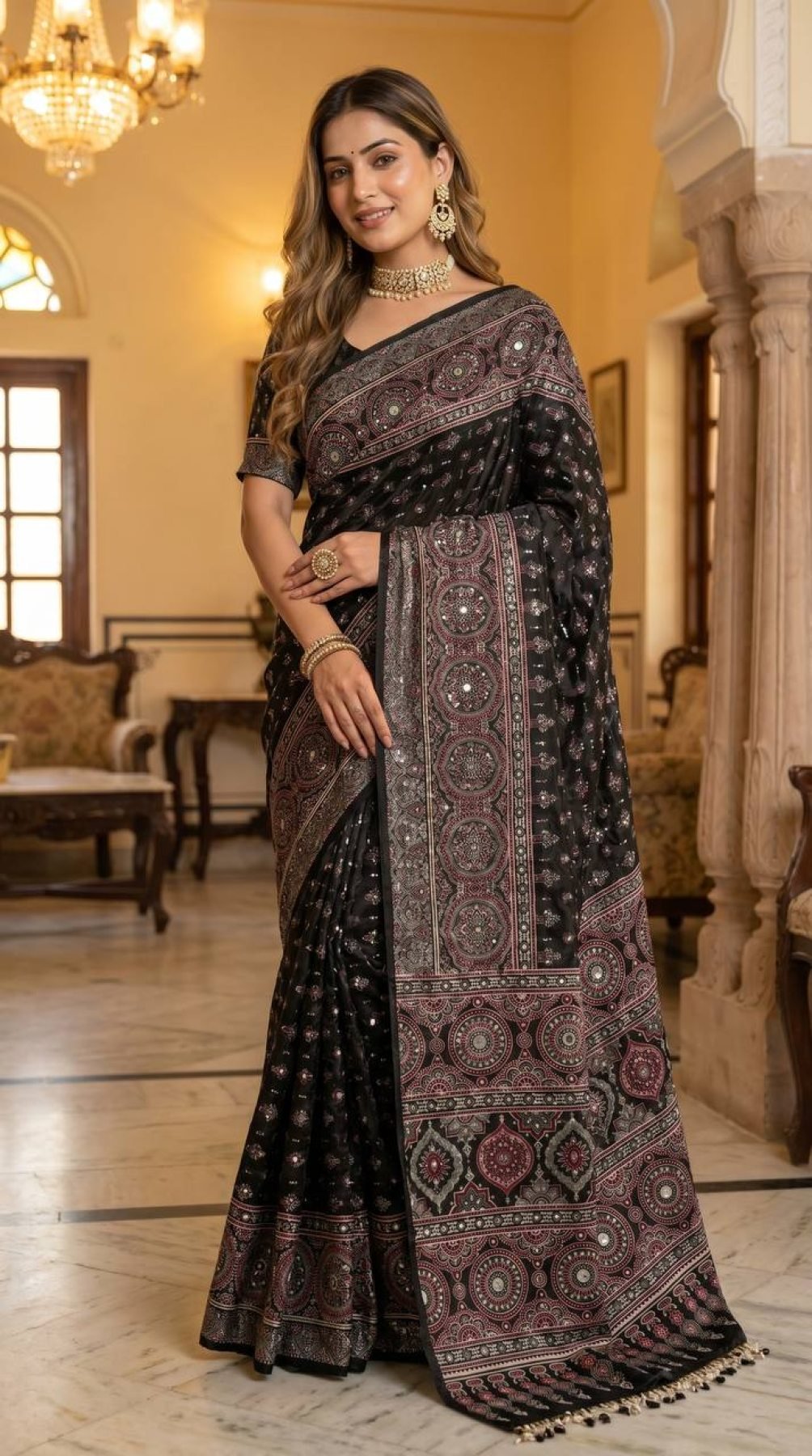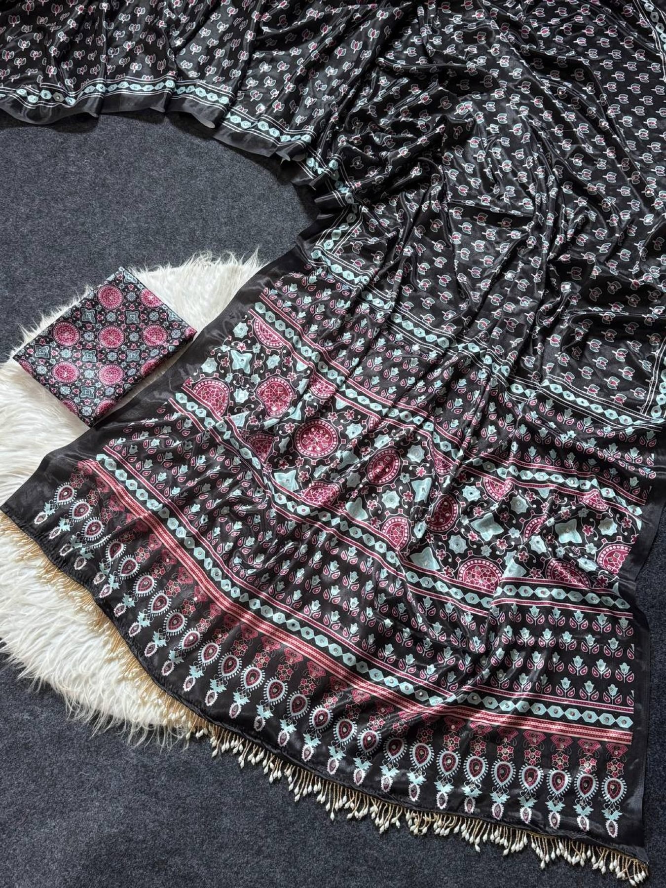 Bold Black Soft Satin Saree with Ajrakh Print and Matching Blouse