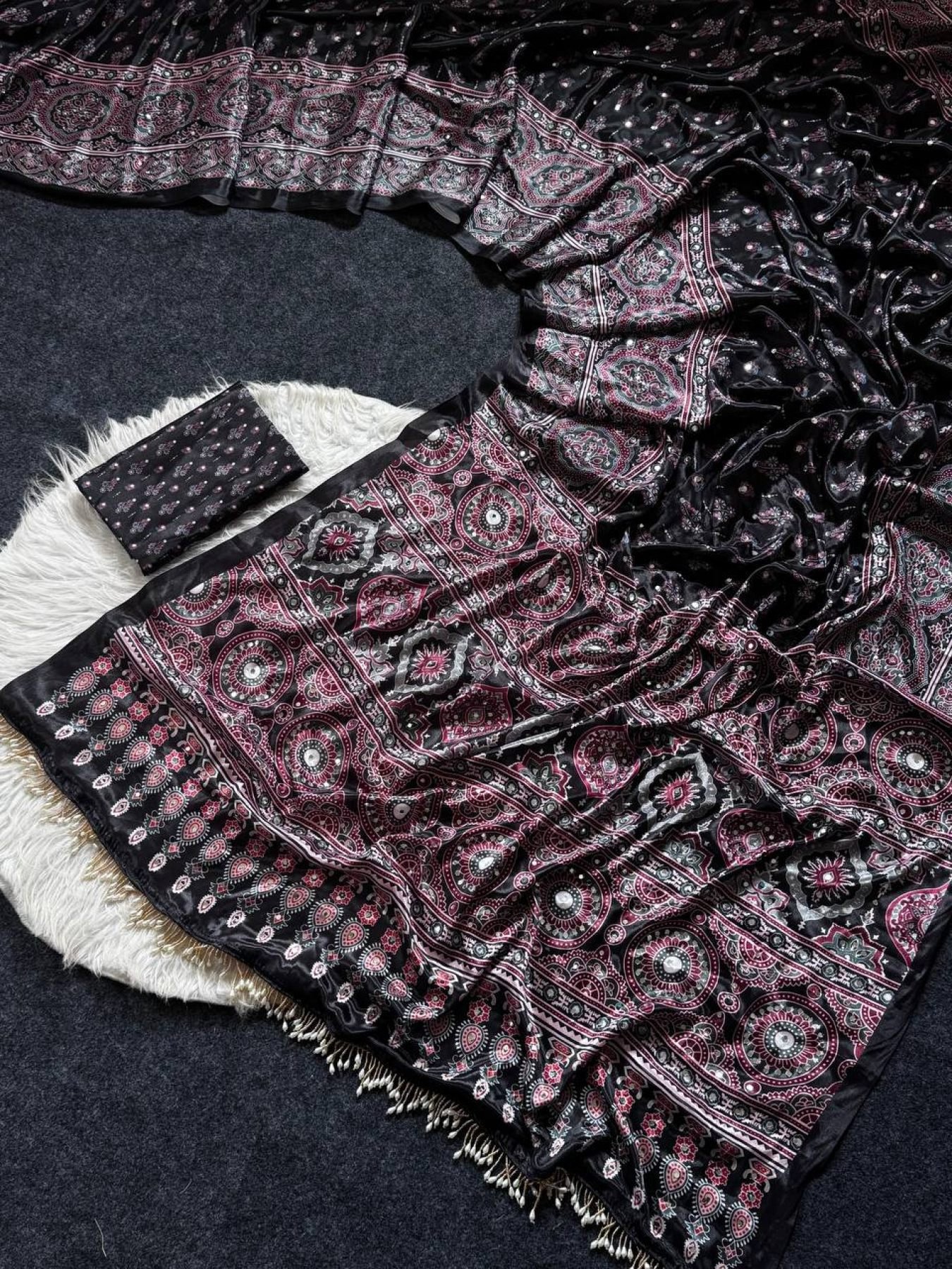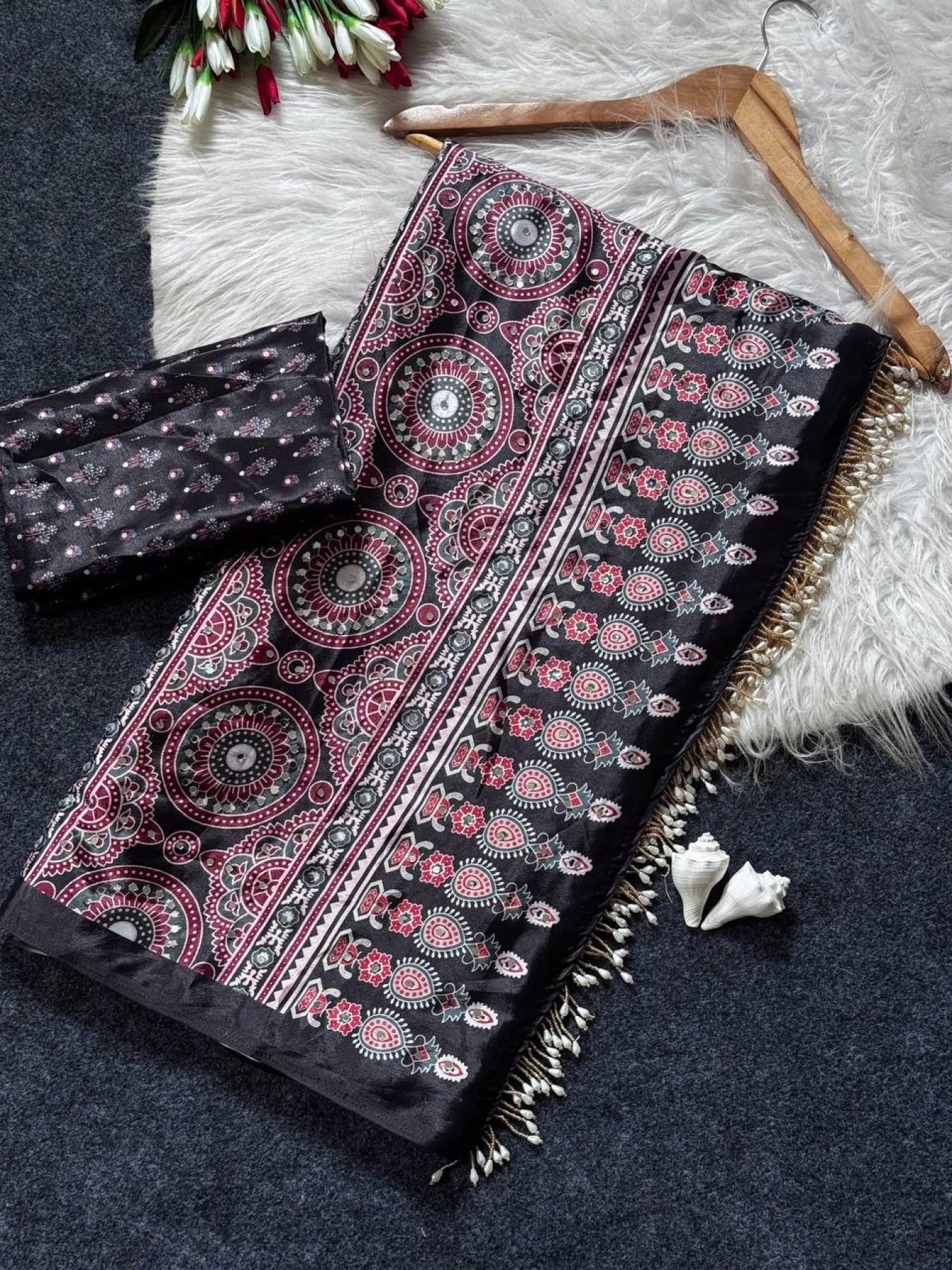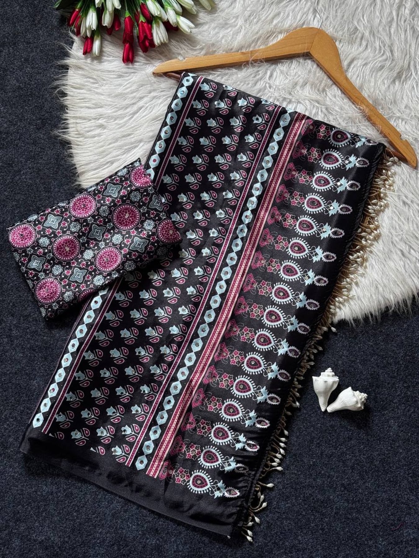 Bold Black Soft Satin Saree with Ajrakh Print and Matching Blouse