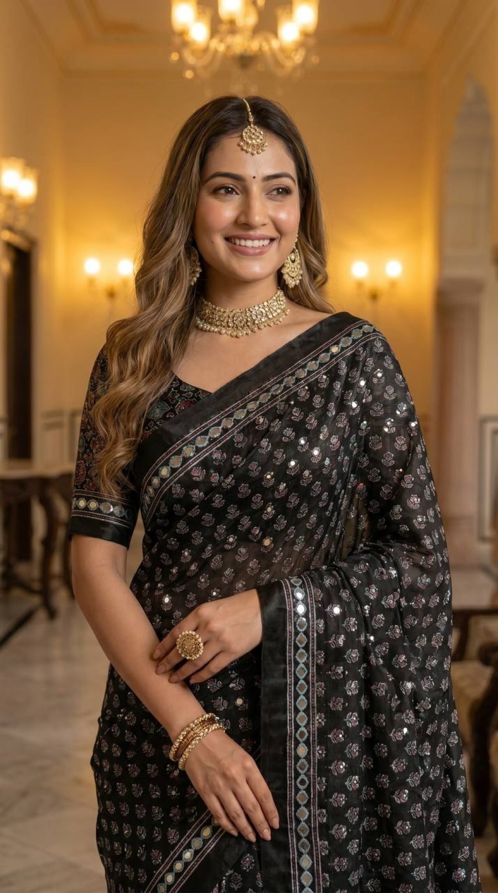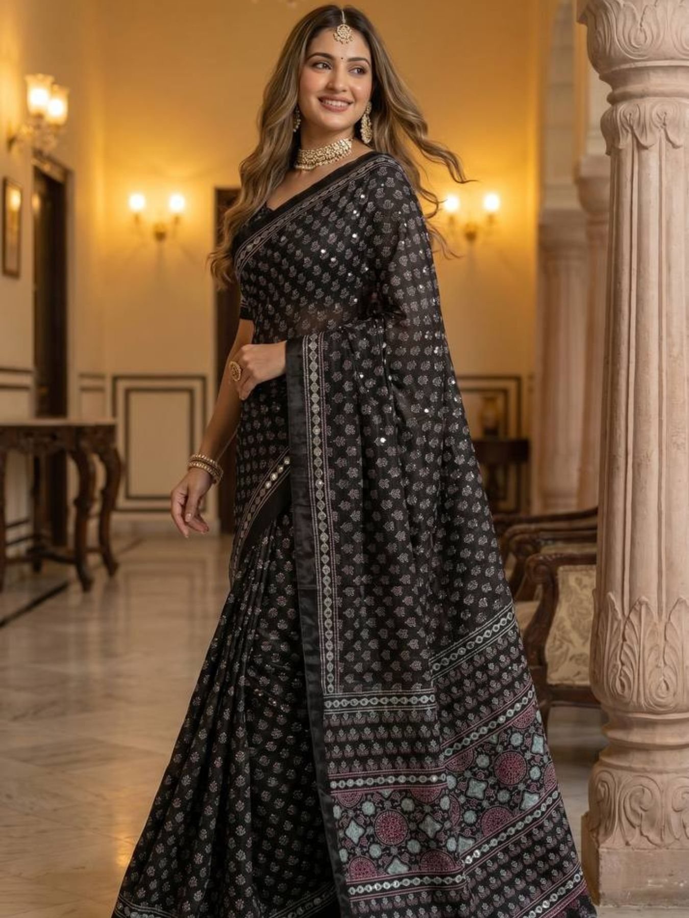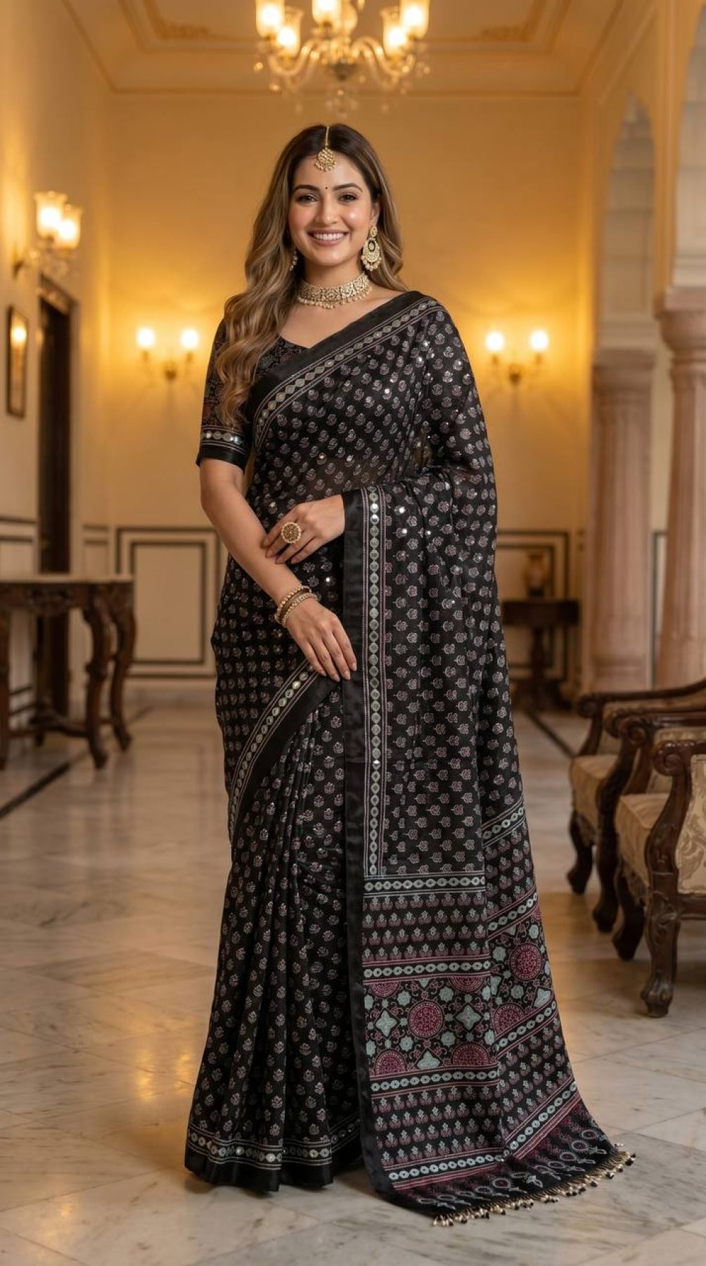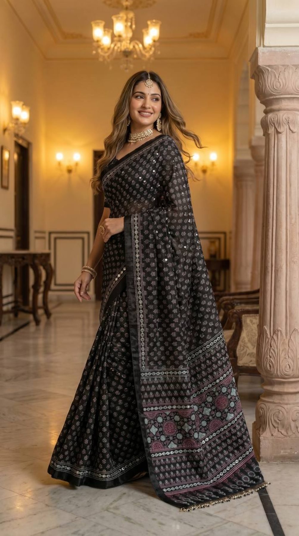 Bold Black Soft Satin Saree with Ajrakh Print and Matching Blouse