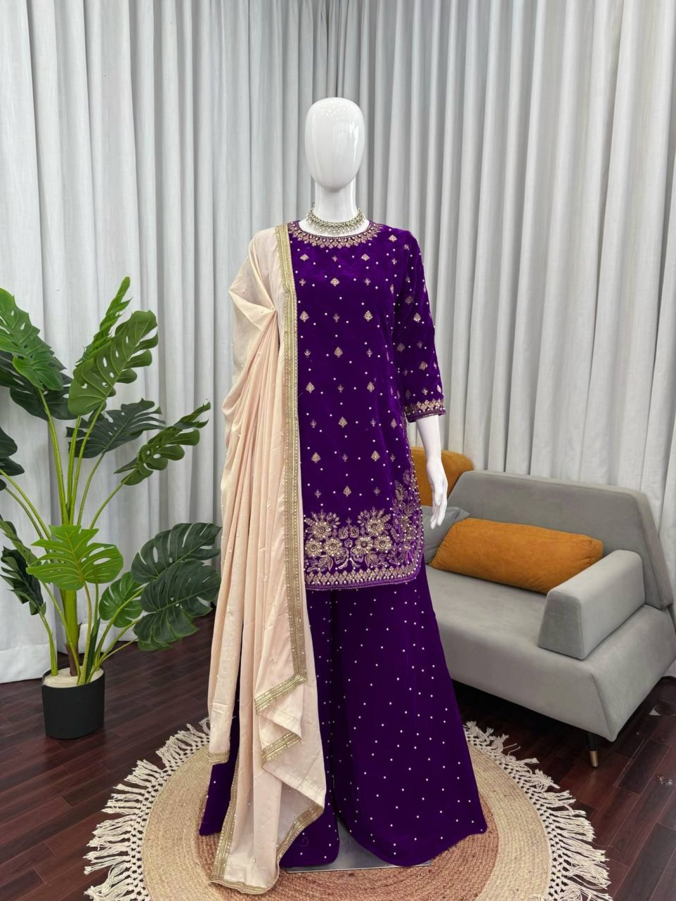 Bold Purple Fully Stitch Velvet Thread and Sequence Work for Boutique Buyers