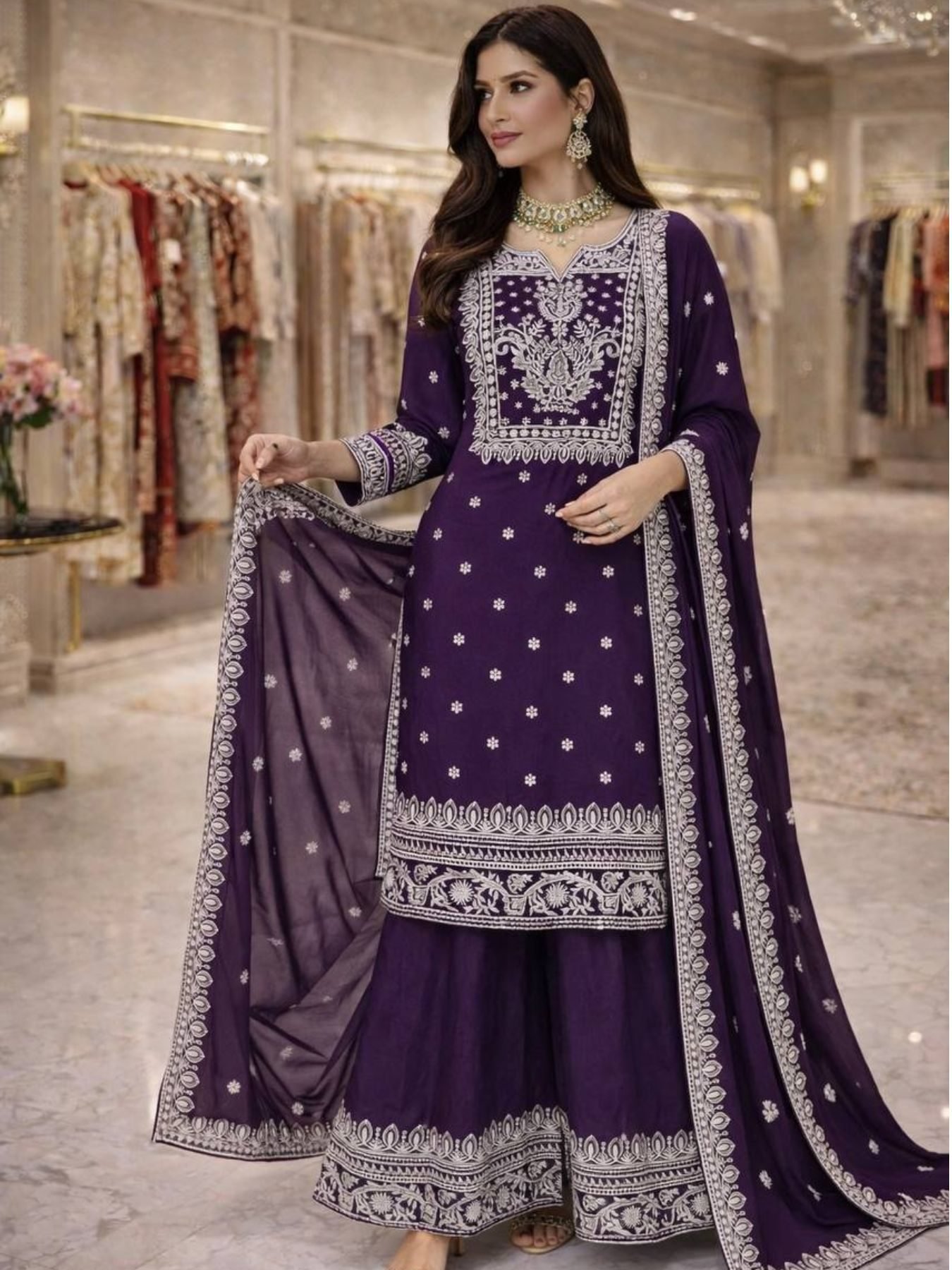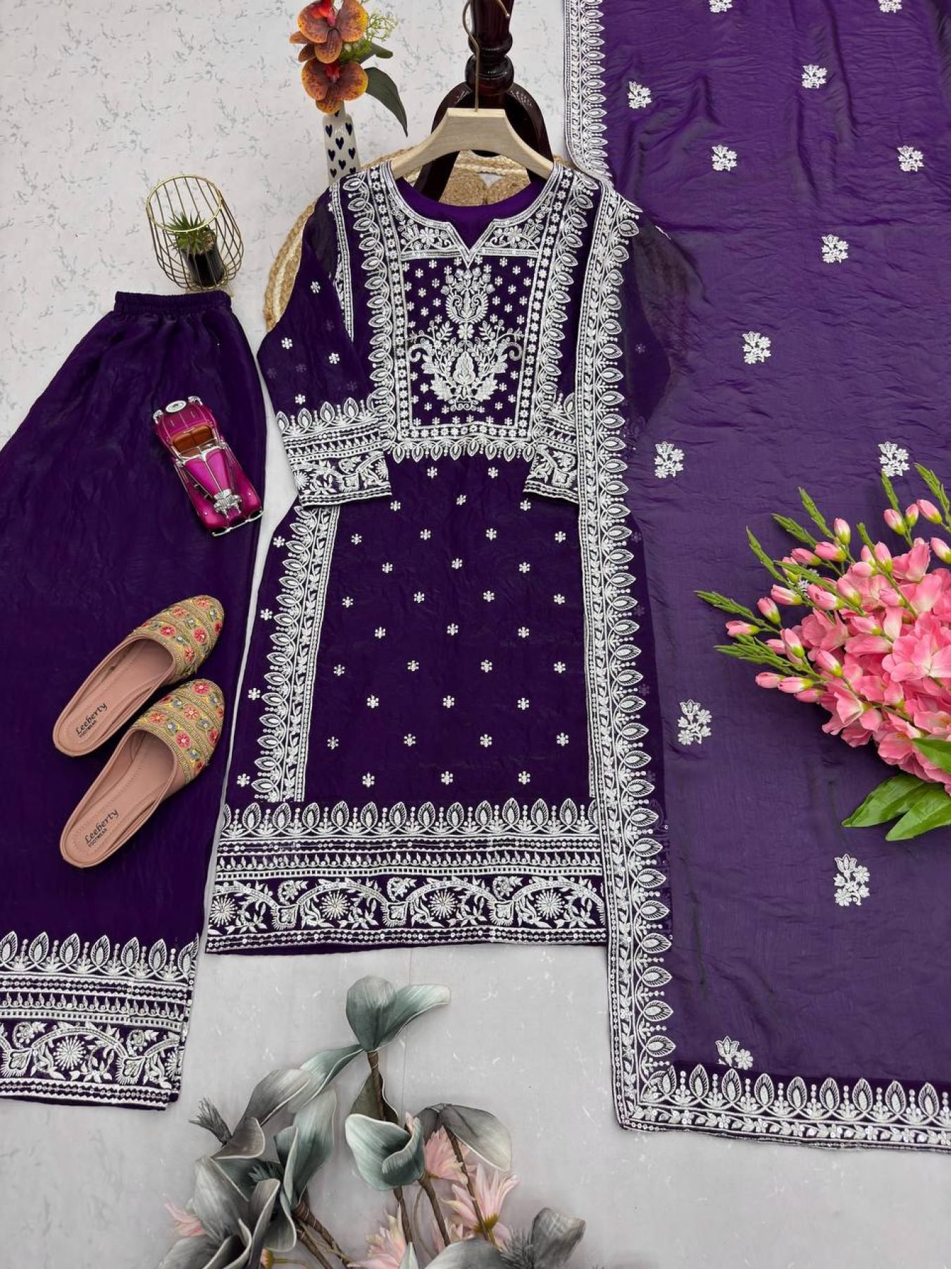 Bold Structure Purple Fandy Silk Embroidered Sequence And Thread Work Top Plazo Set with Elegant Finishing Dupatta