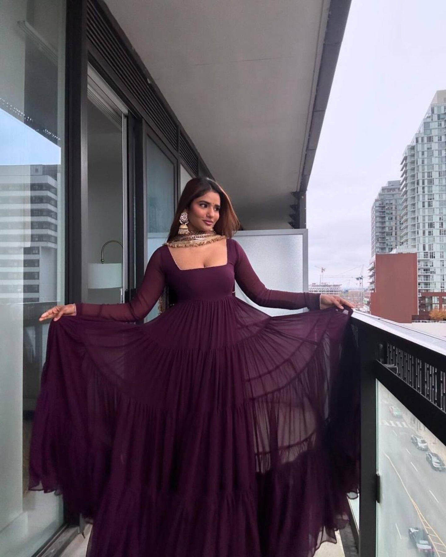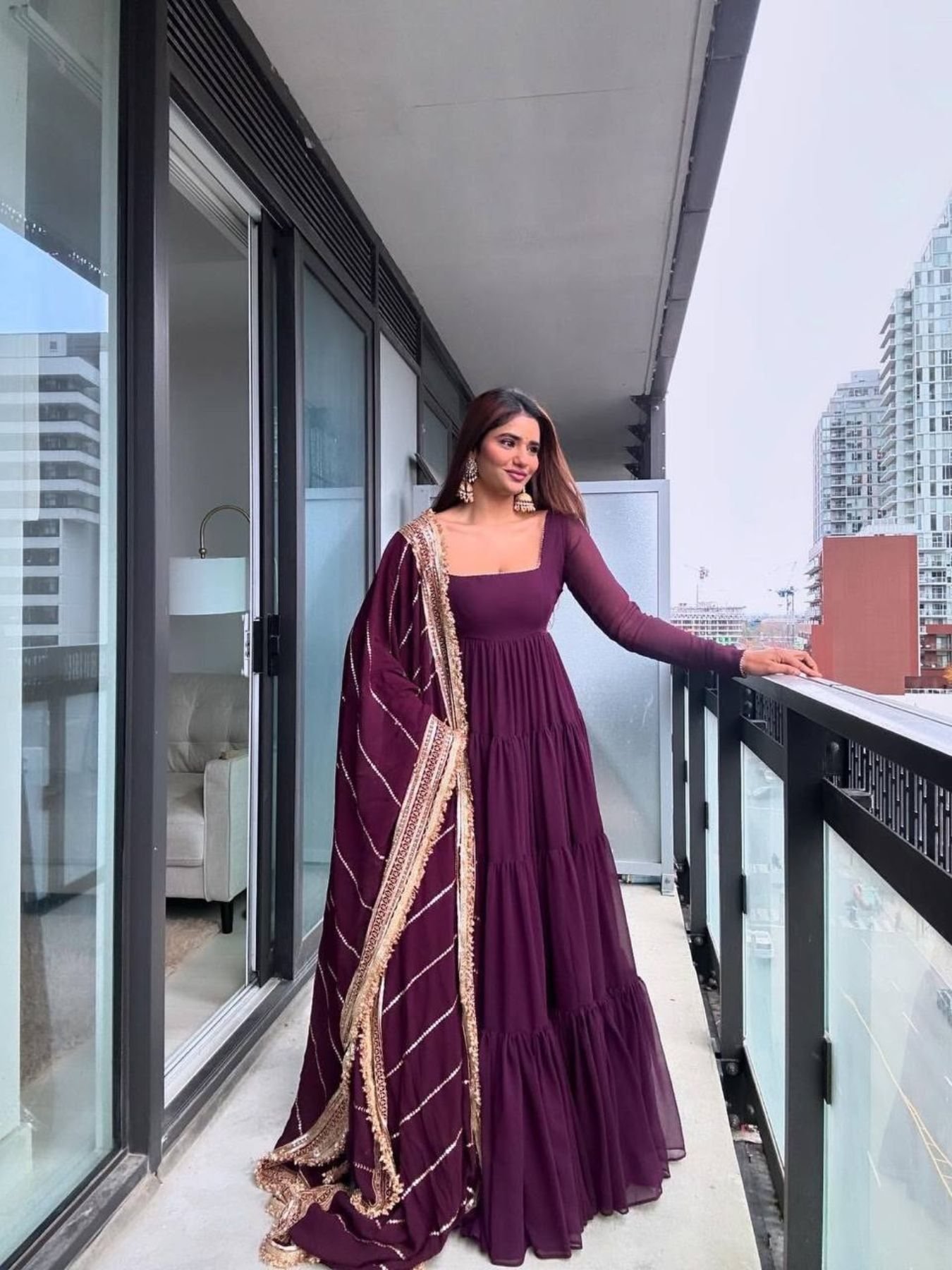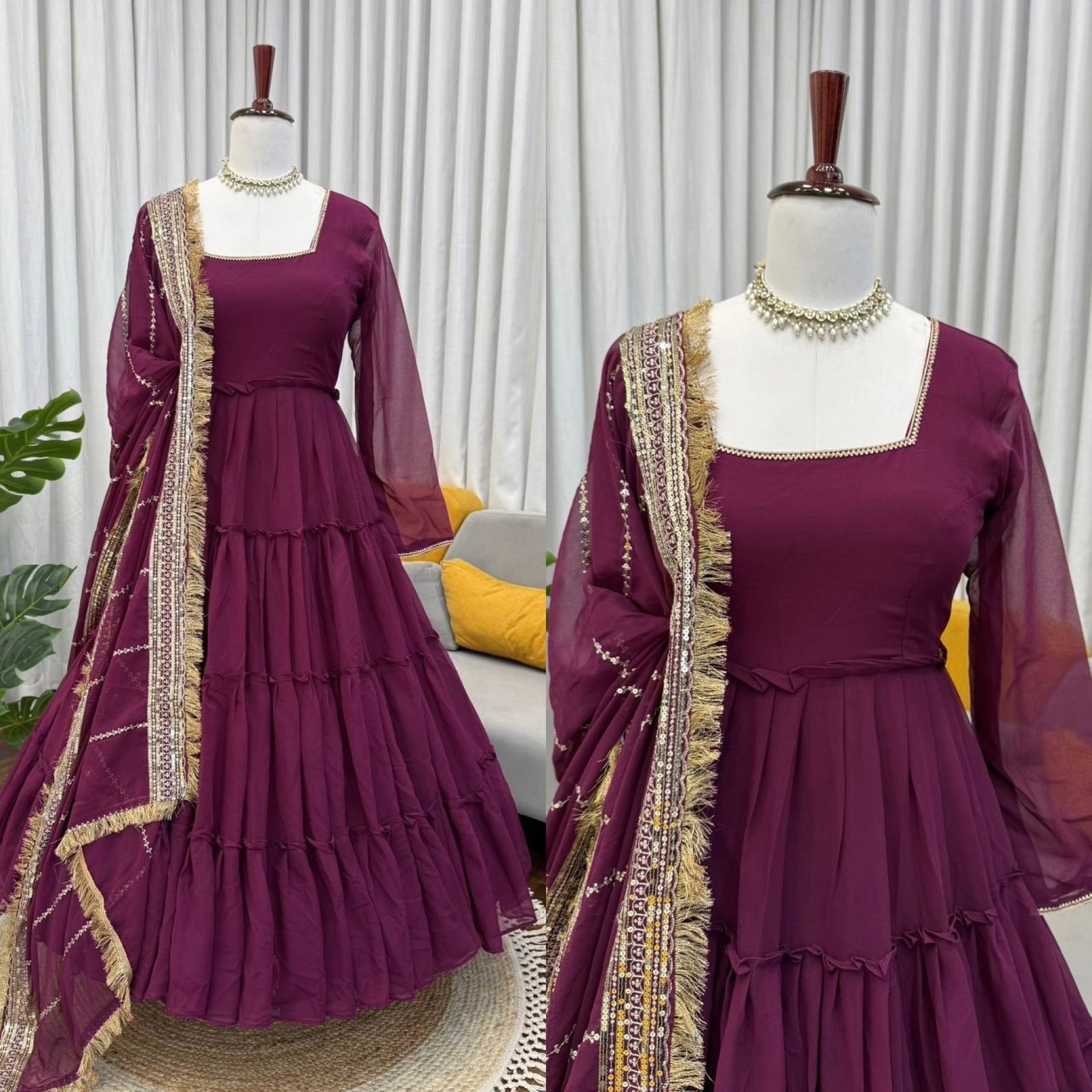 Bold Wine Ruffle Georgette Anarkali with Sequence Dupatta Perfect for Functional Wear