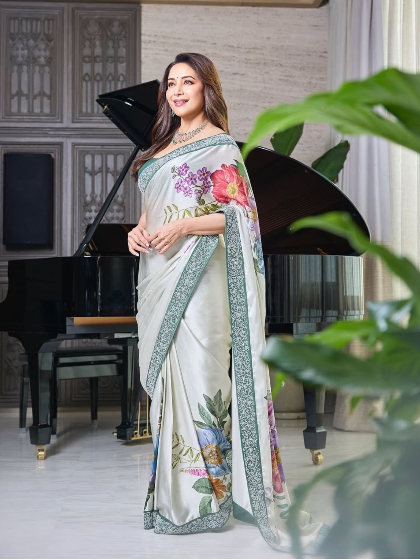 Bollywood Satin Madhuri Dixit Inspired Satin Silk Saree Cocktail Party Wear New Summer Collection