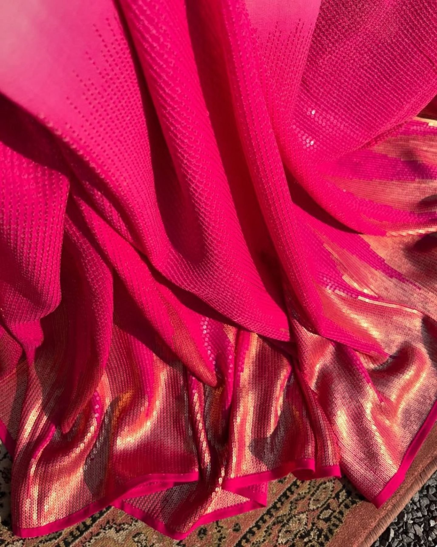 Stunning bollywood-style saree crafted in heavy faux georgette featuring rich zari and dual sequins embroidery work. Designed with tassel pallu and dual color piping, this premium saree is perfect for weddings, parties, and festive occasions.