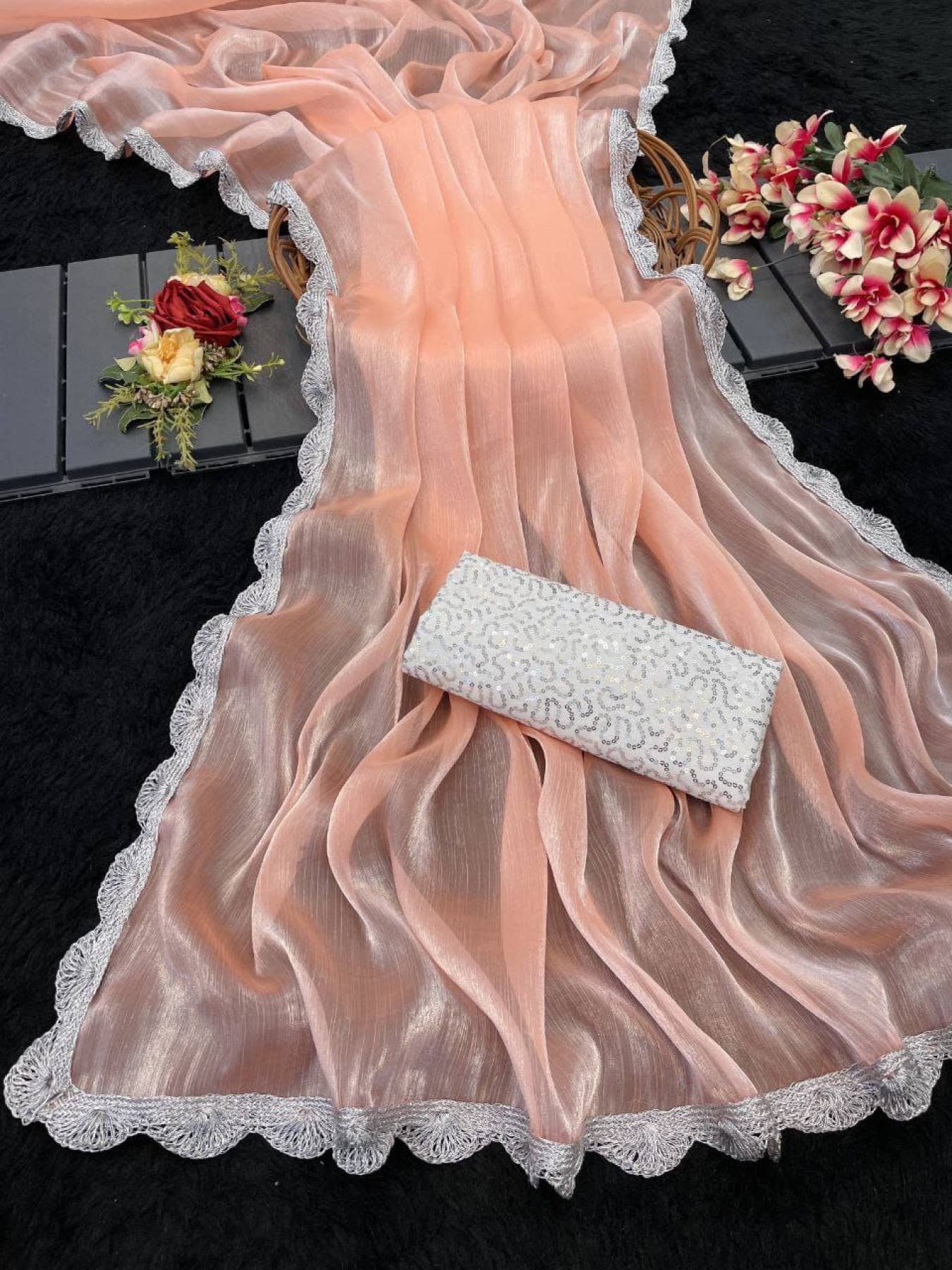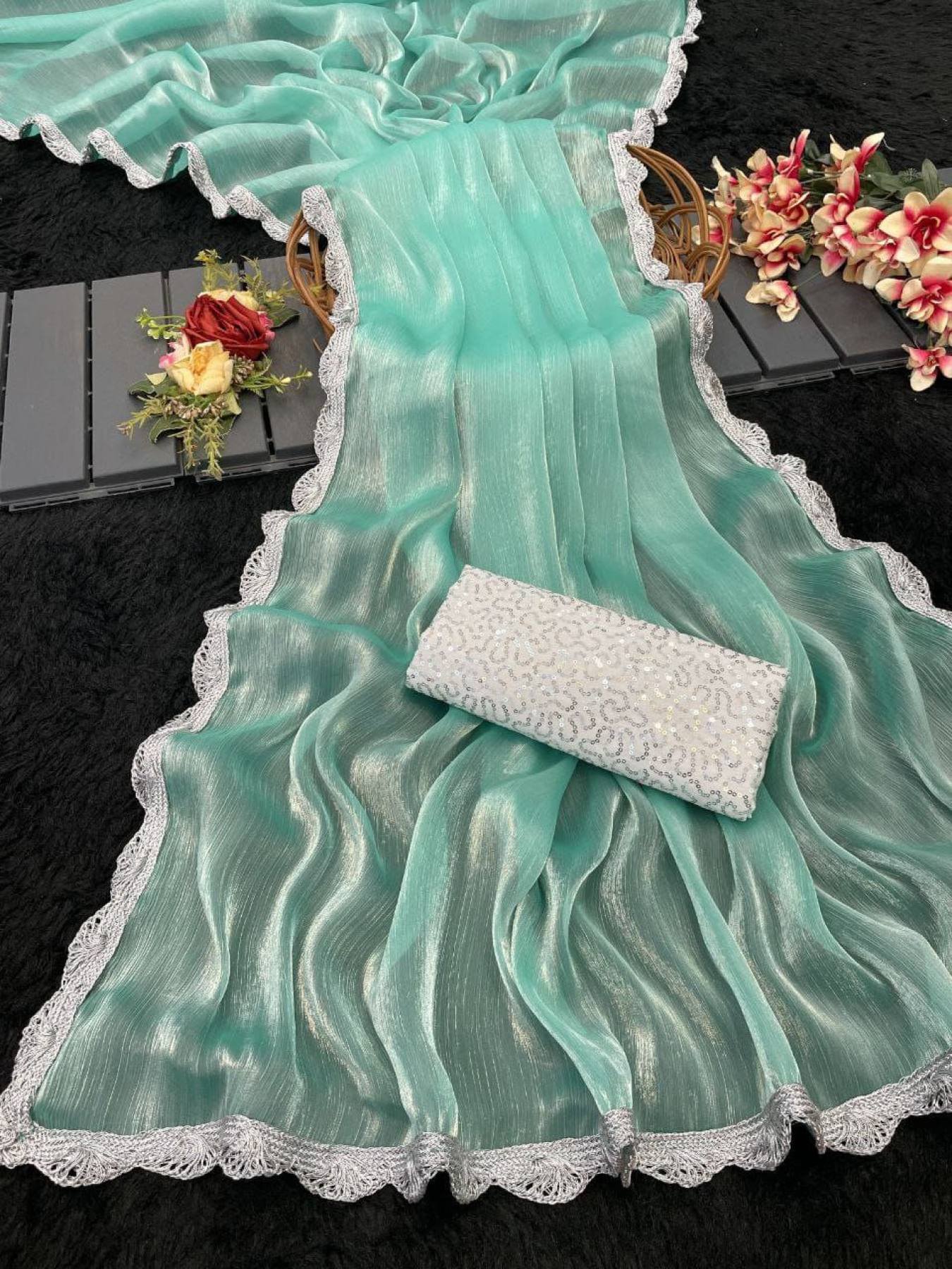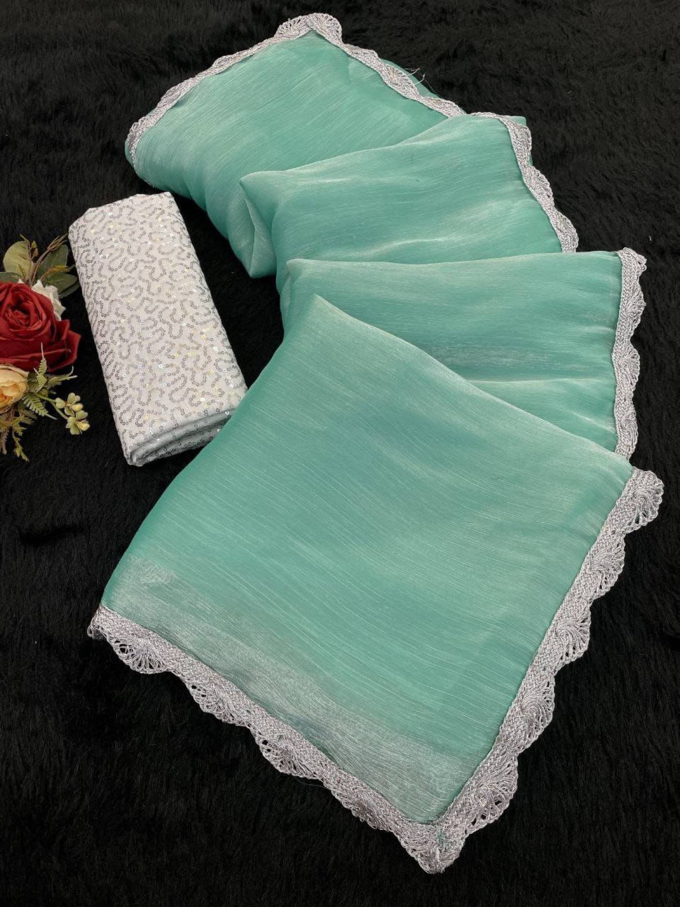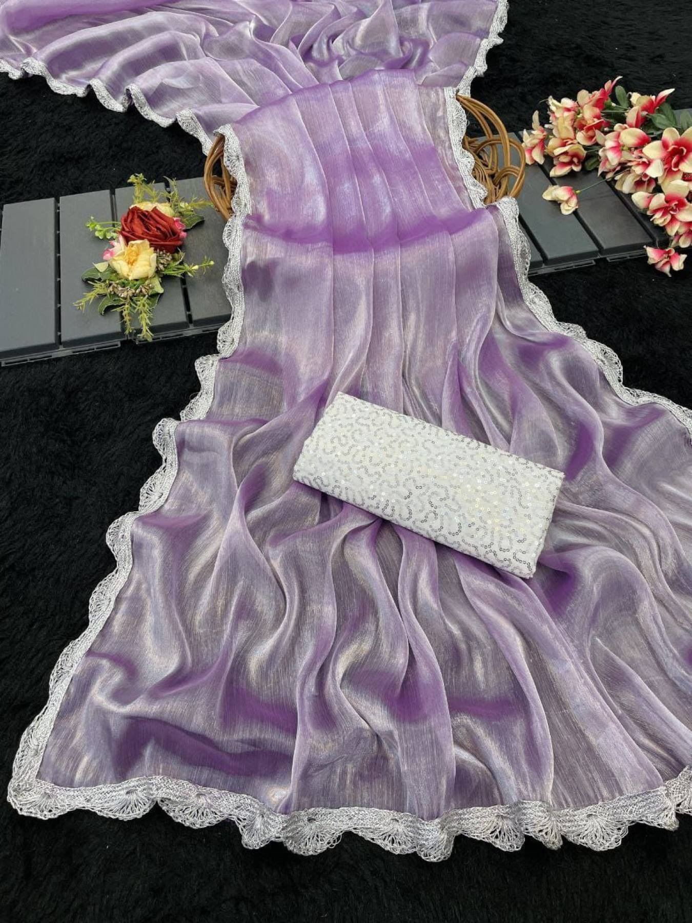 Bollywood Trending Jimee Chu Saree with Premium Silver Lace & Sequin Embroidery Blouse