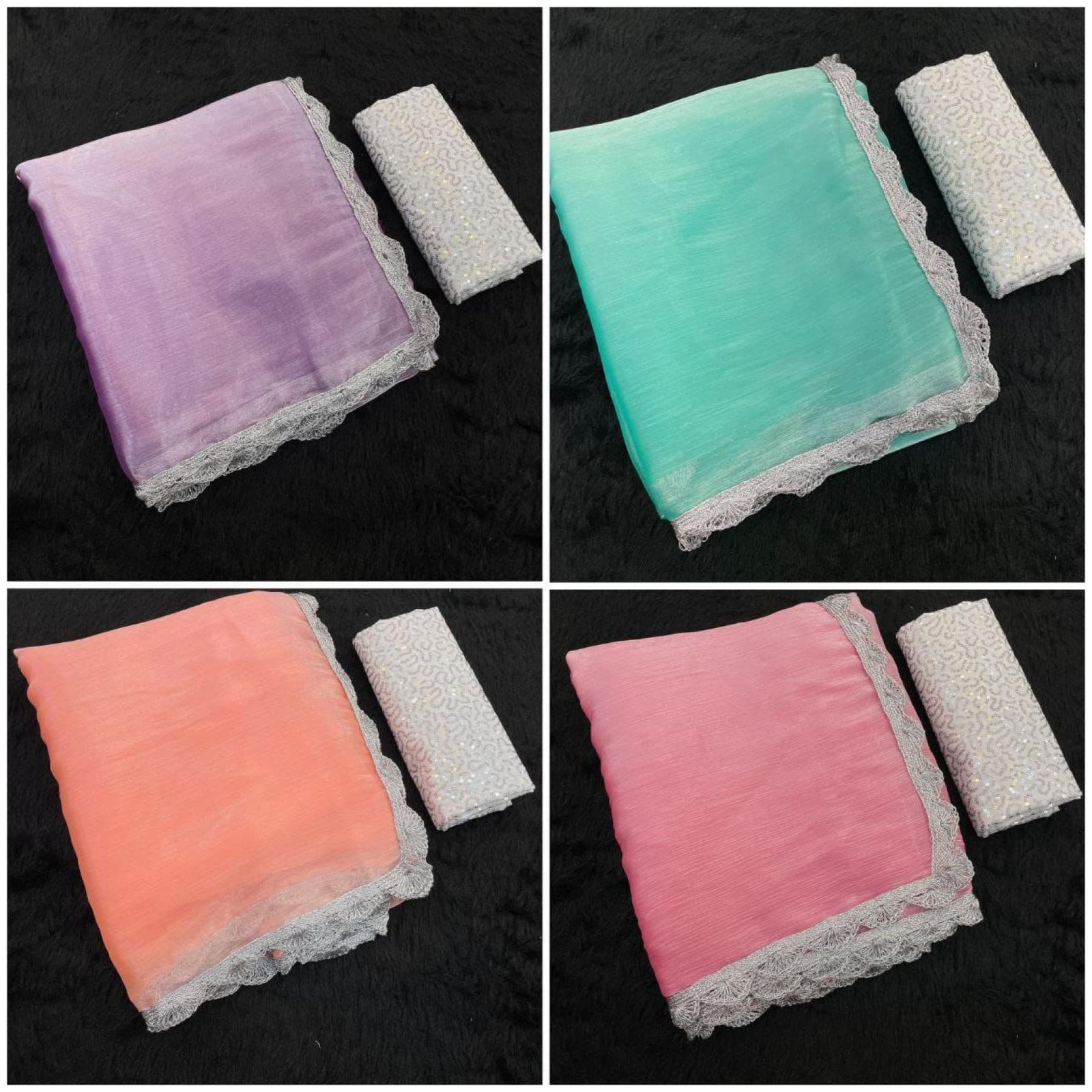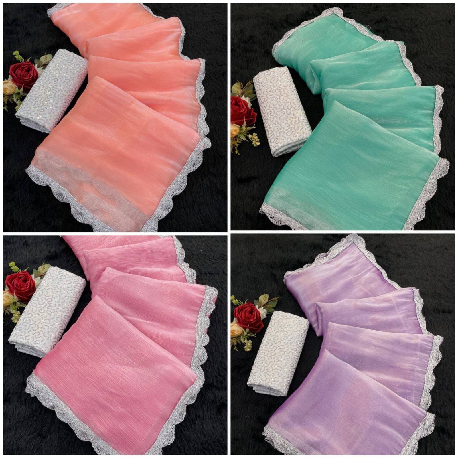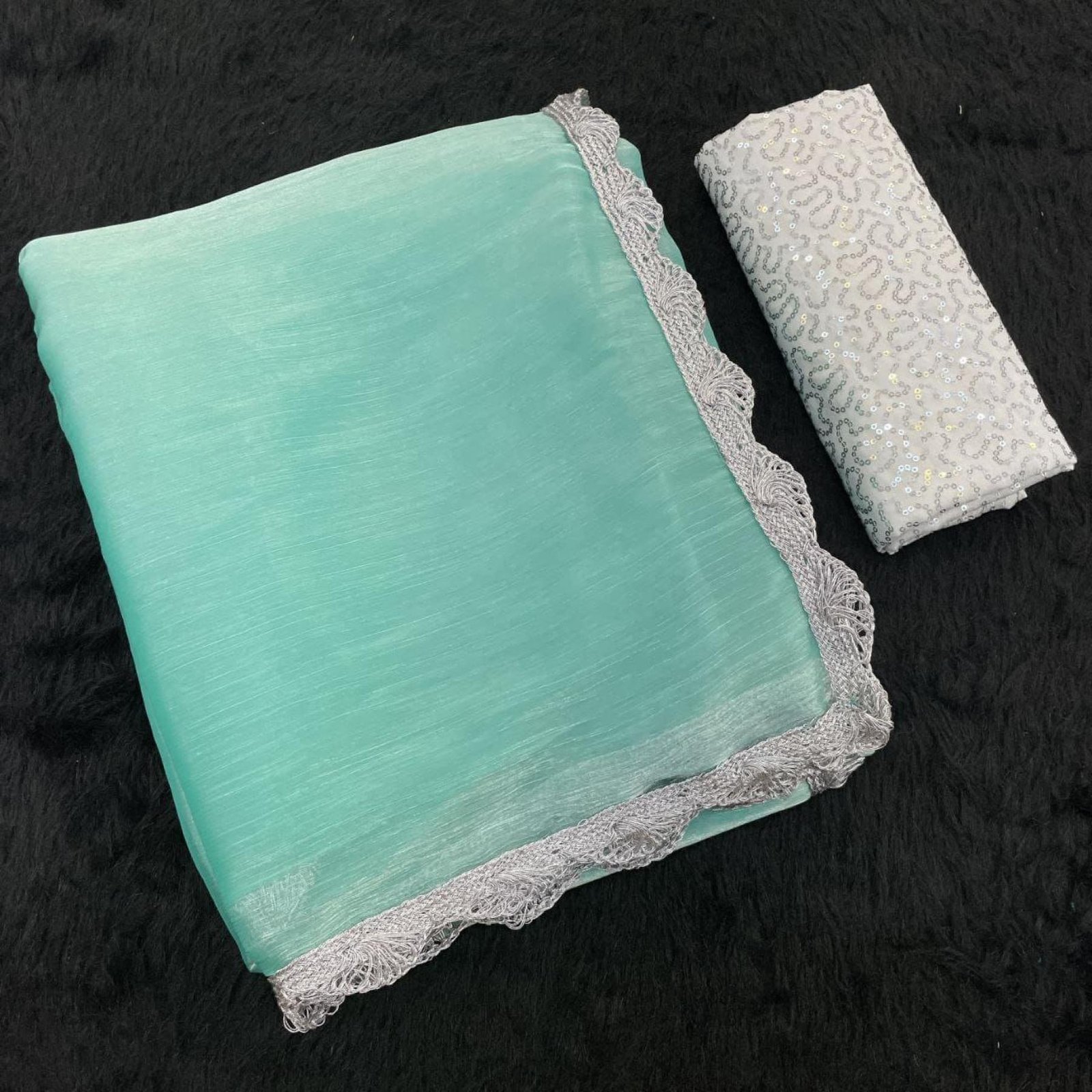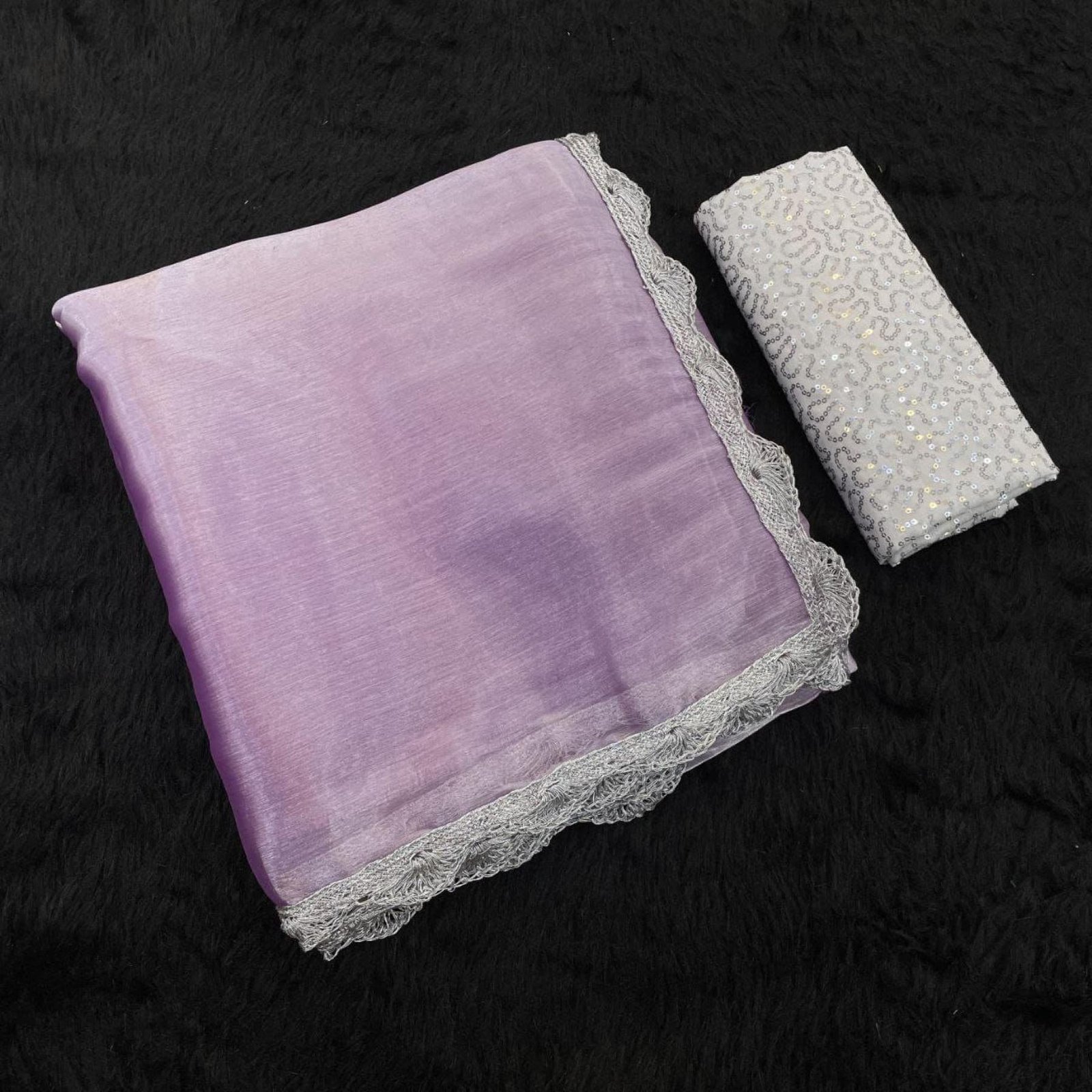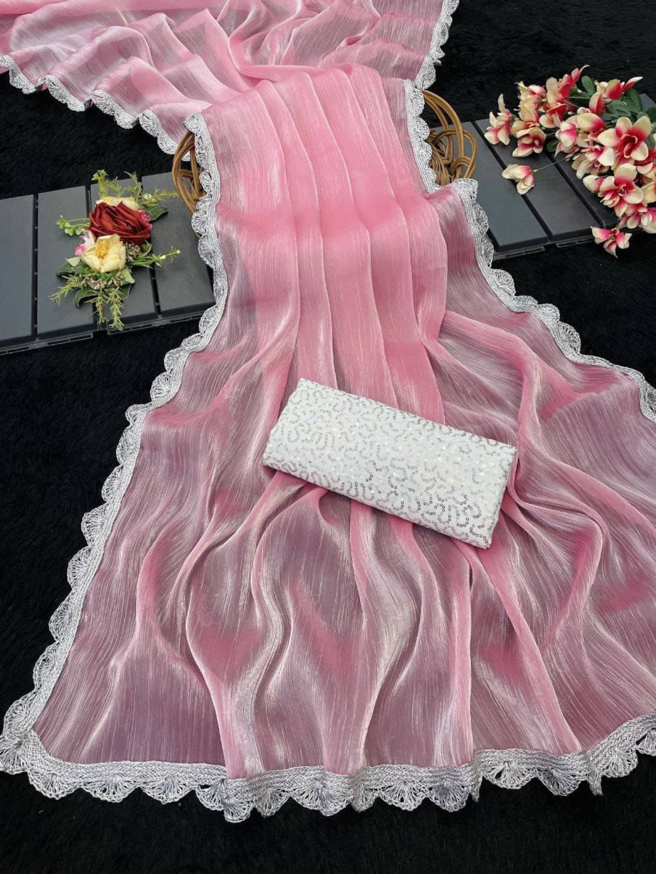 Bollywood Trending Jimee Chu Saree with Premium Silver Lace & Sequin Embroidery Blouse