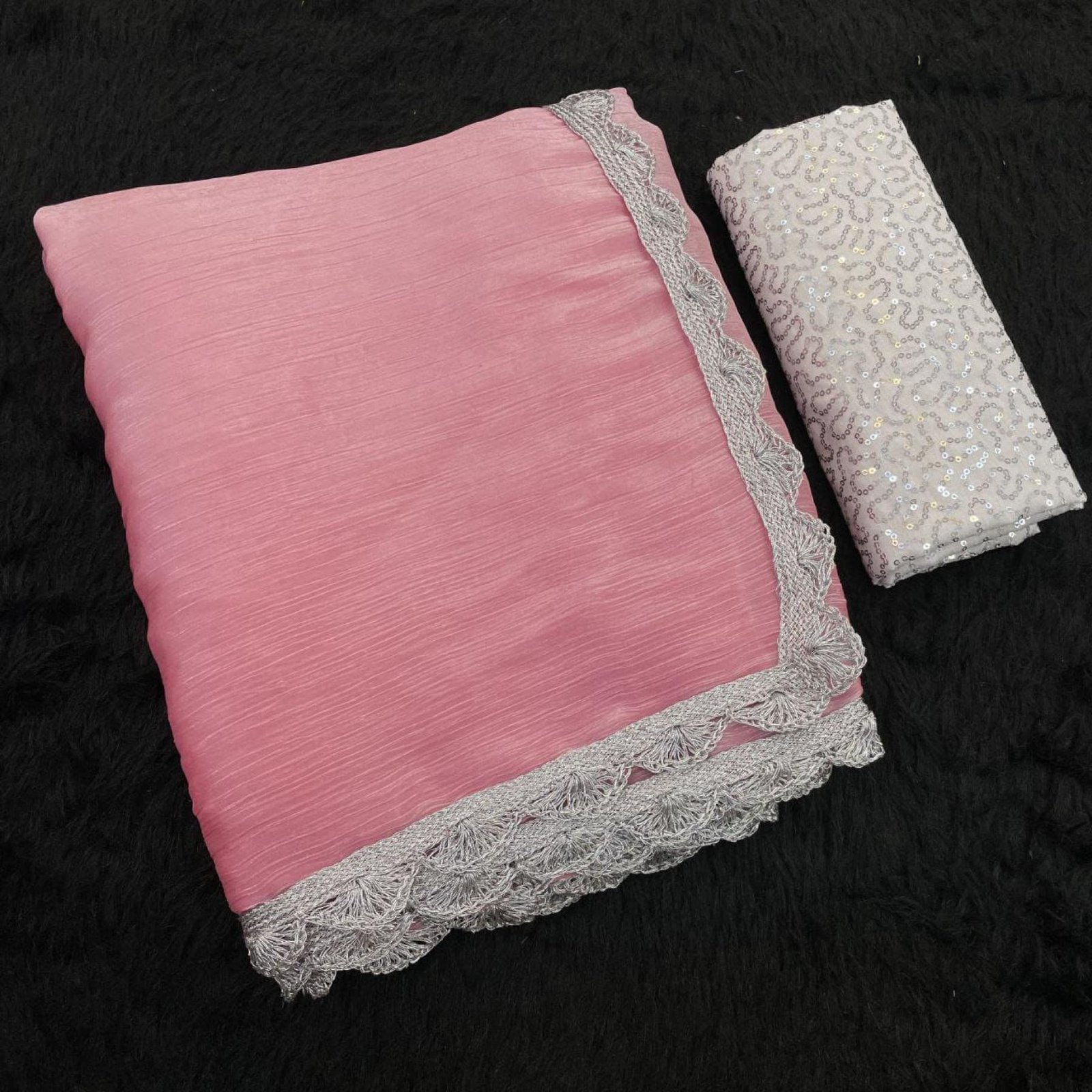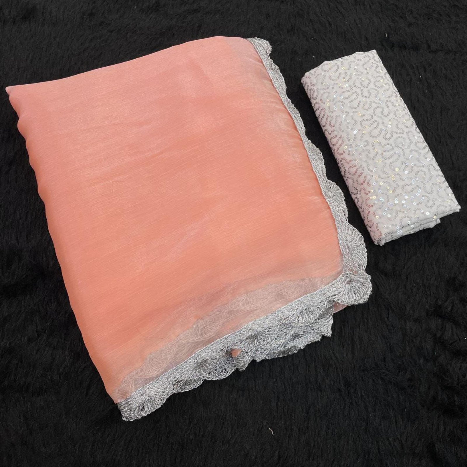 Step into star-inspired elegance with this Bollywood Trending Jimmy Choo Saree, designed to make every occasion glamorous. Crafted from luxurious Jimmy Choo fabric and finished with a premium silver lace border, this saree exudes sophistication and shine. Paired with a beautifully embroidered sequence blouse, it’s the perfect statement piece for weddings, parties, and high-fashion festive wear.