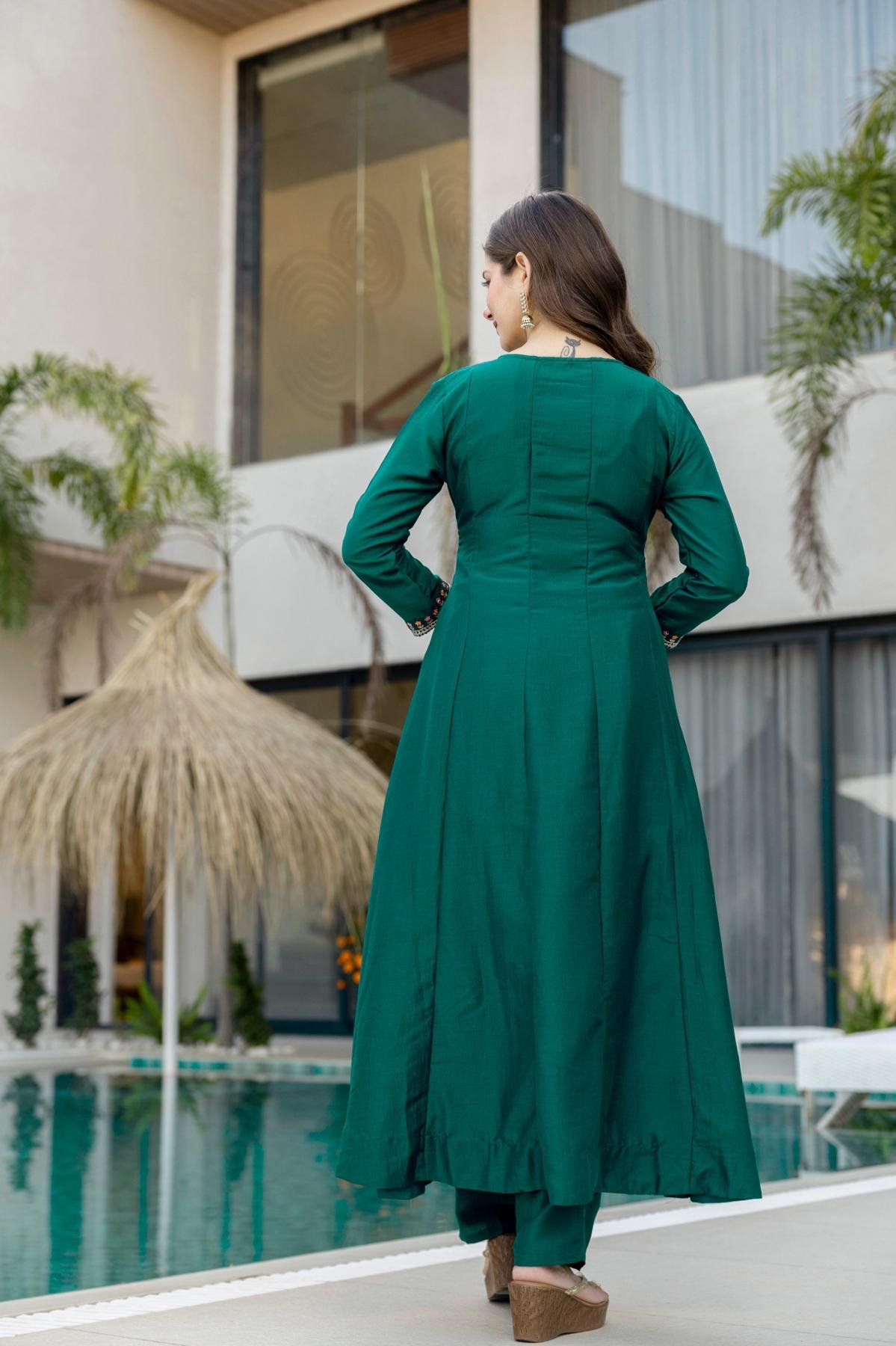 Bottle Green Embroidered Chinon Anarkali Kurta With Dupatta Set