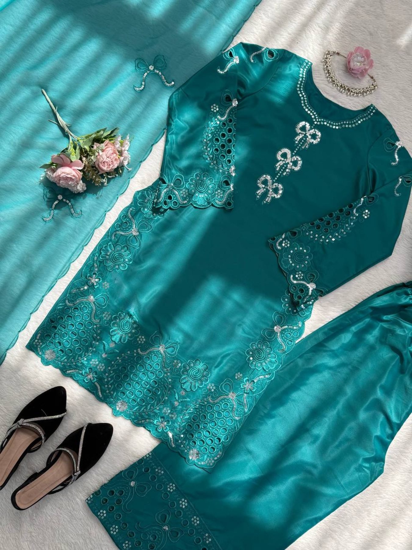 Elegant crepe silk suit set featuring intricate thread embroidery on top and pant, paired with premium tibby silk dupatta. Perfect for festive, office wear, and party occasions with a classy ethnic look.