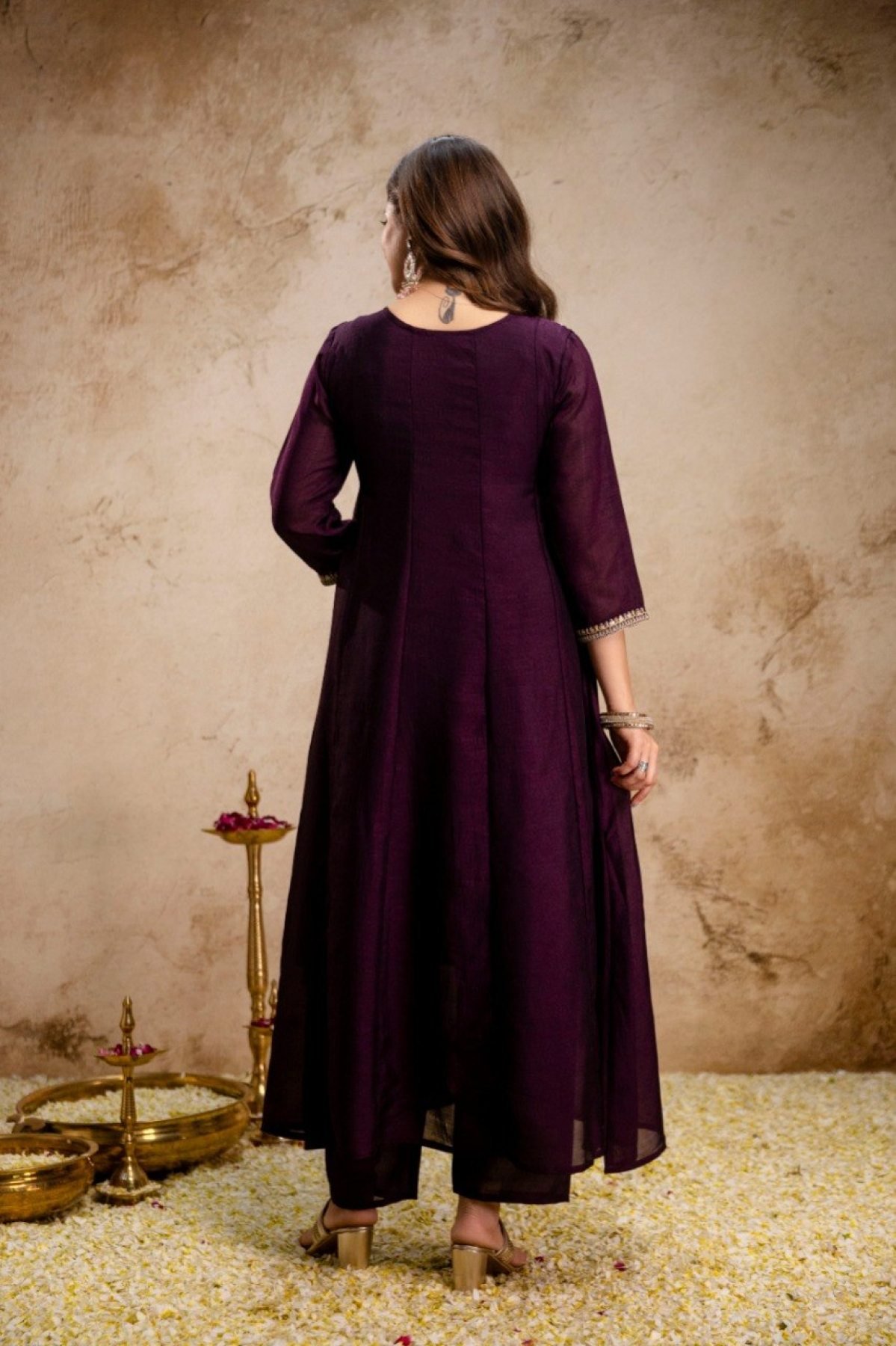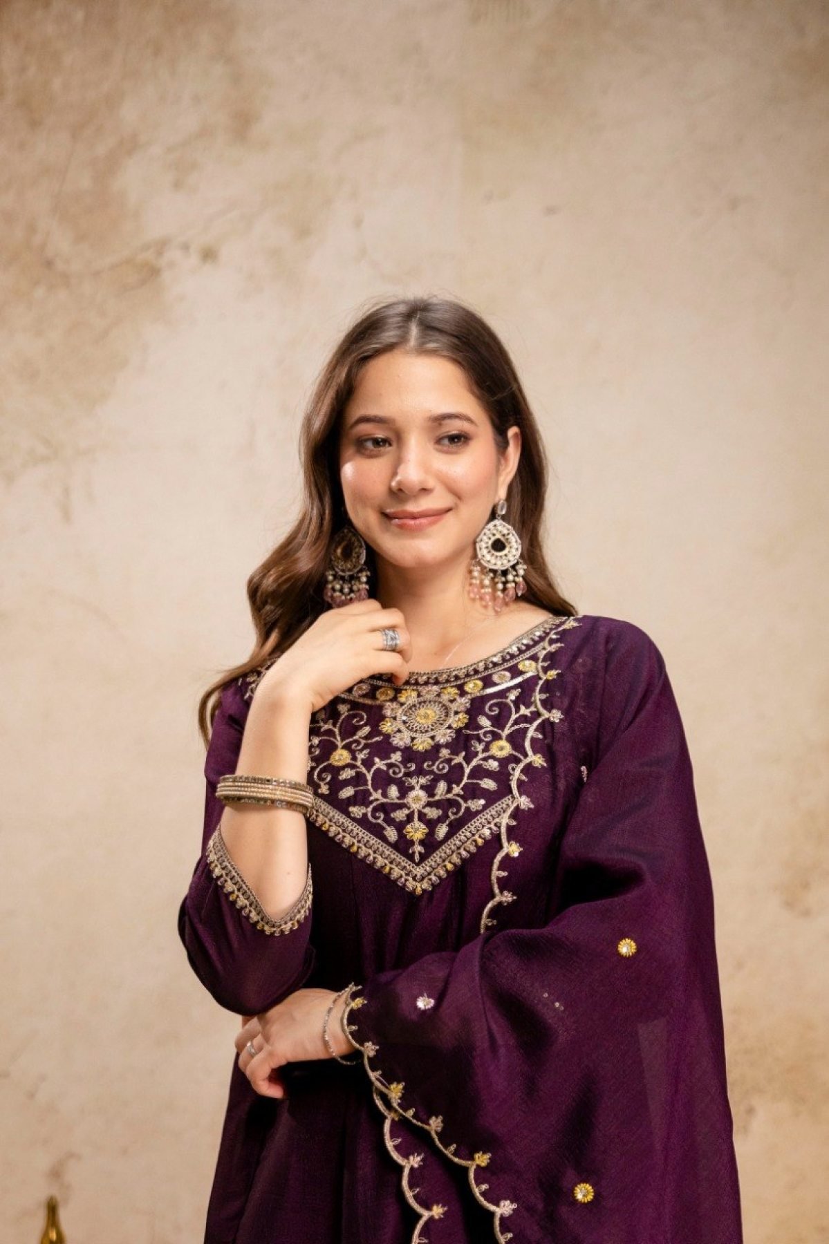 Elegant Vichitra silk Anarkali suit set with embroidery work, paired with matching pant and dupatta. Perfect for festive wear, small functions, and party occasions with a graceful flared look.