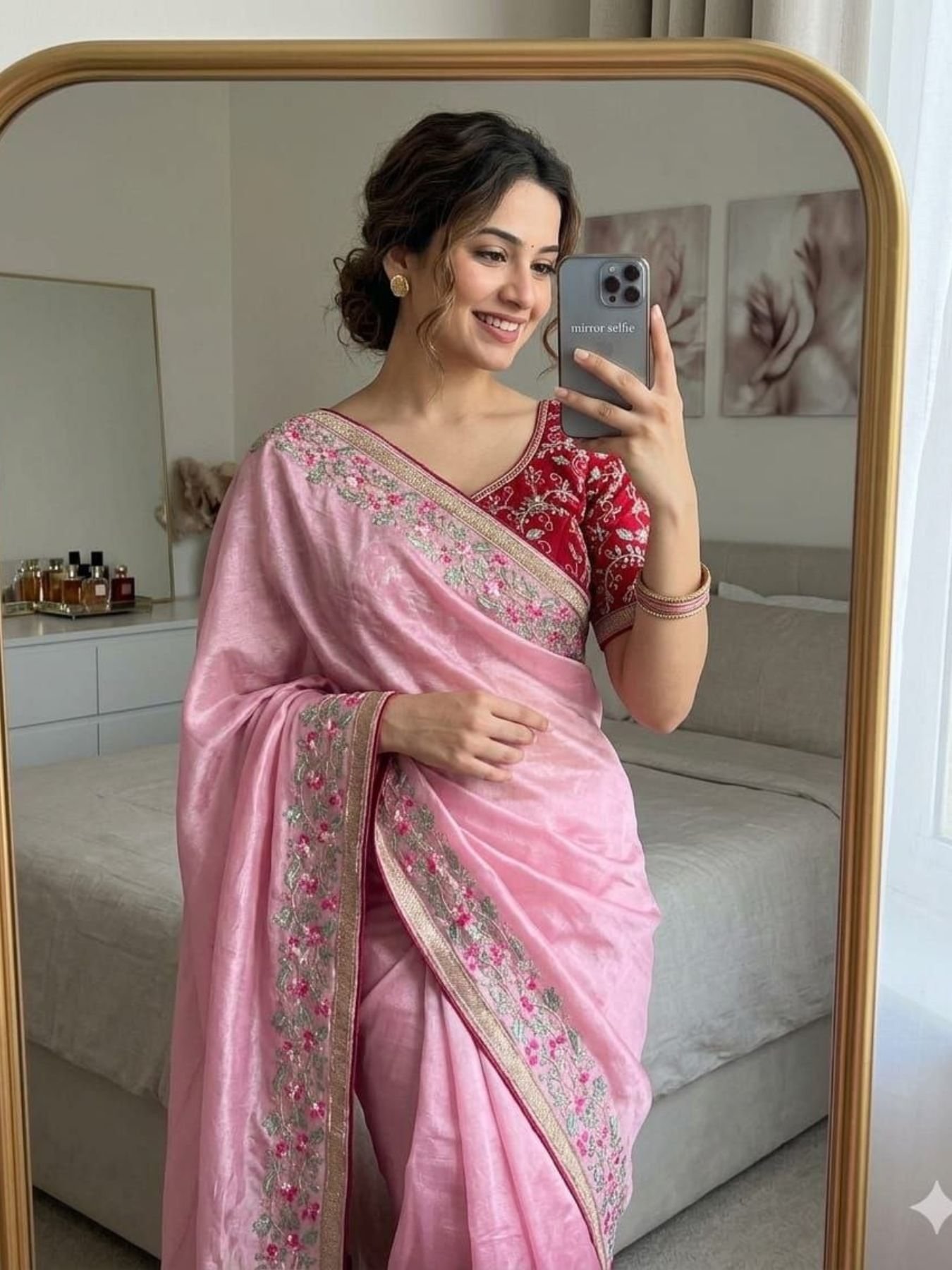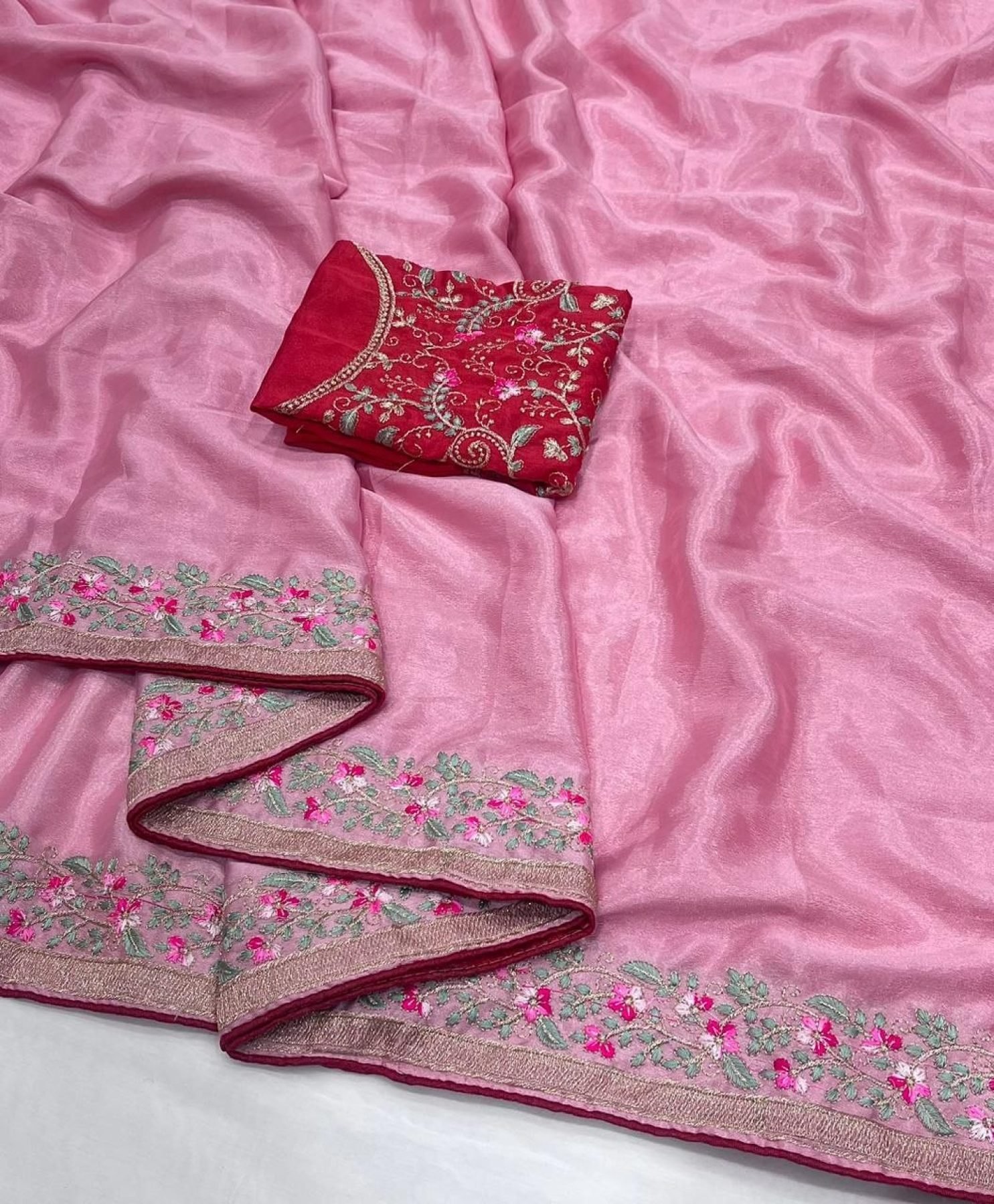 Elegant chinon silk saree featuring full embroidery work with beautiful floral design, paired with matching embroidered blouse. Perfect for festive, party, and wedding wear.