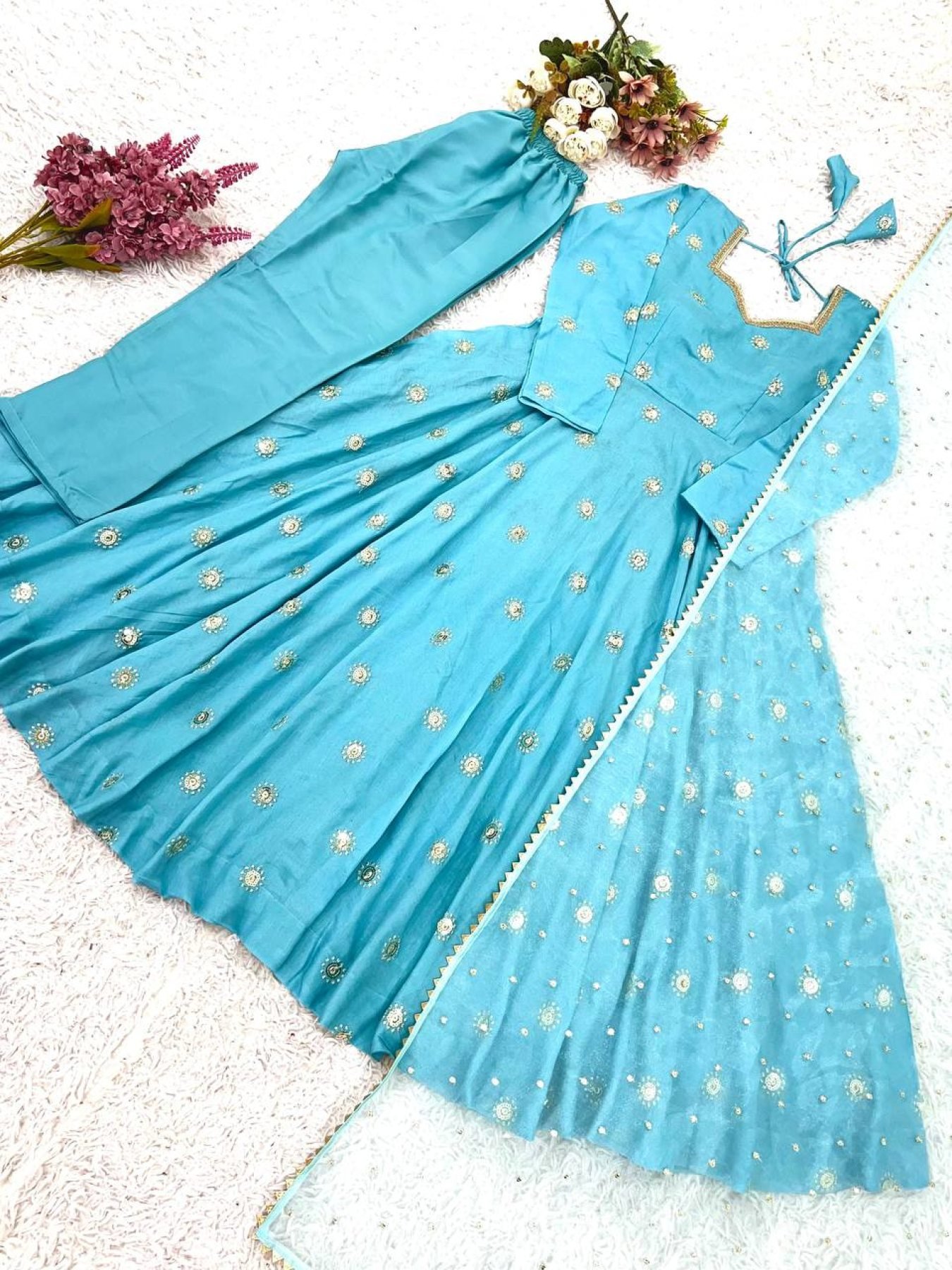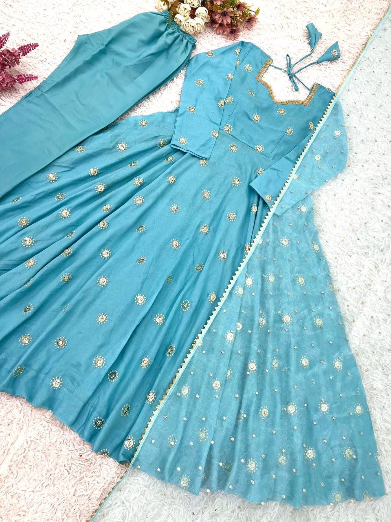 Budget Friendly Sky Blue Gown Suit Set for Wedding and Festive Wear