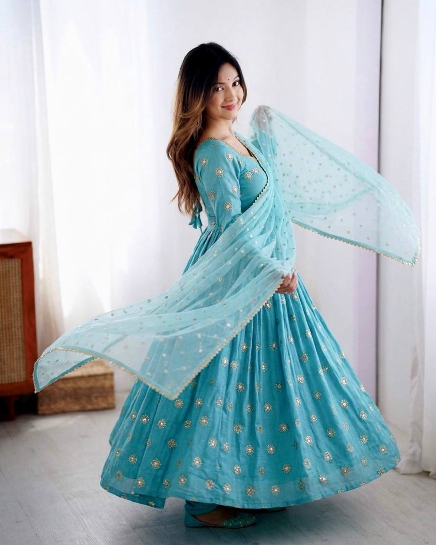 Elegant vichitra silk gown suit set featuring rich embroidery sequence work with graceful 3-meter flair, paired with comfortable pant and stylish tissue dupatta. Perfect for festive, wedding, and party wear with a premium ethnic look.
