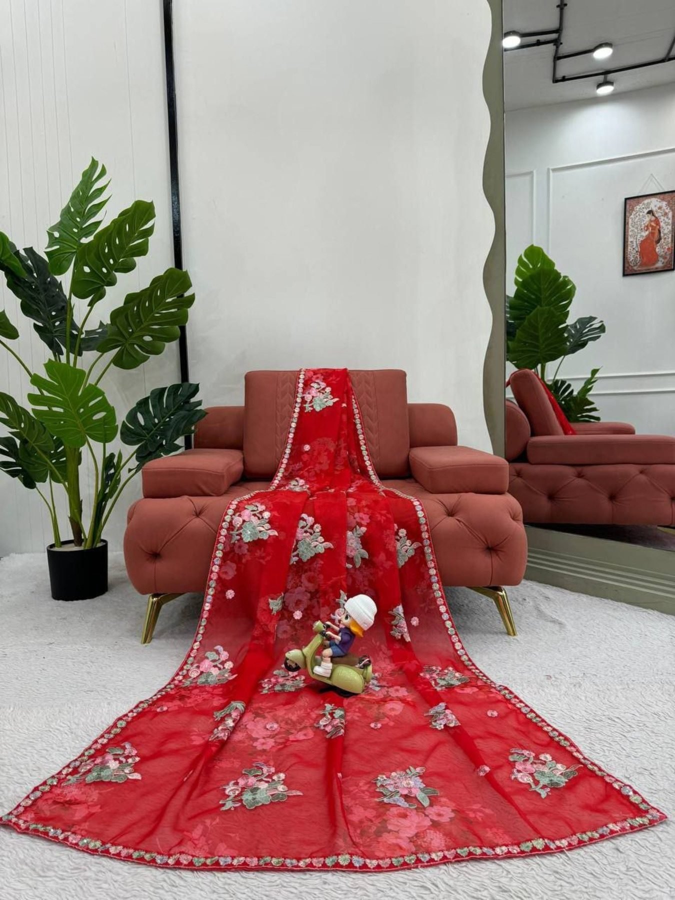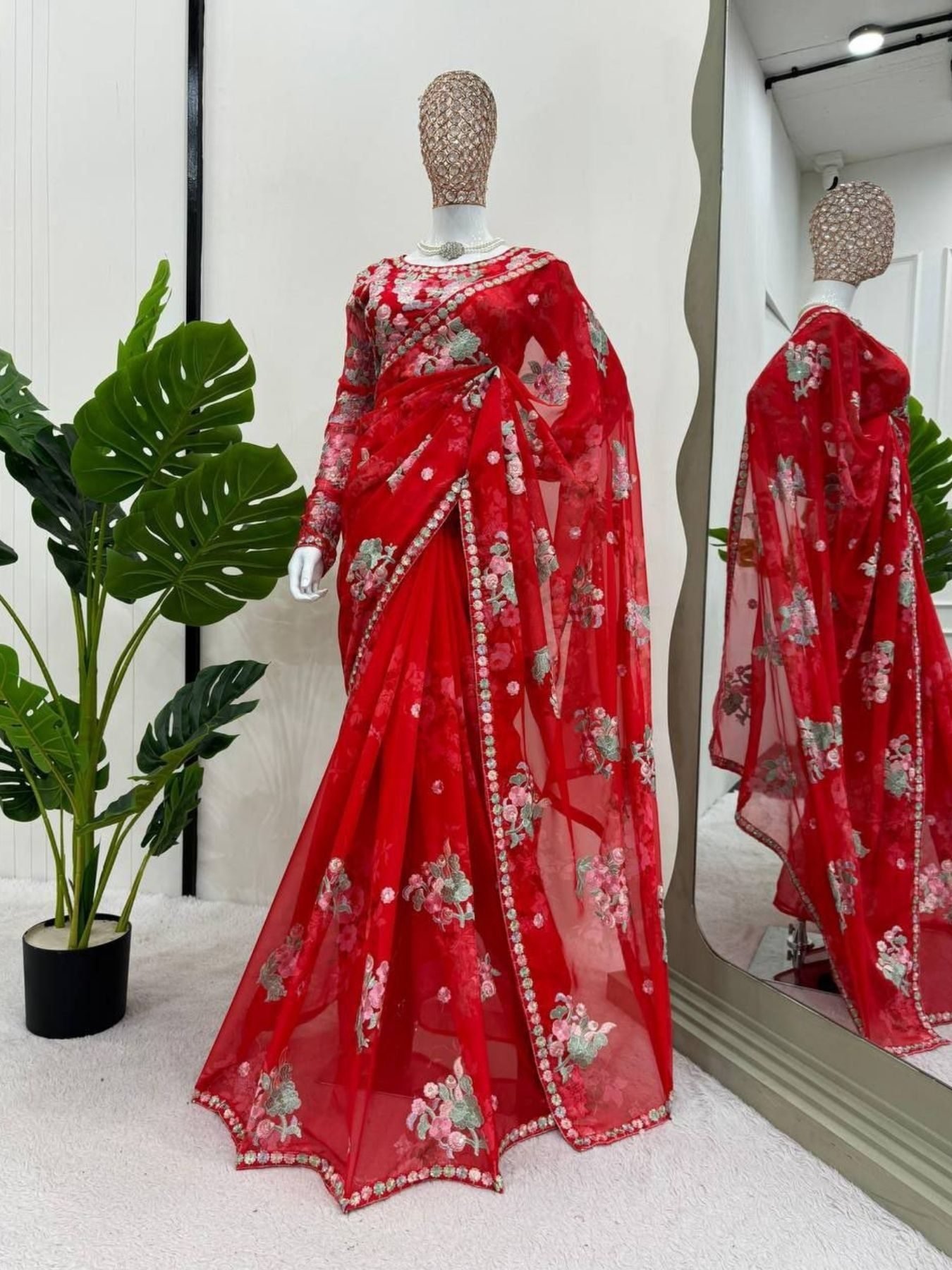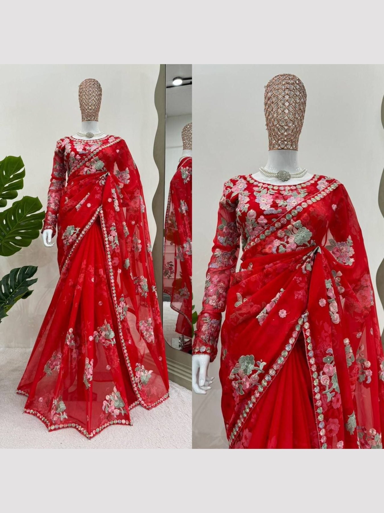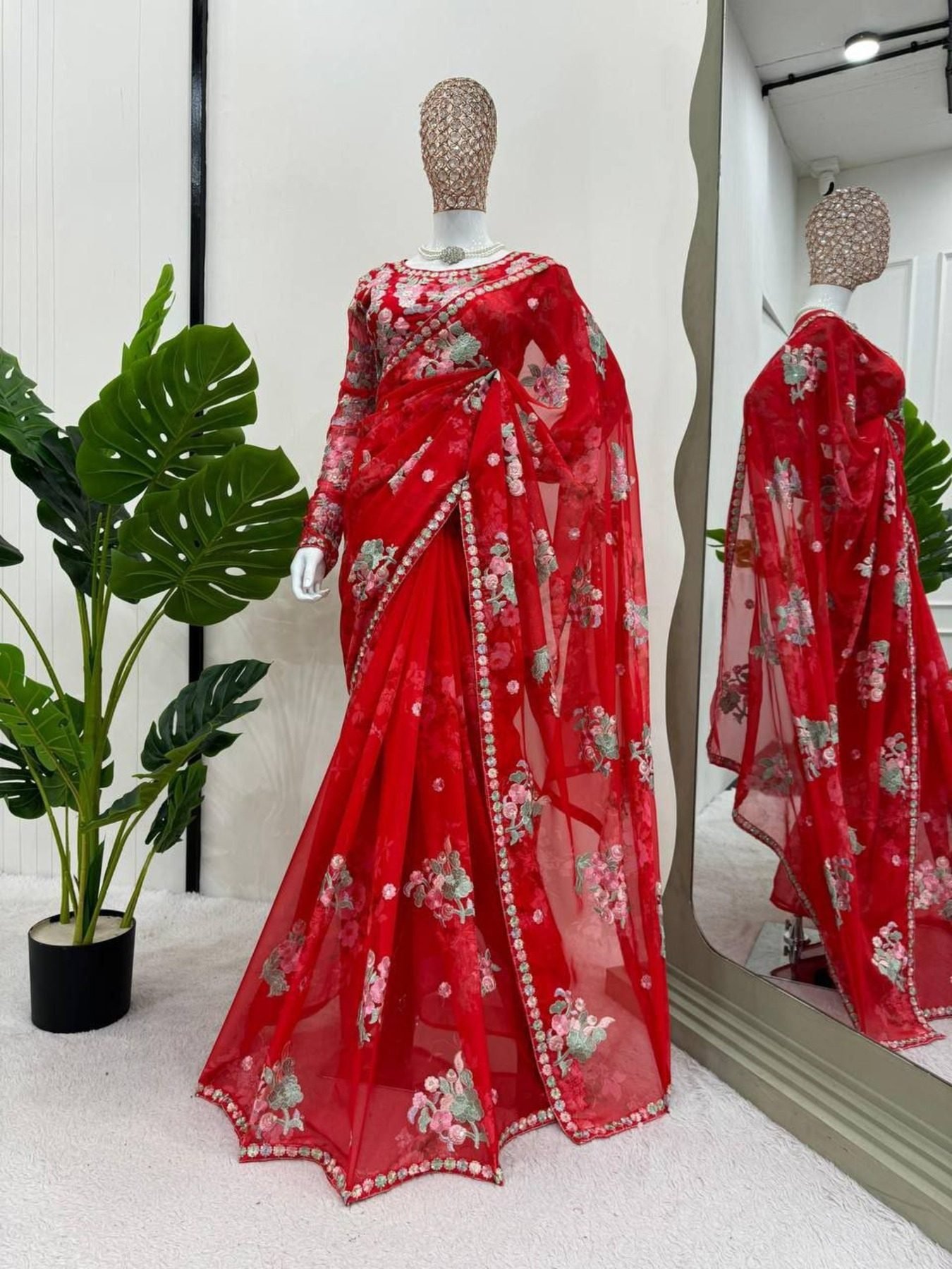 Buy Designer Heavy Georgette Red Color Saree with Sequence work