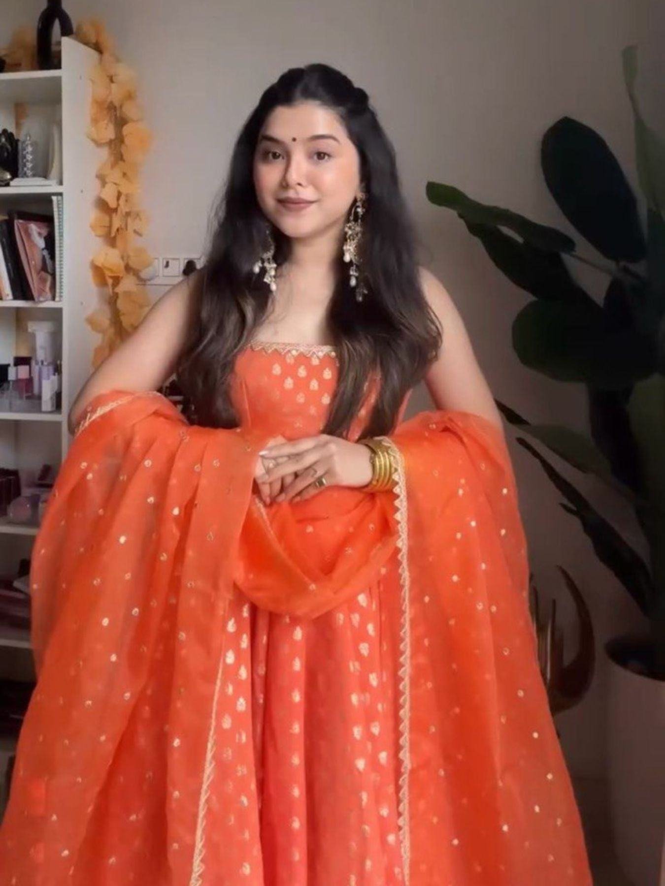 Buy Elegant Orange Jacquard Silk Anarkali Gown with Dupatta Online for Party Wear
