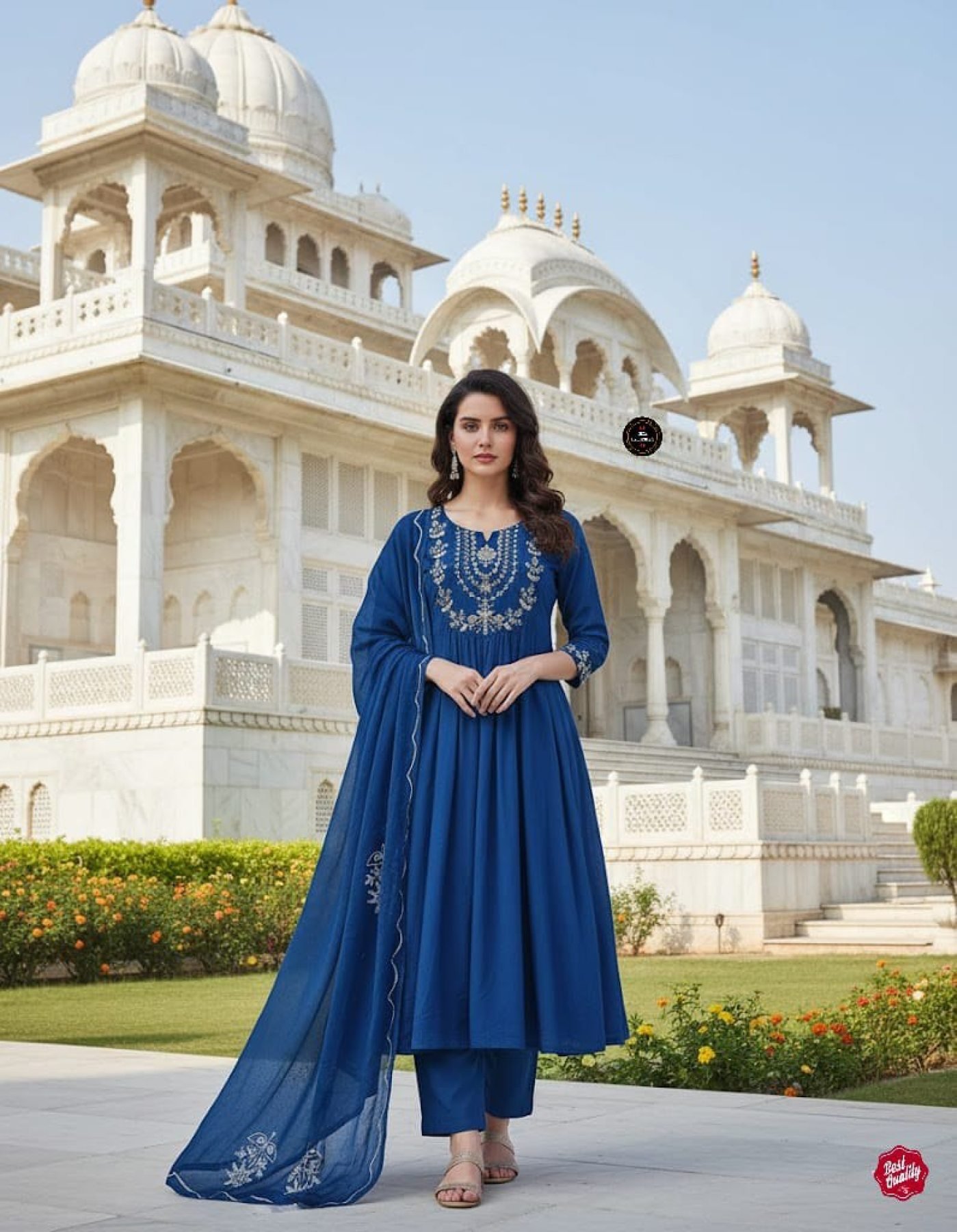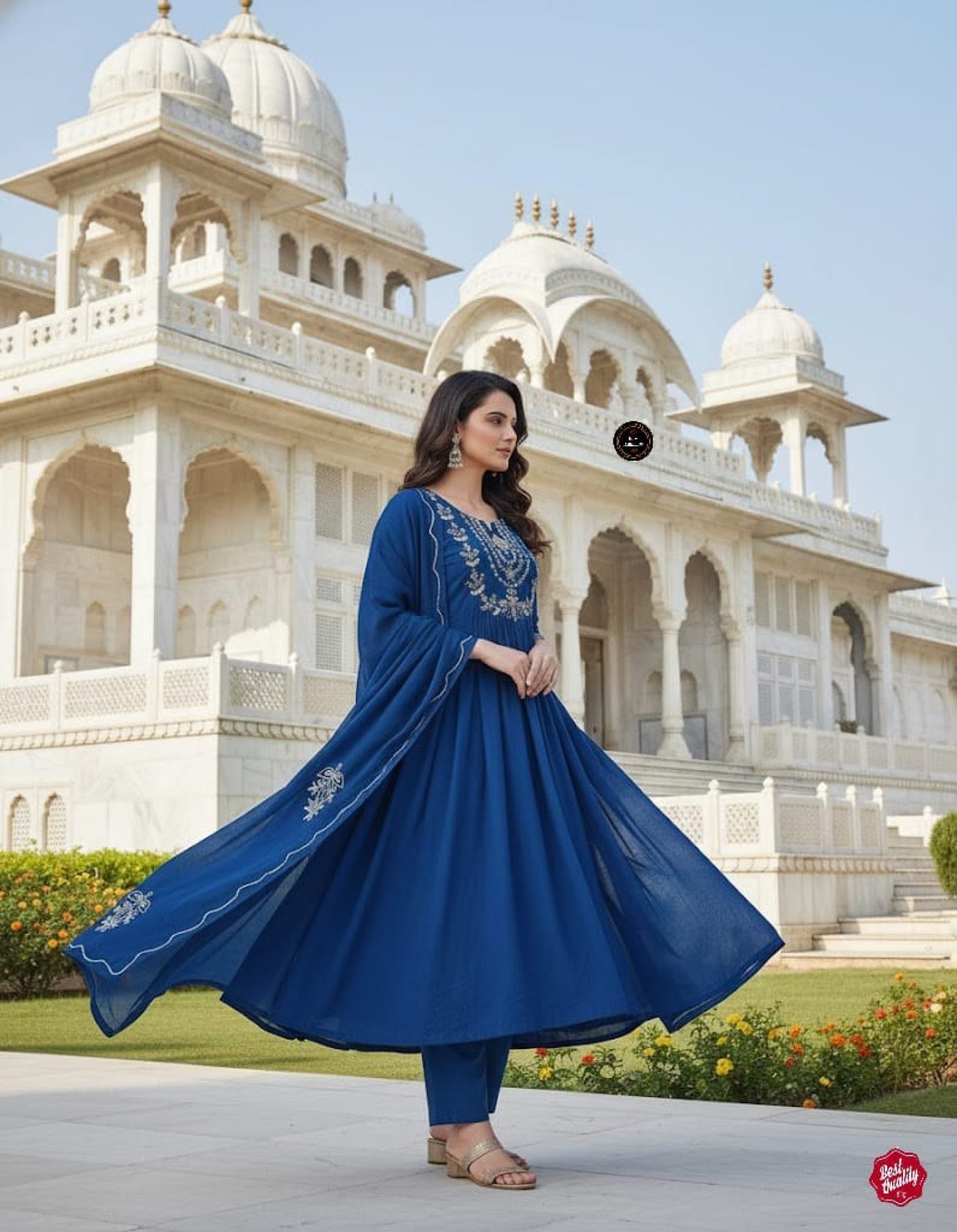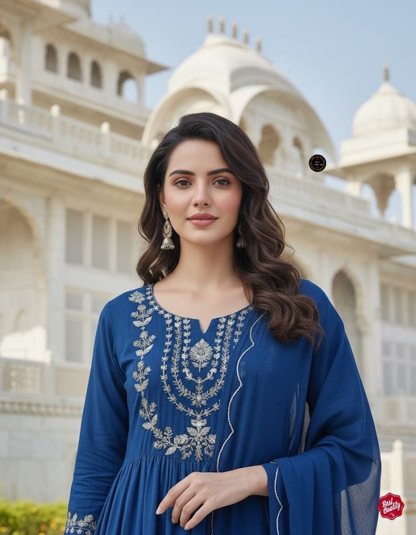 Captivating Blue Cotton Anarkali Kurti Set with Pant Malmal Dupatta Perfect for Festive Gatherings