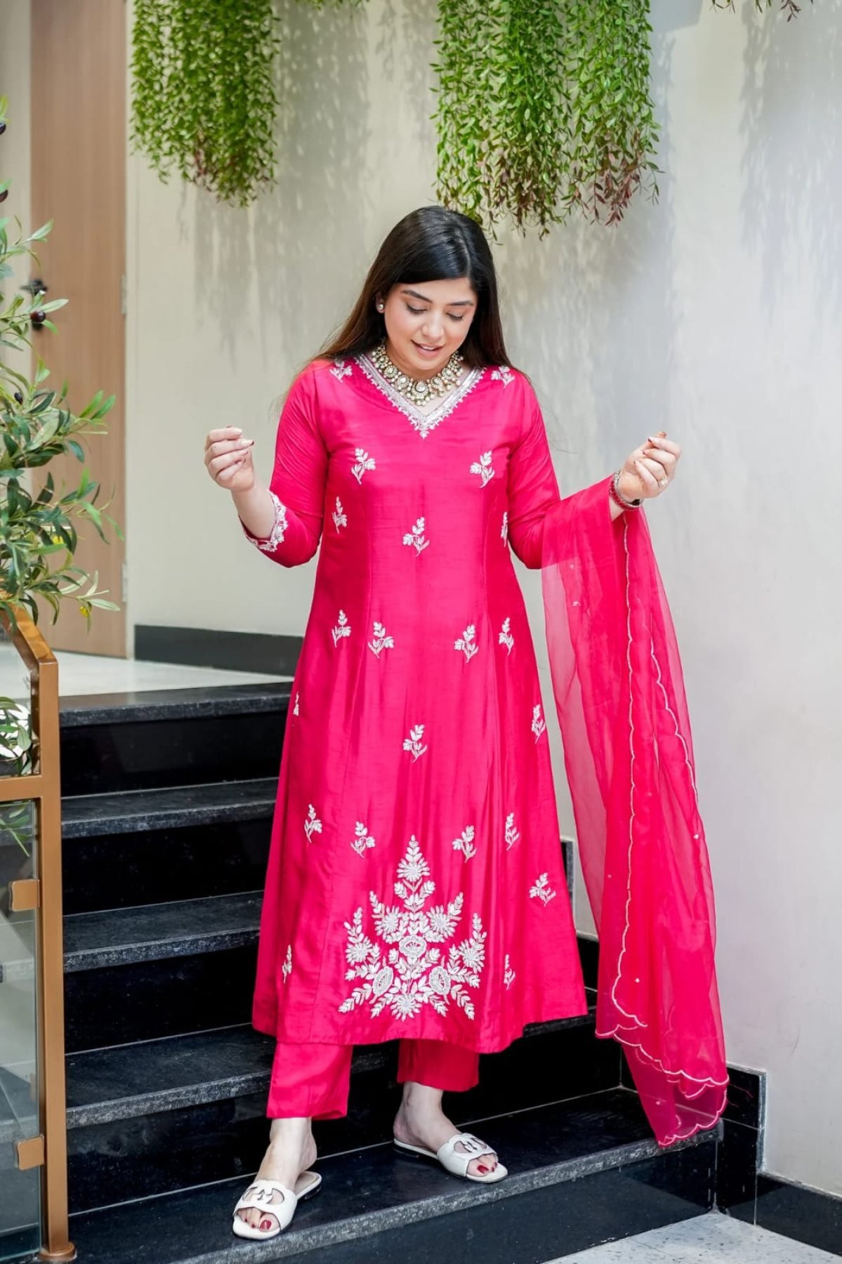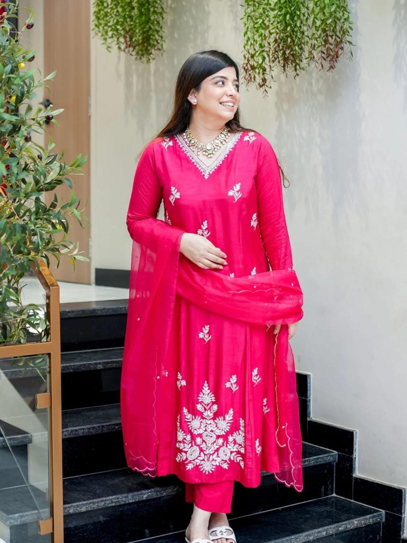 Captivating Rani Pink Embroidered Muslin Salwar Suit with Dupatta