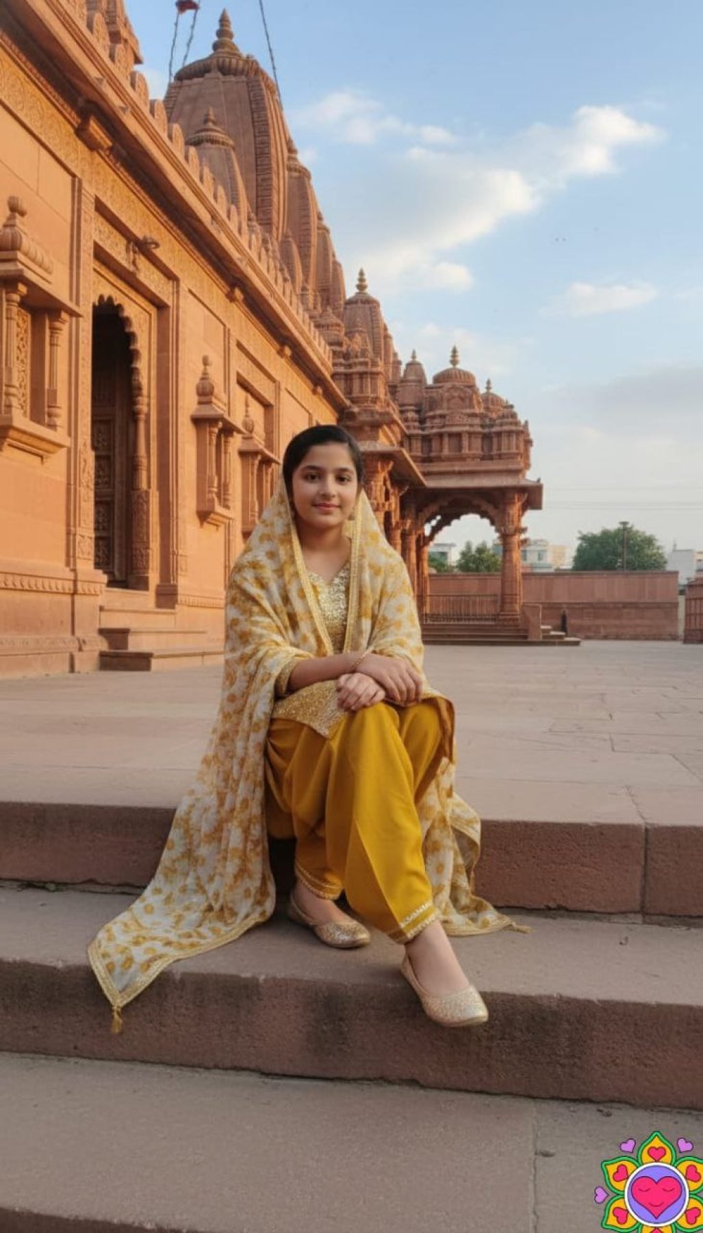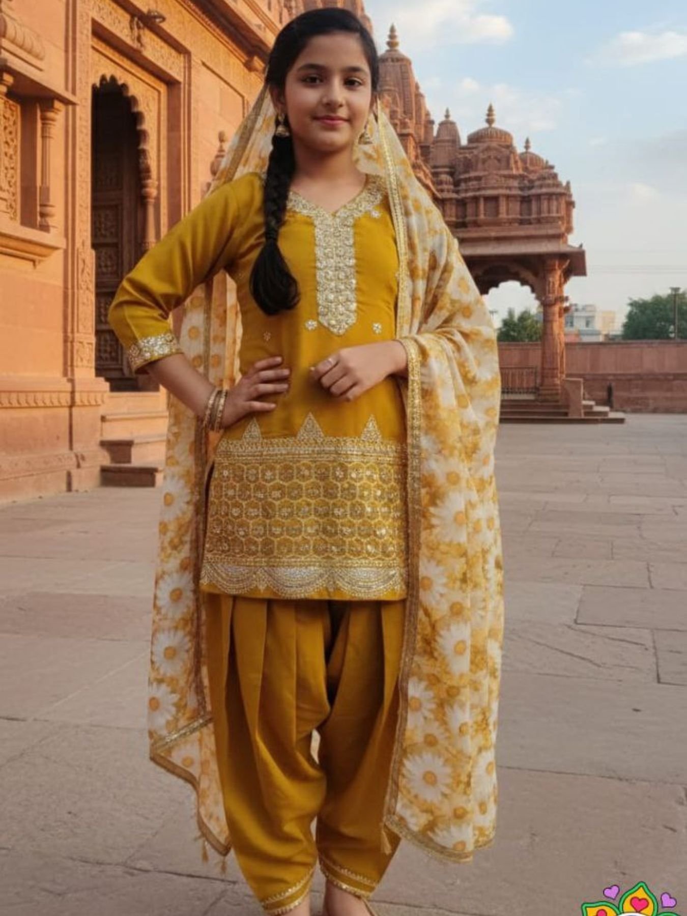 Elegant kids silk crepe suit set featuring floral embroidered kurta with pant and digital printed dupatta. Perfect for festive and party wear.