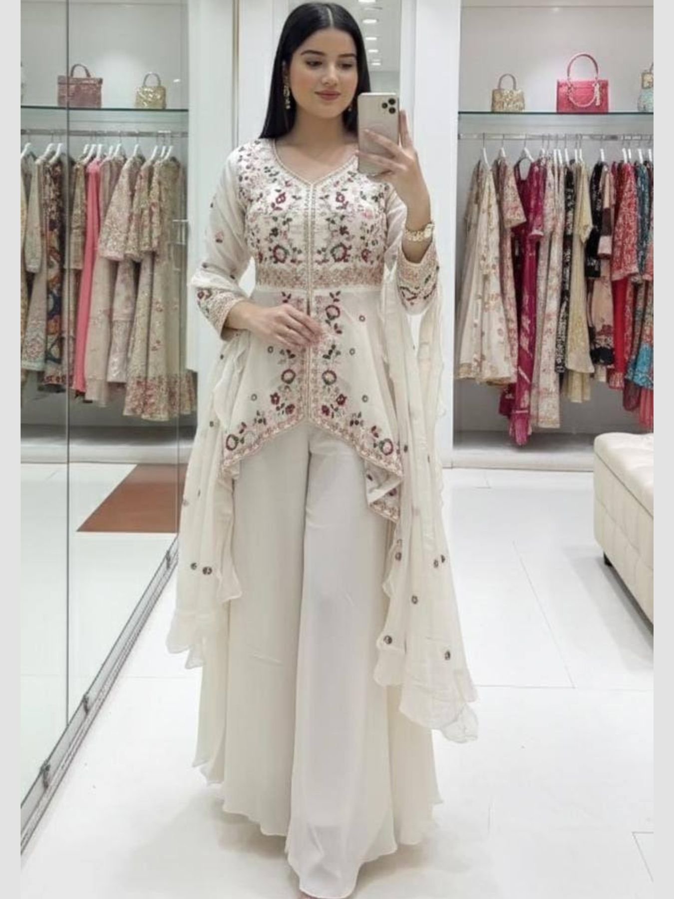Celebration Wear White Rangoli Silk Embroidery Suit Matching Dupatta