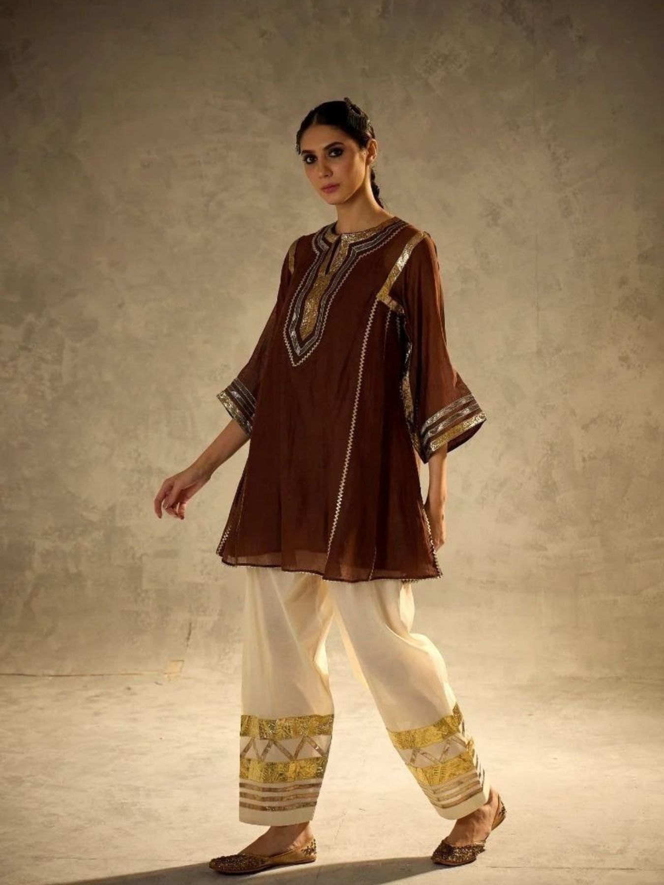 The set is paired with a matching Chanderi bottom designed with coordinated embellishment and Gopatti lace work, giving the outfit a graceful and complete appearance. The bottom comes with an elastic rubber waistband for a flexible and comfortable fit.