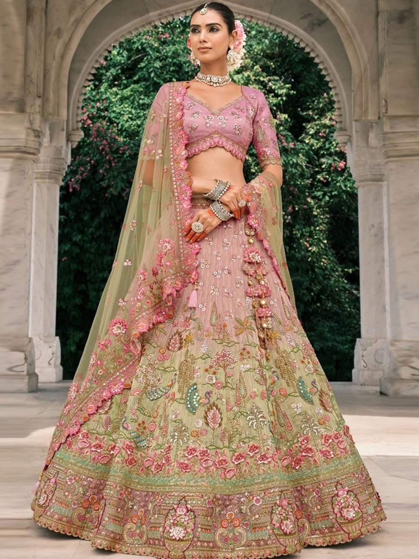 Charismatic Green And Pink Silk Lehenga with Sequence Work for Bridal Functions