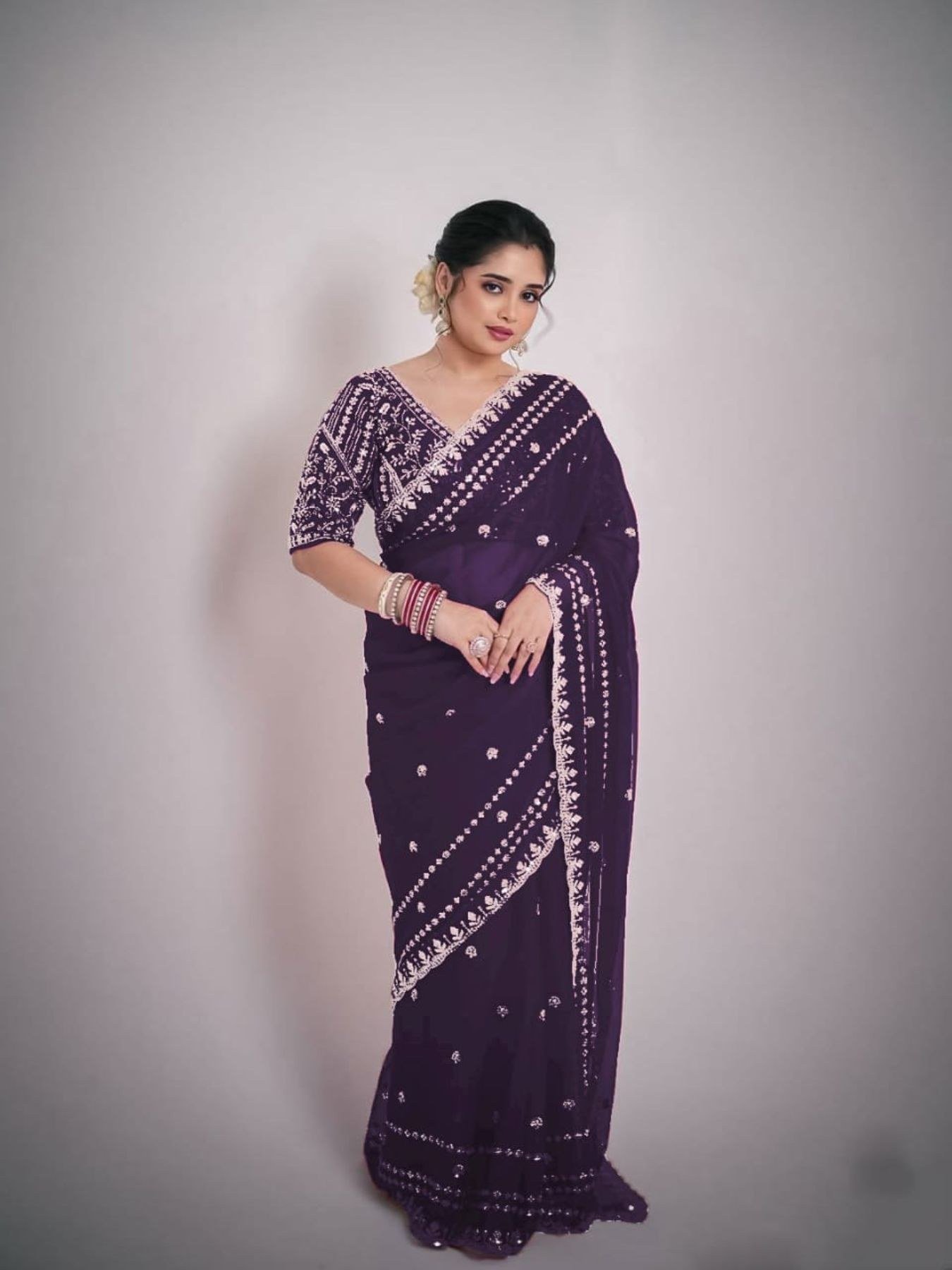Elegant designer saree crafted in soft space silk featuring sequins and zari embroidery work. Paired with a contrast red blouse, this saree offers a rich and modern festive look, perfect for parties, weddings, and special occasions.