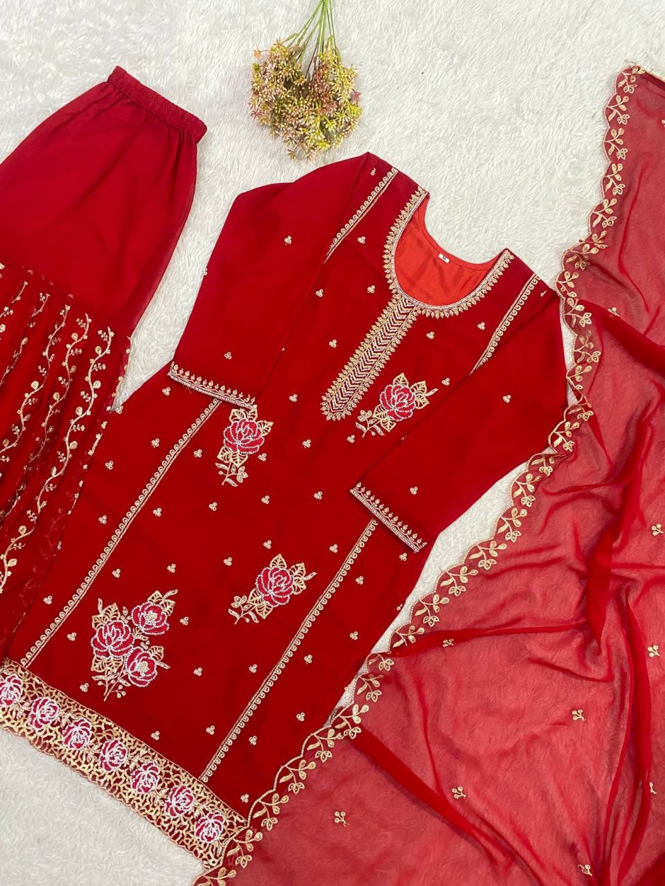 Charismatic Red Comfortable Gharara Set with Rich Embroidery Work