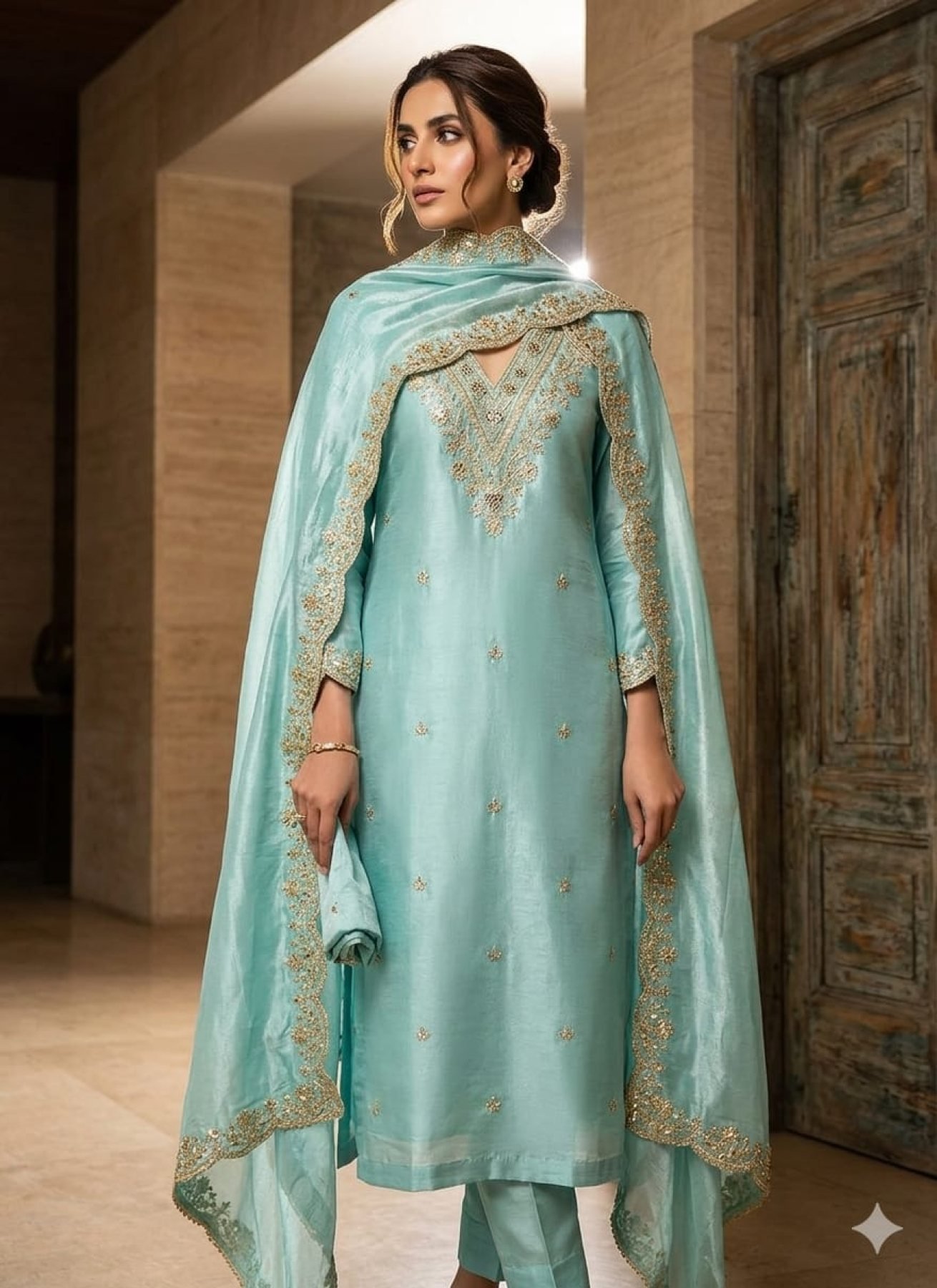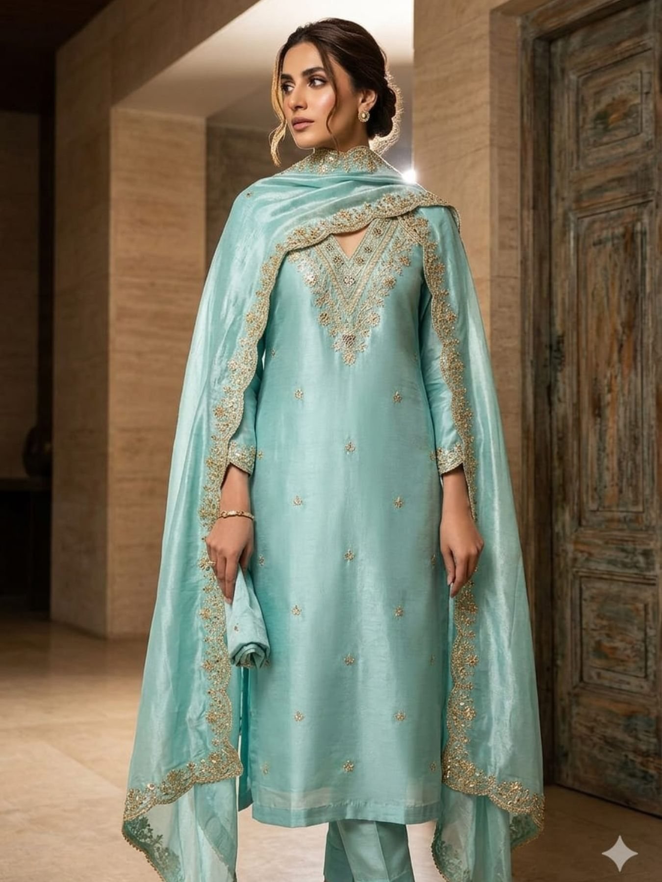 Charismatic Sky Blue Antique Bronze Silk Kurta Set with Zari and Sequin Embroidery