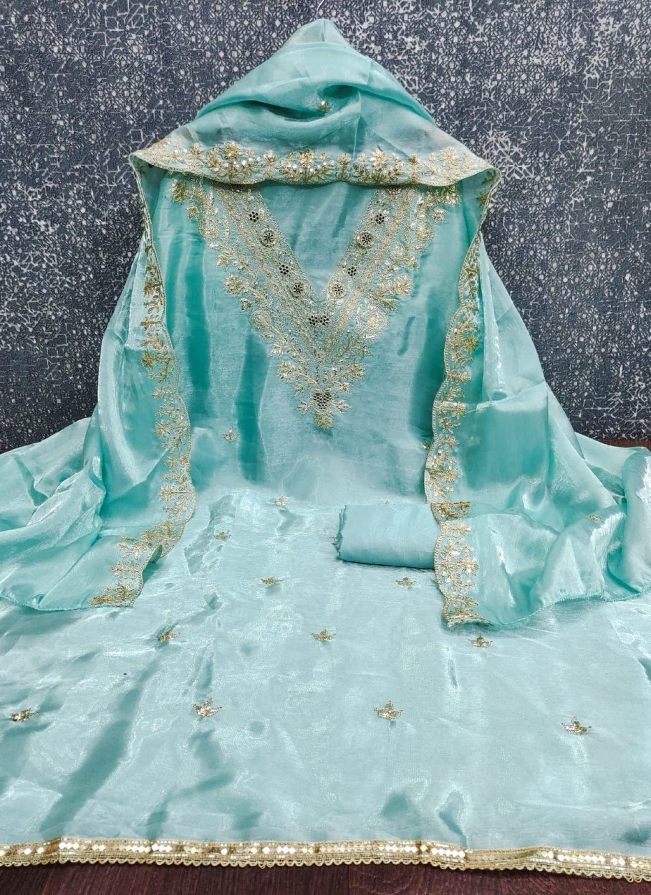 Affordable designer suit material in Zimmi Choo fabric with kodding sequins embroidery, paired with santoon bottom and matching dupatta. Ideal for stitching into stylish ethnic wear.