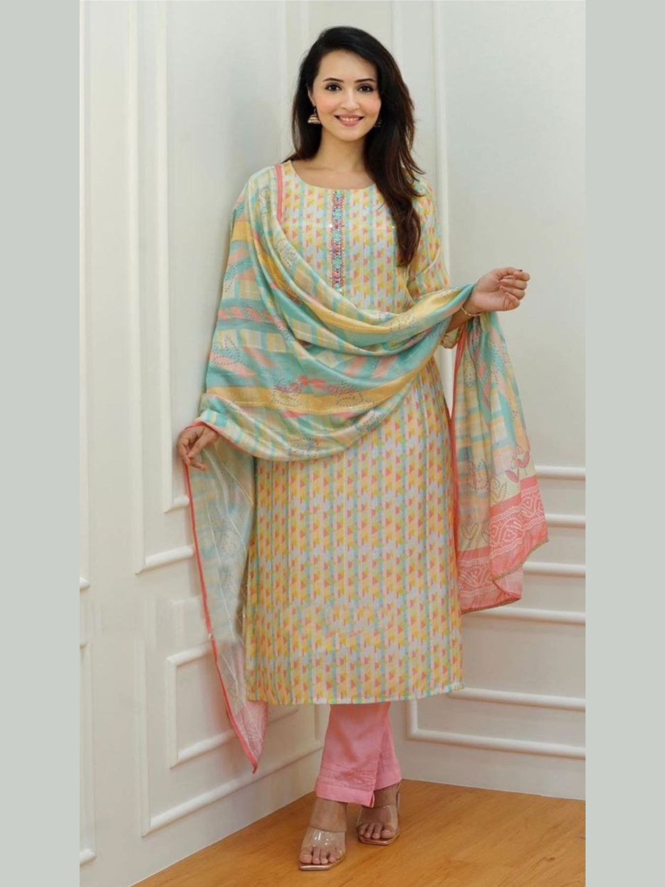 The matching printed Maslin dupatta with full sequence work adds a graceful drape.