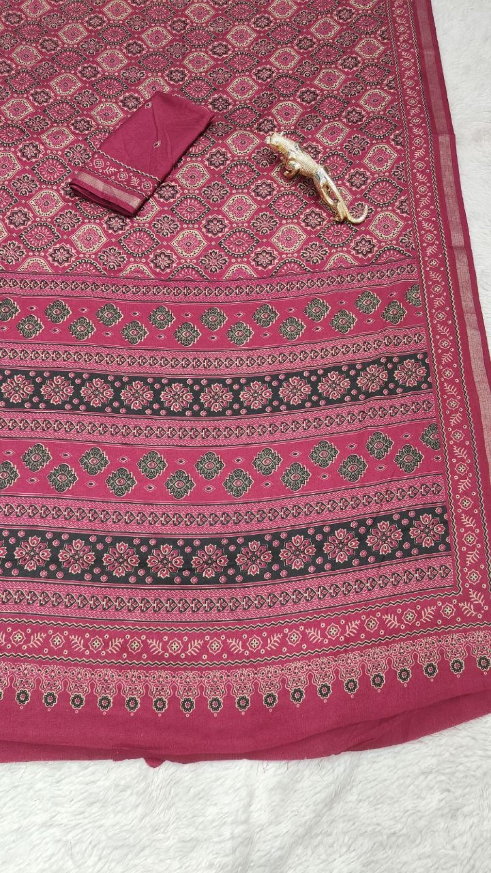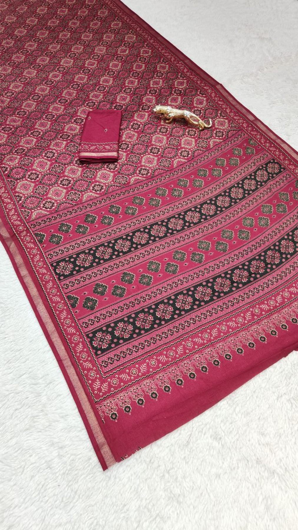 mal cotton saree featuring traditional all-over print with a stylish contrast border. Lightweight and comfortable, perfect for daily wear and casual ethnic styling.