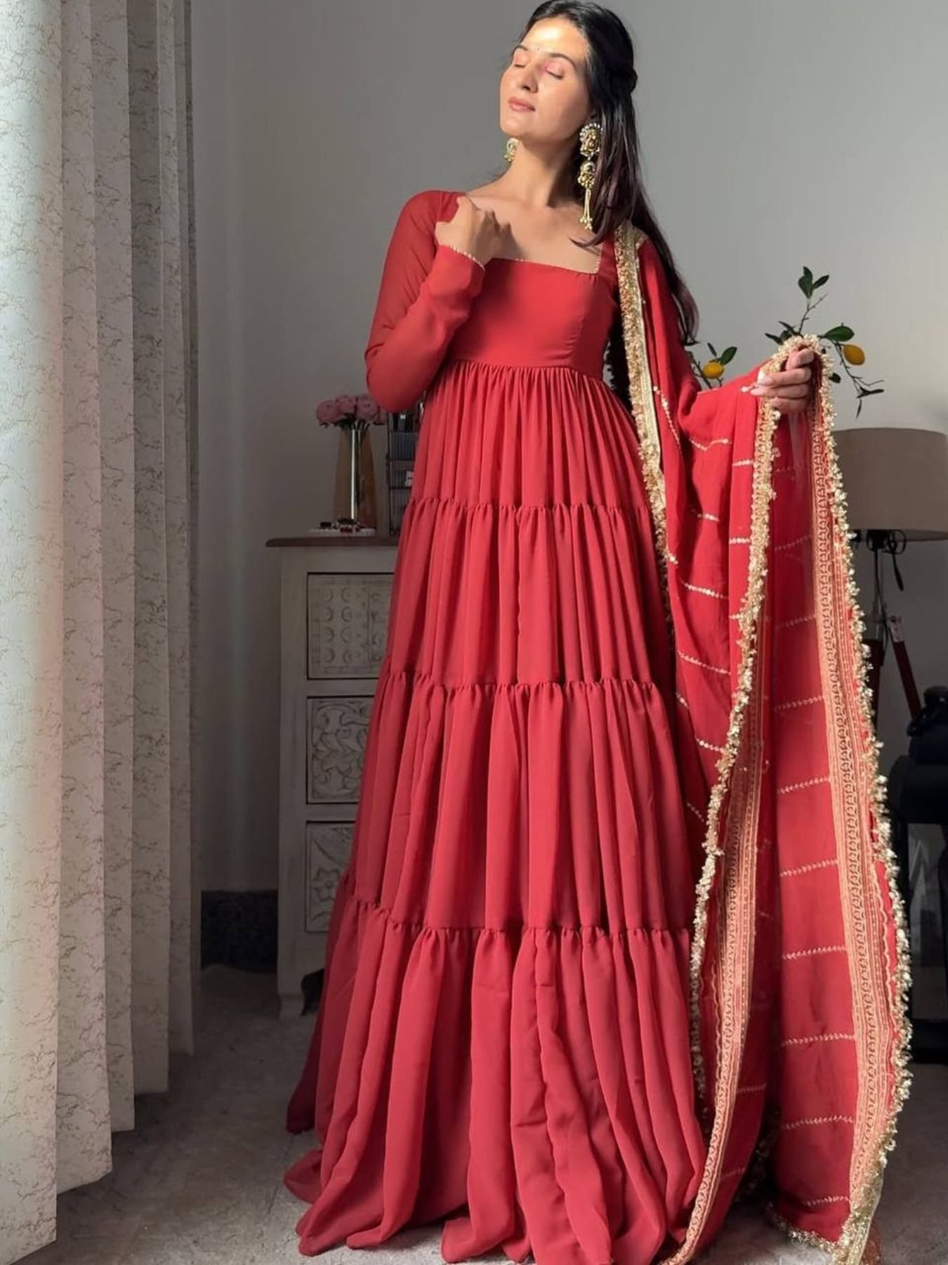 Stunning faux georgette ruffle Anarkali crafted with a heavy 15-meter grand flair for a royal, flowy look.