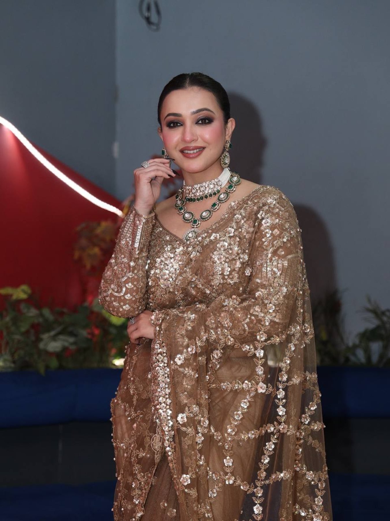 Graceful soft net saree featuring beautiful sequins and zari embroidery with a scallop border design. Paired with a designer sequins work blouse, this saree offers a majestic and elegant look, perfect for weddings, receptions, and festive occasions.