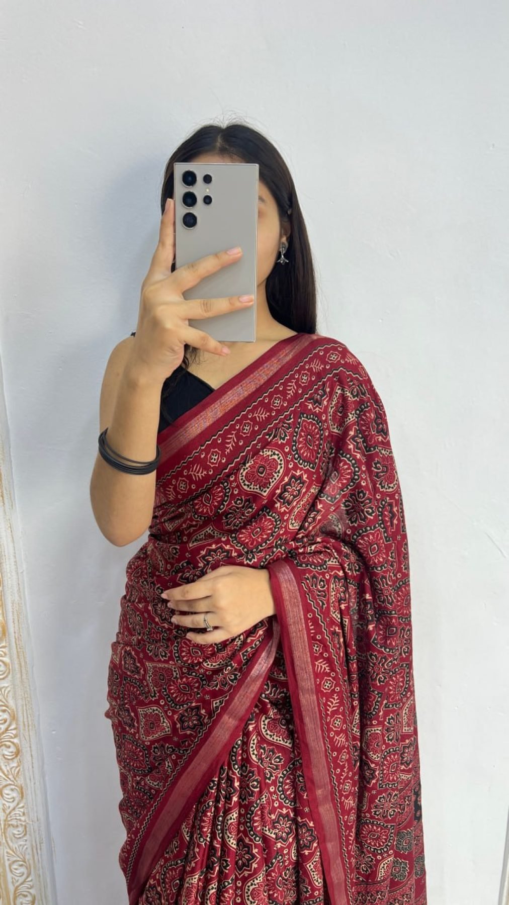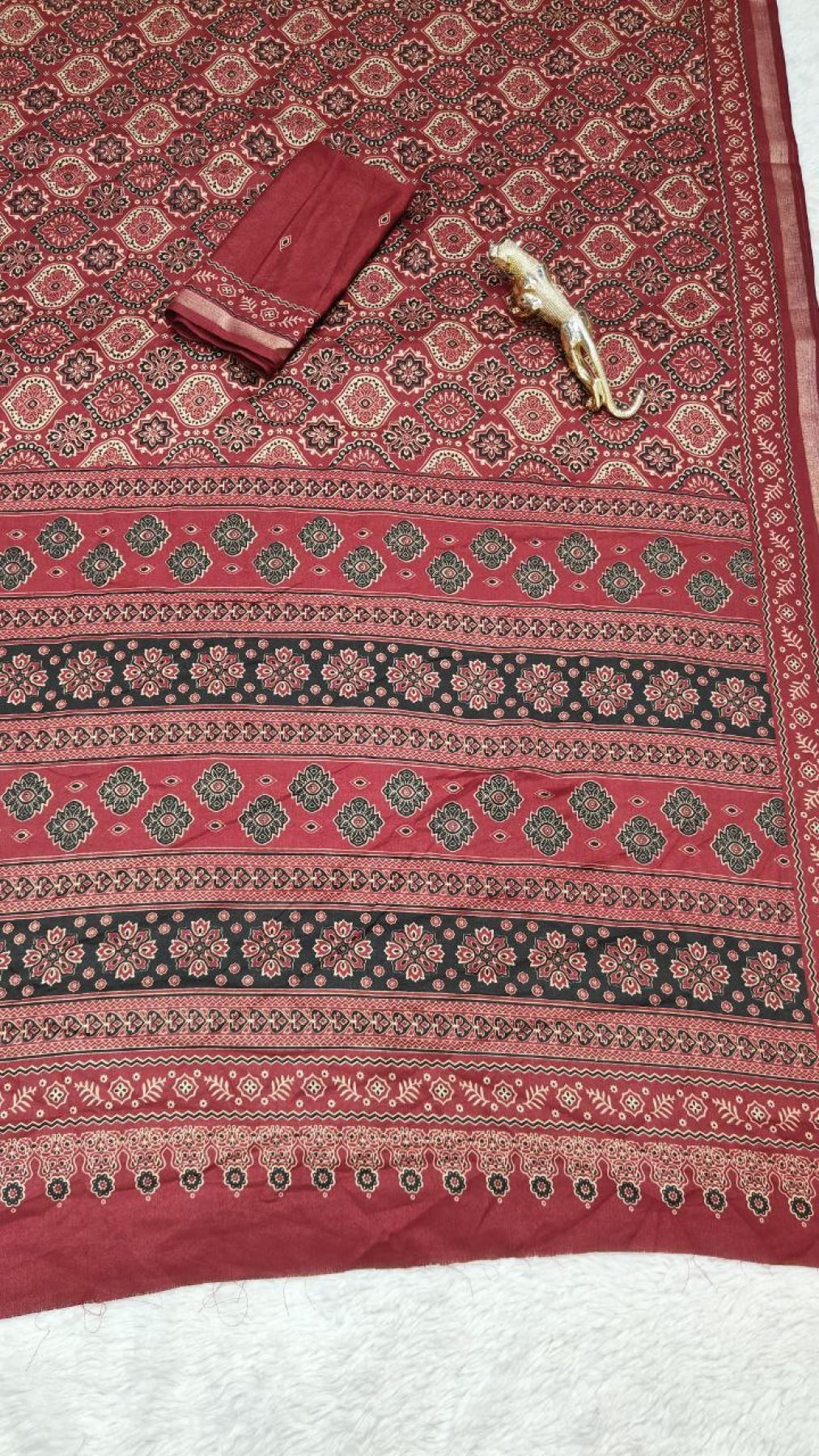 • Vibrant Maroon Mal Cotton Saree with Ethnic Print and Soft Texture