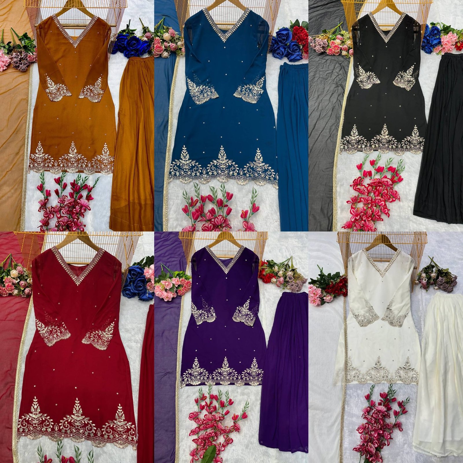 Elegant fox georgette suit set featuring beautiful embroidery work on top, paired with comfortable plazzo and stylish lace border dupatta. Perfect for festive, daily wear, and budget-friendly party wear with a classy ethnic look.