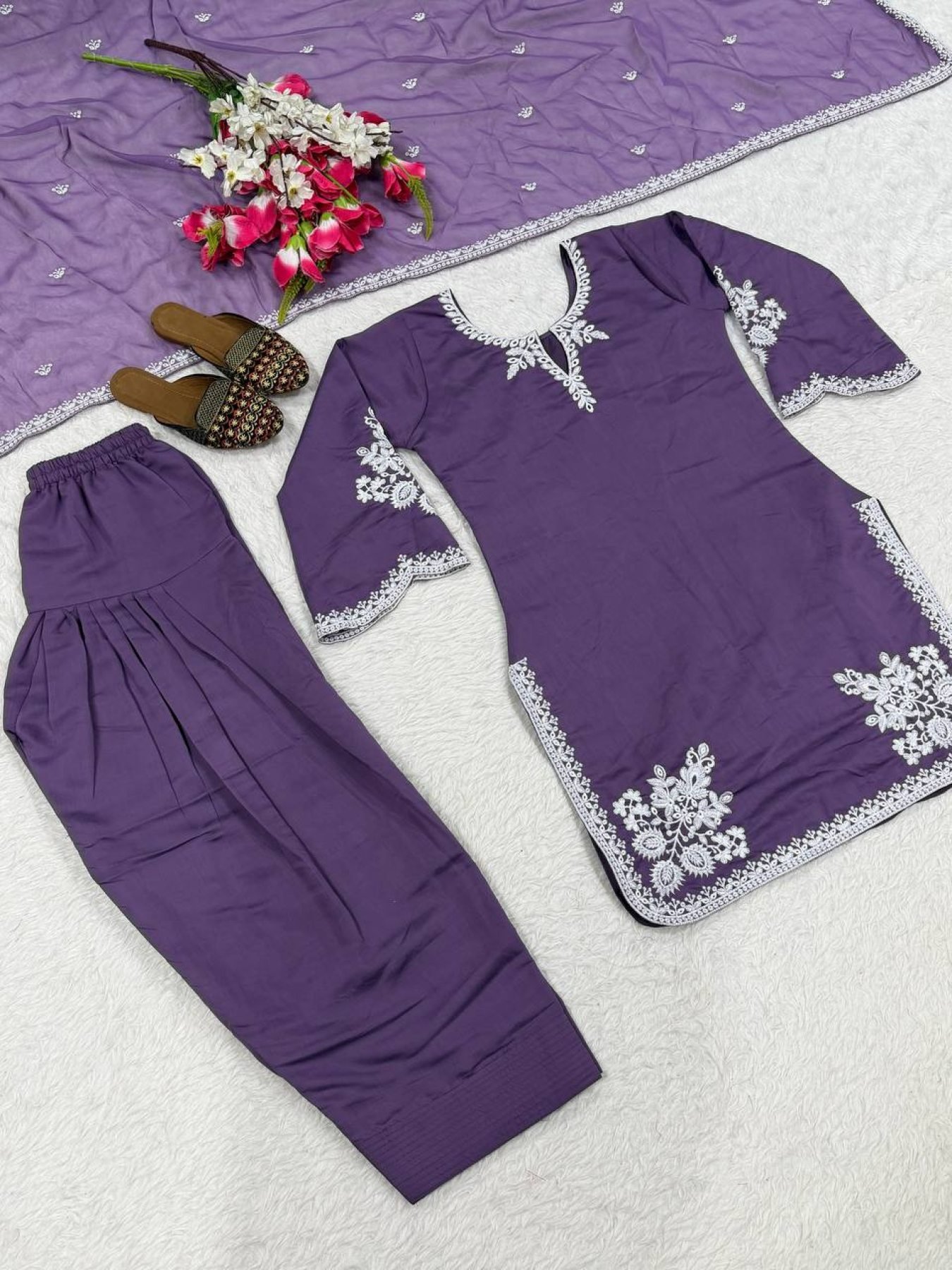 Designer party wear farshi salwar suit set crafted in heavy Roman cotton with elegant embroidery work. Paired with matching farshi salwar and embroidered tabby organza dupatta for a graceful festive and wedding-ready look.