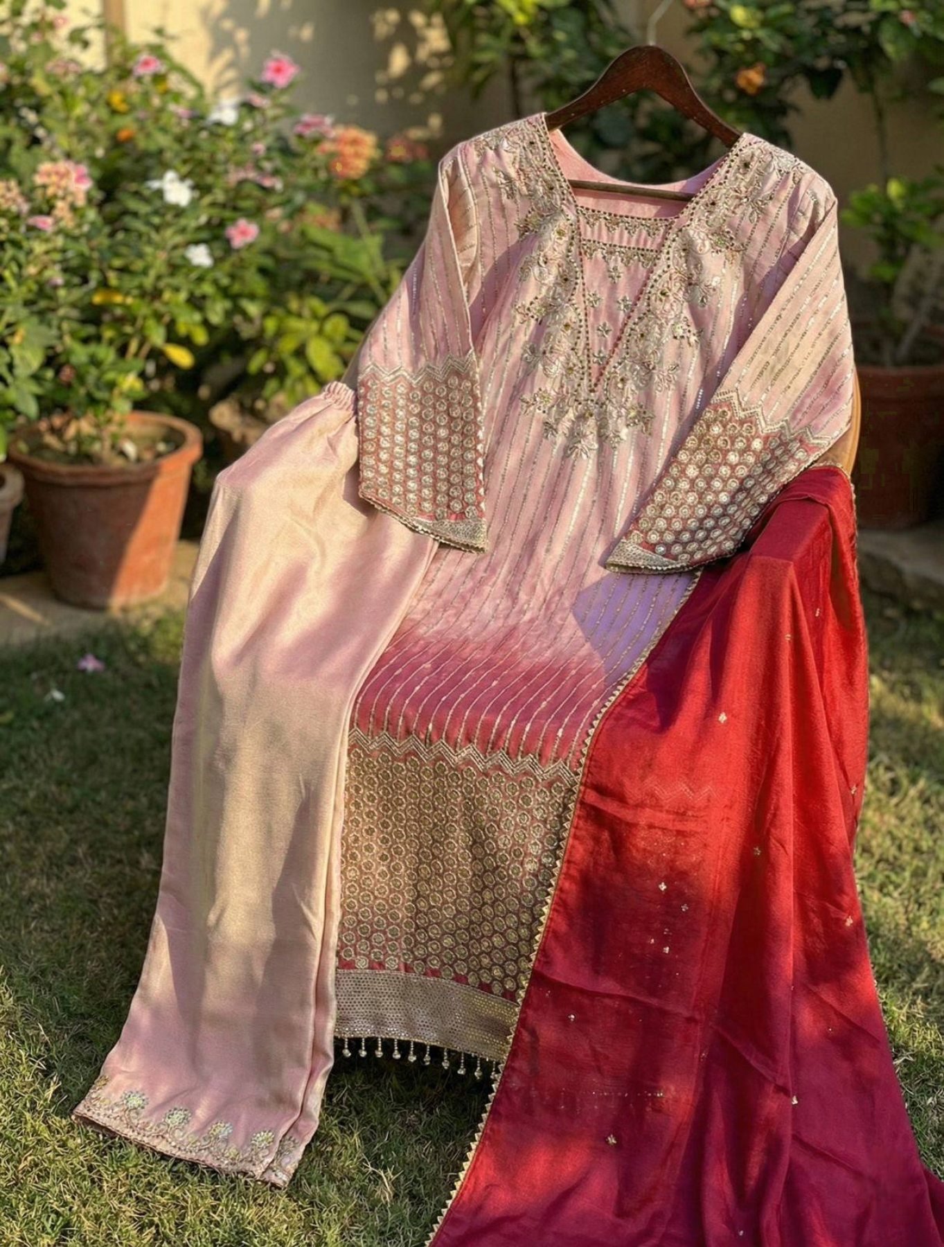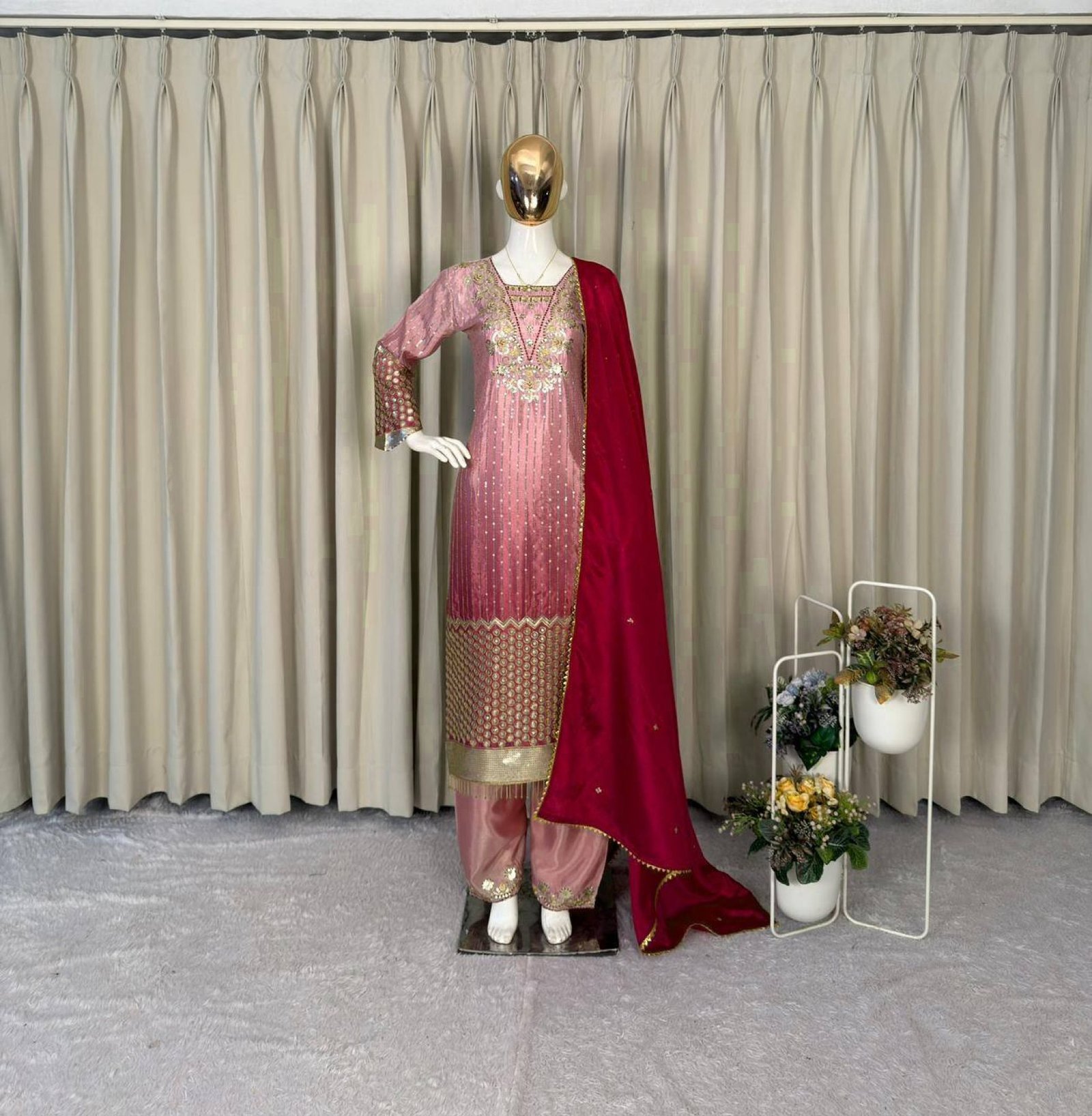 Classy Peach Chinnon Kurta Pant Set with Sequins Work for Women