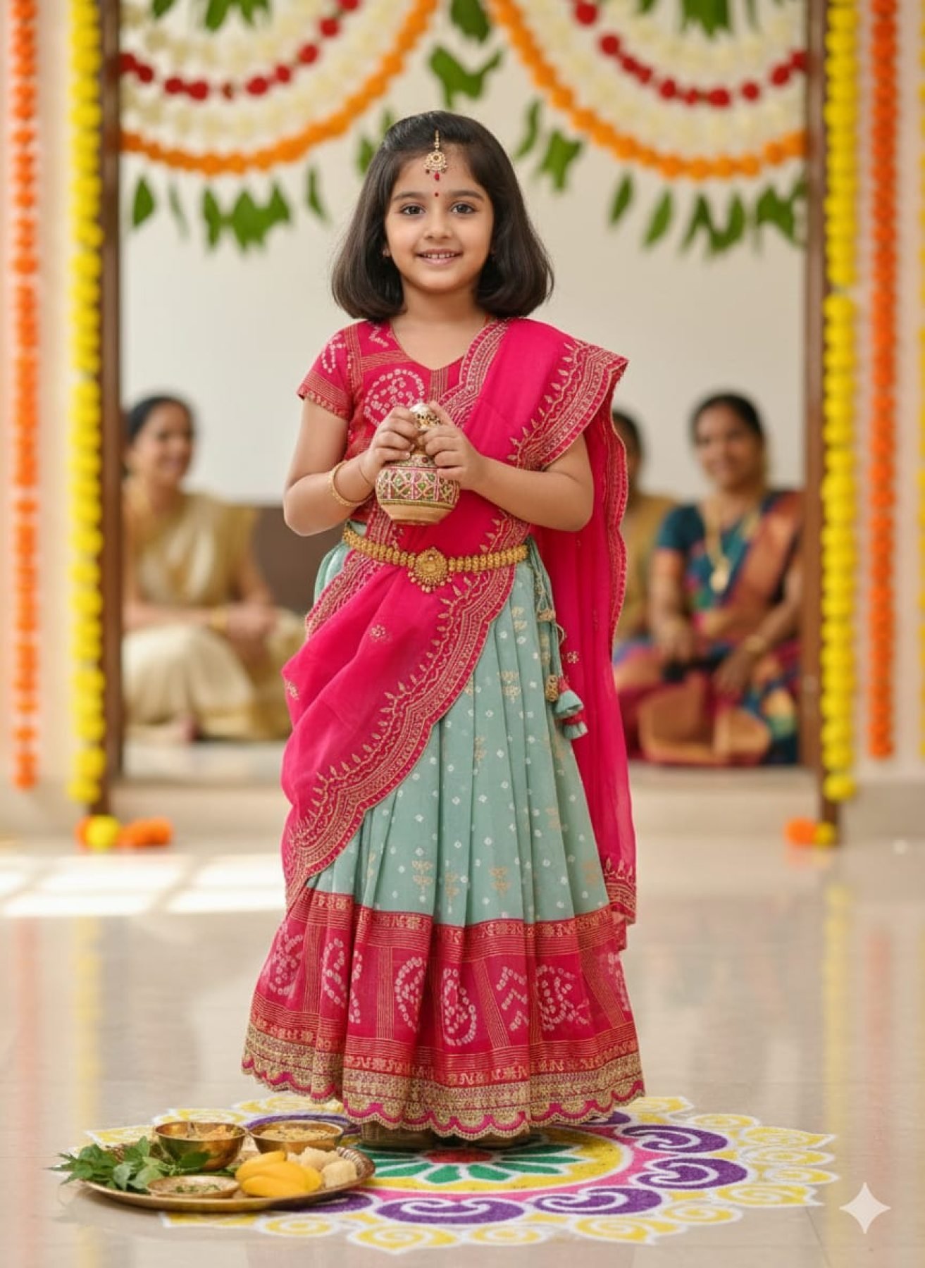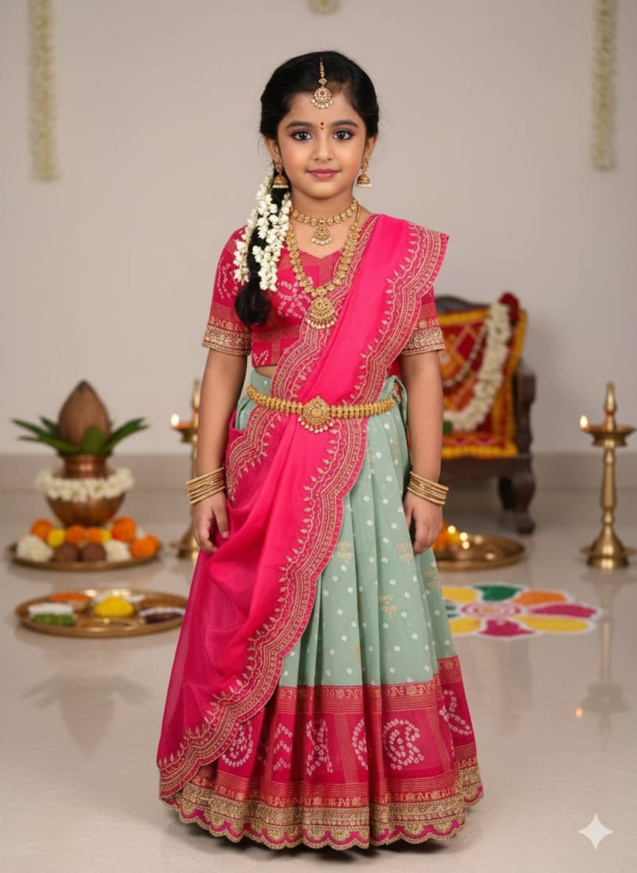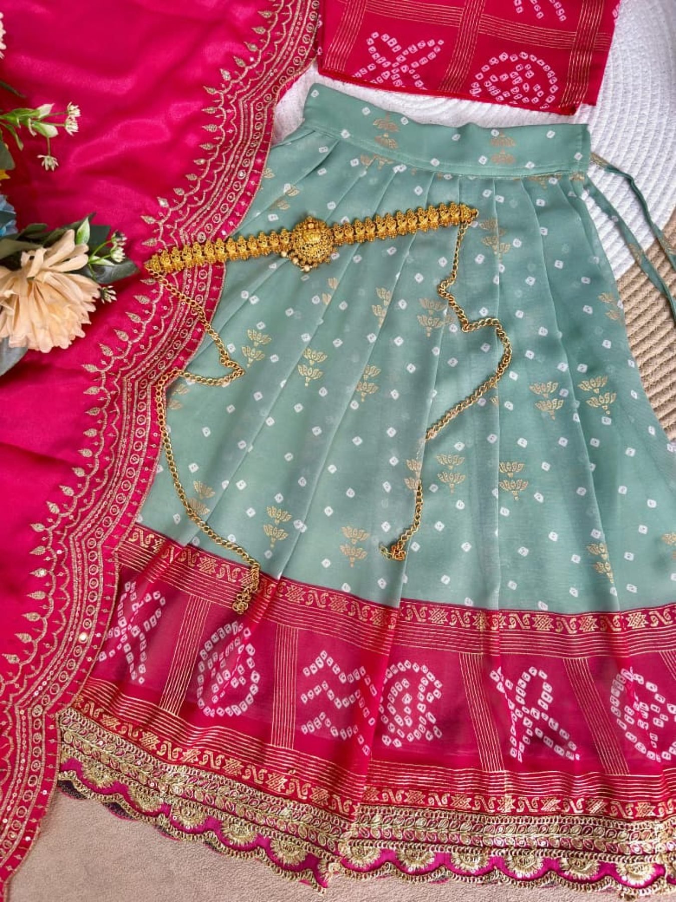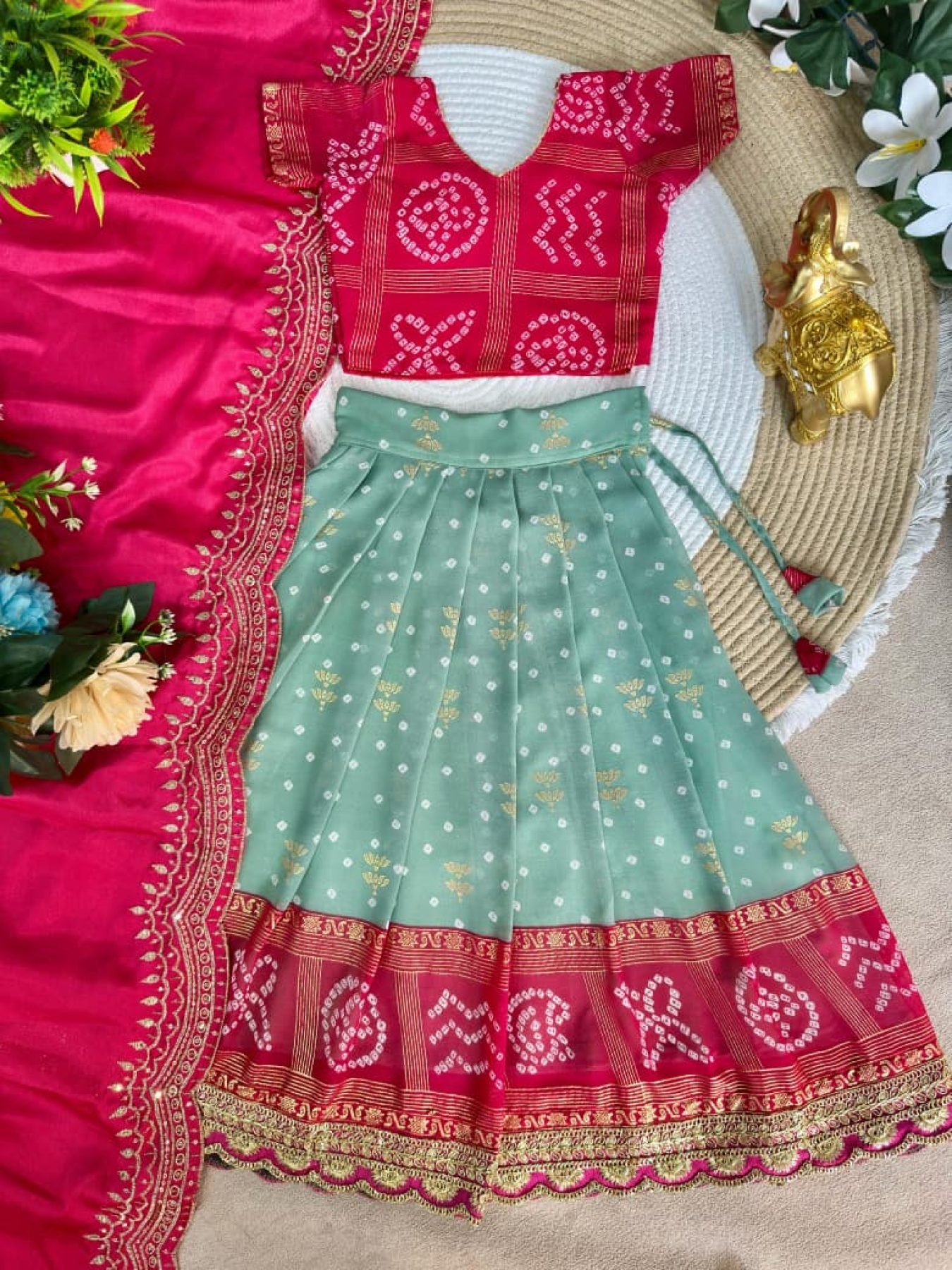 Compact Pink Green Bandhani Silk Kids Lehenga Choli with Dupatta for Festive Wear