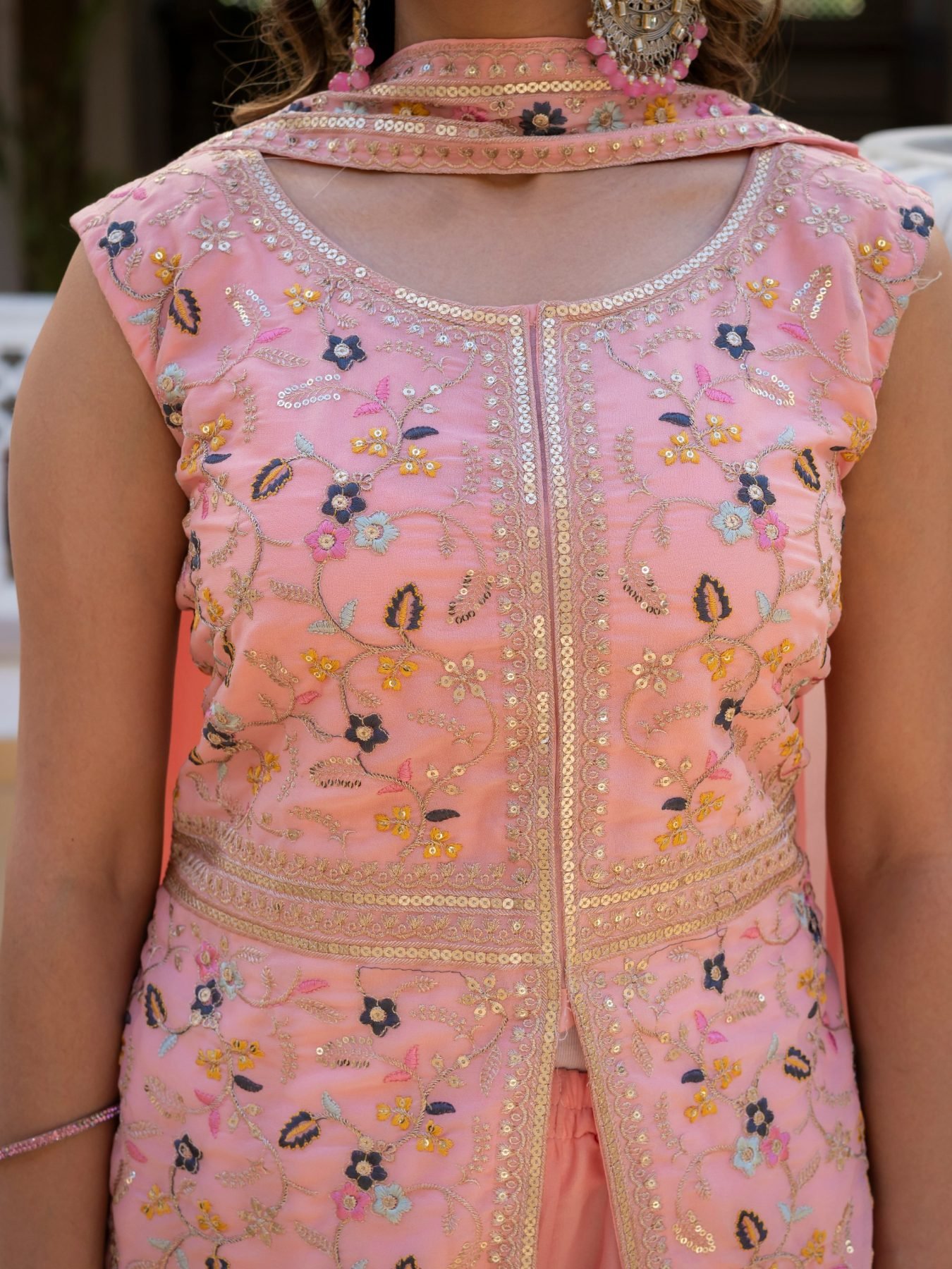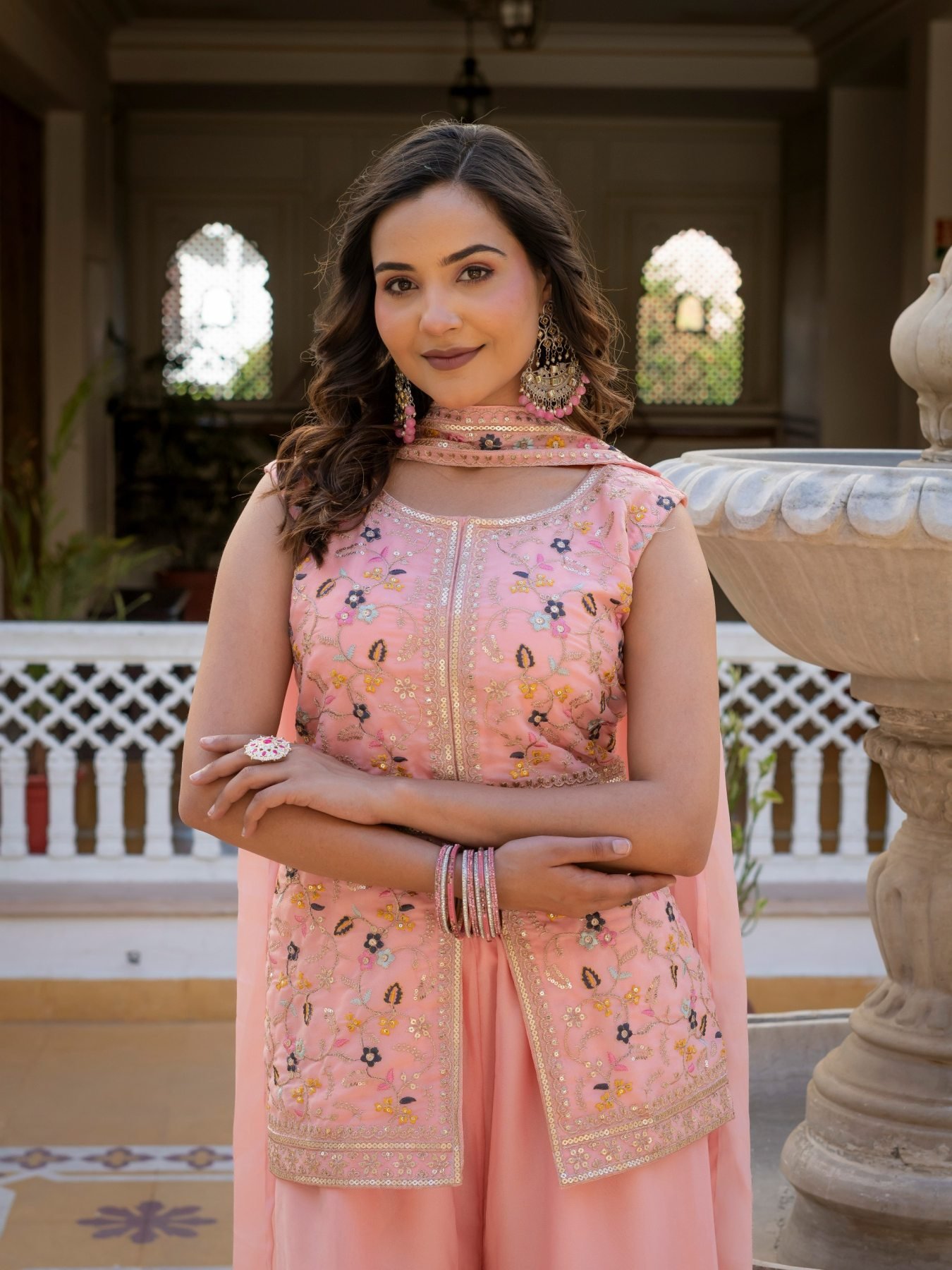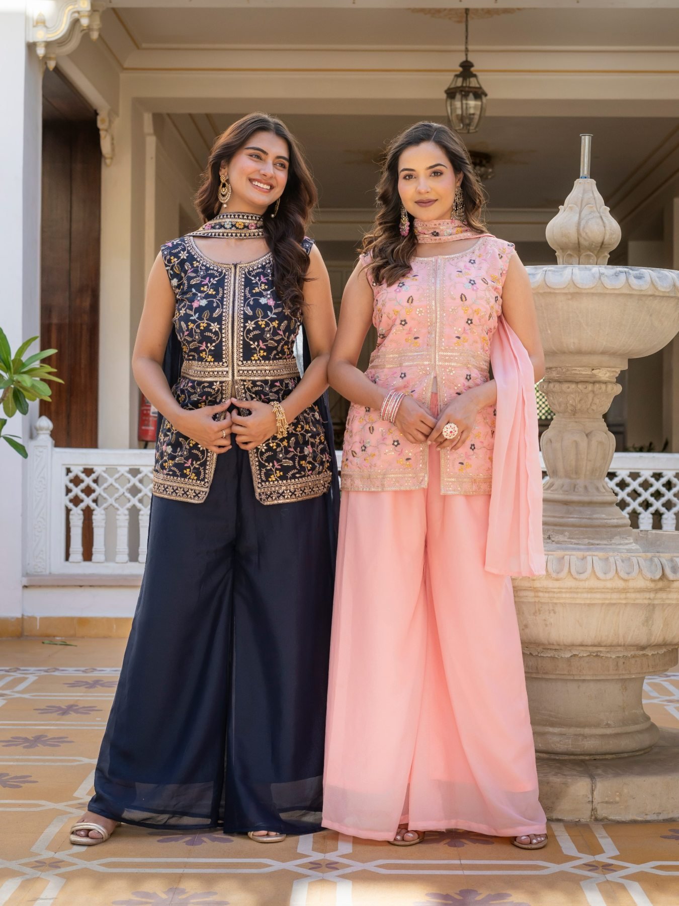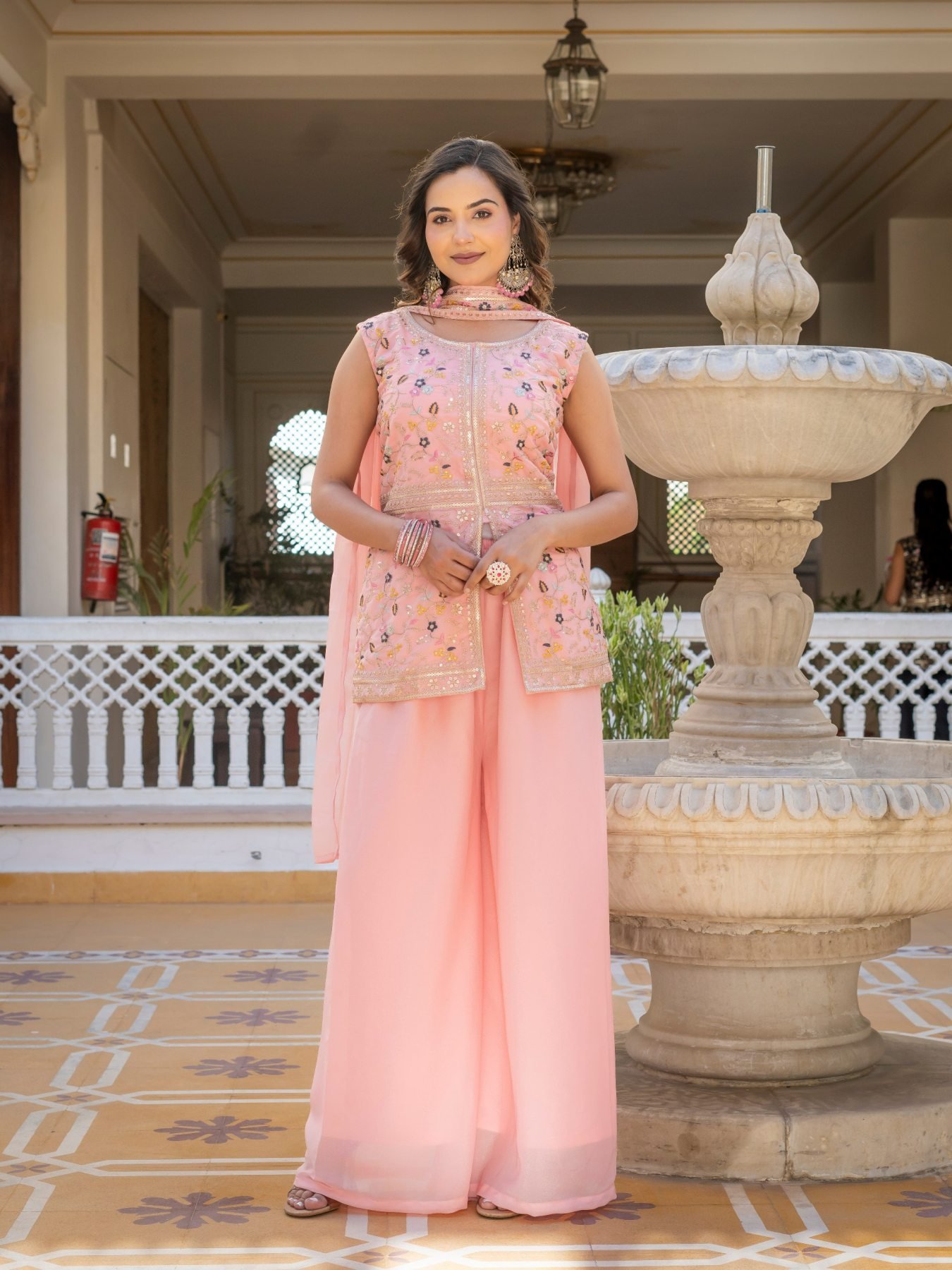 Stylish star georgette suit set with heavy embroidery top, palazzo, and matching dupatta. Lightweight and perfect for festive and party wear.