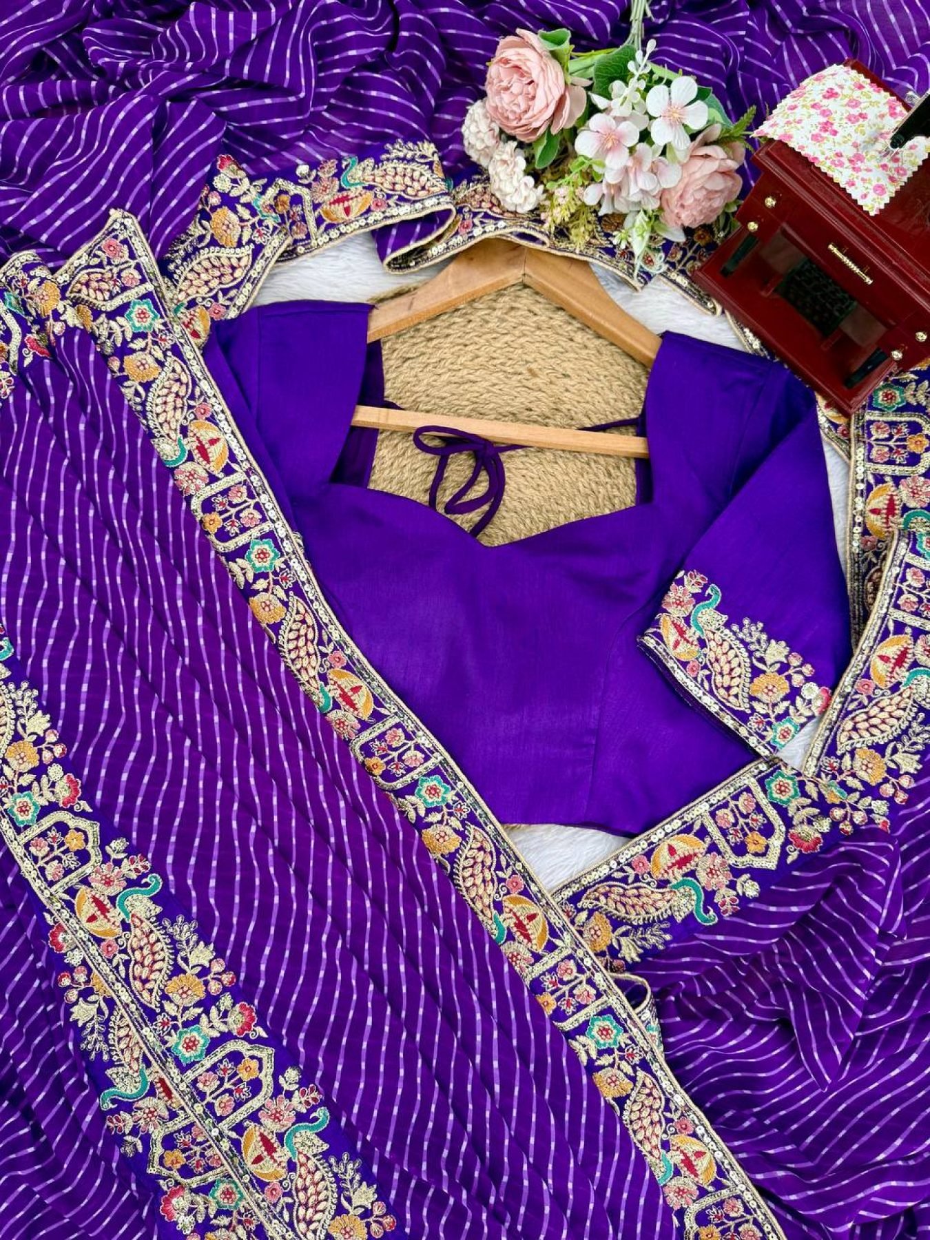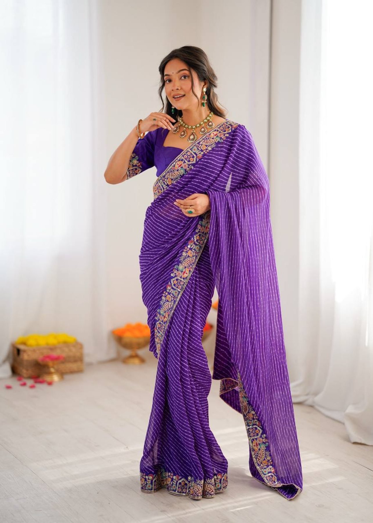 Elegant faux georgette saree featuring beautiful bandhani print with thread and sequins embroidery. Paired with a heavy mono banglori silk blouse, this designer piece offers a classy and graceful look, perfect for parties, festive occasions, and evening wear.