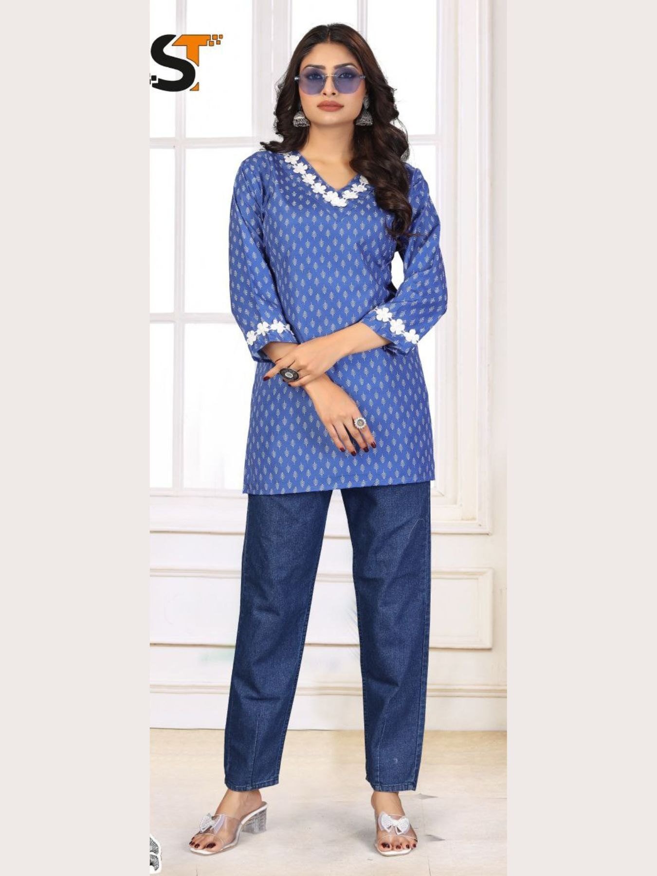 Cozy Blue Printed Cotton Top with Stylish Lace Work for Reseller