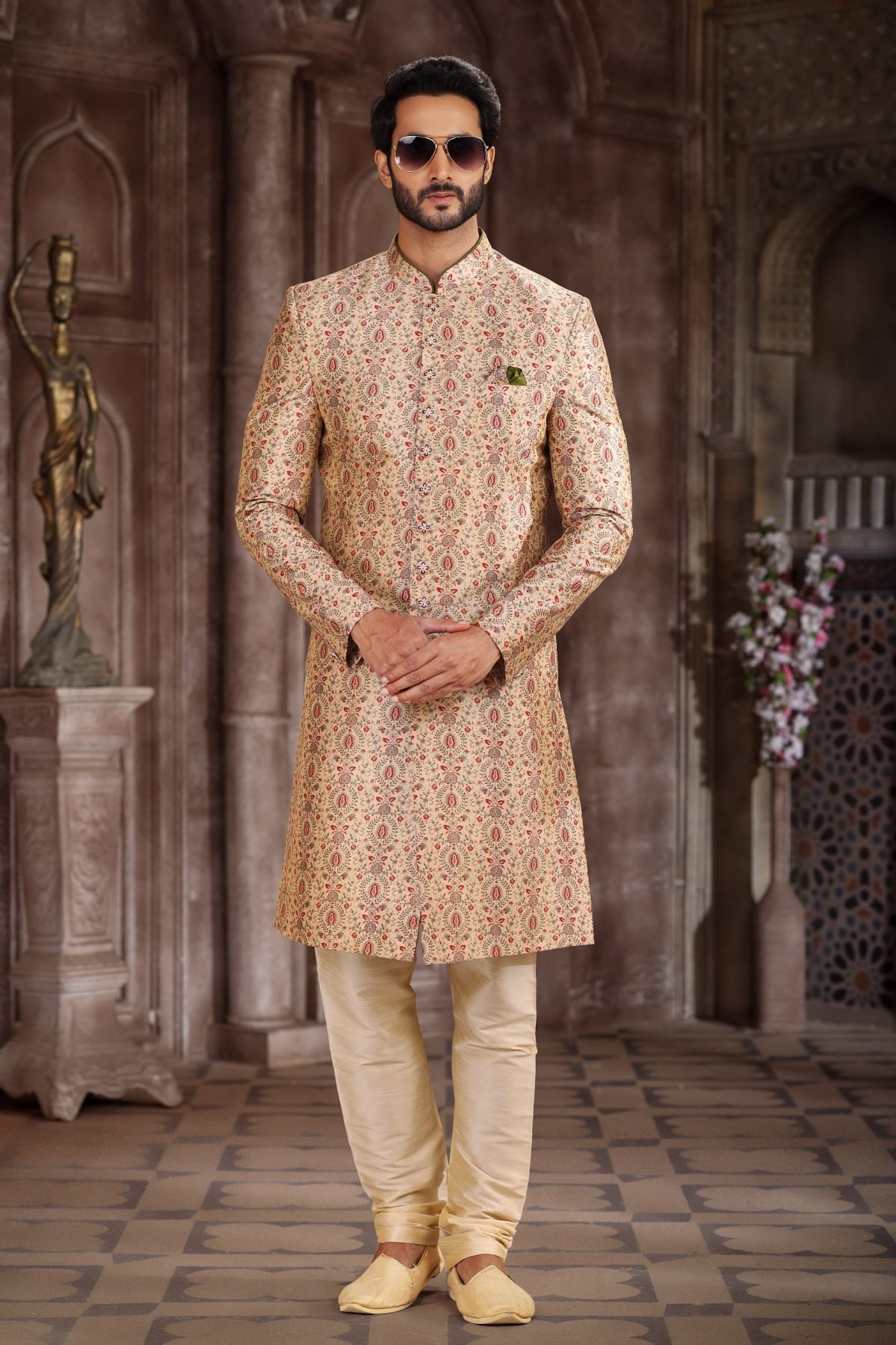 Premium dupion art silk sherwani set with designer printed pattern and chudidar bottom. Perfect for weddings, parties, and festive occasions with a rich elegant look.