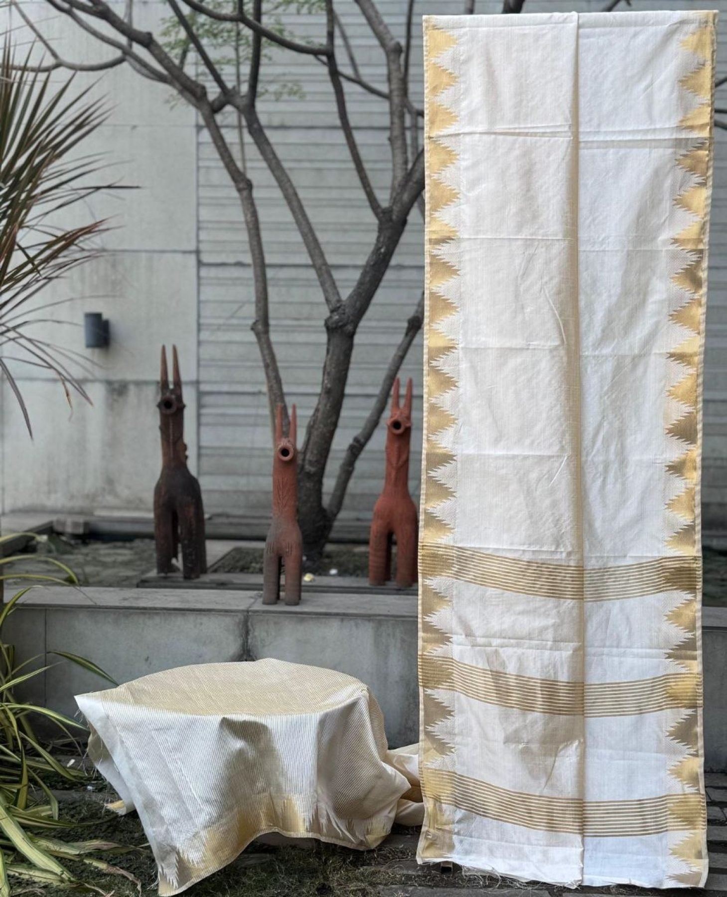Elegant semi tussar cotton saree in pearl cream shade with antique temple jacquard border and rich weaving pallu. Perfect for traditional and festive occasions.