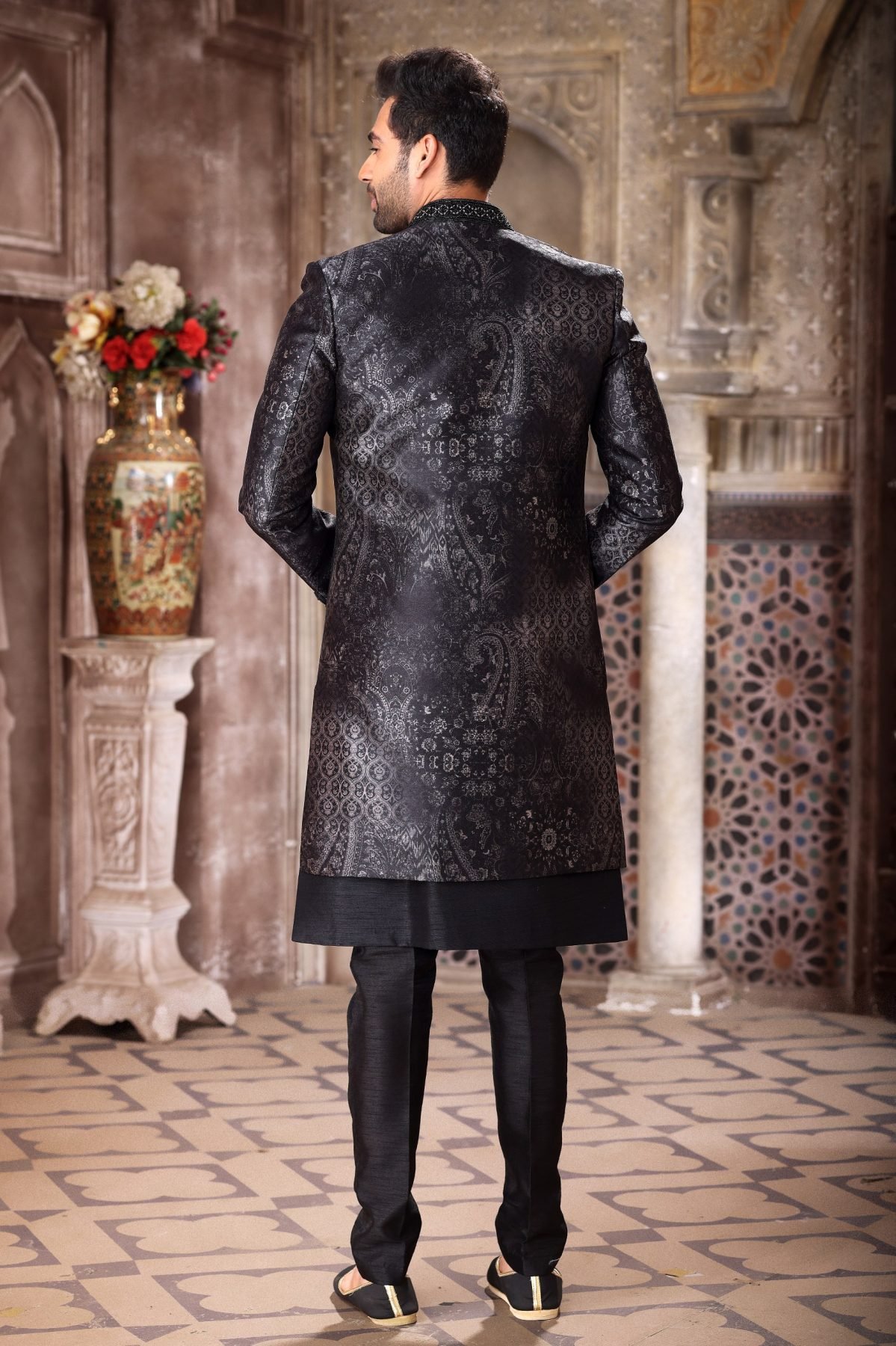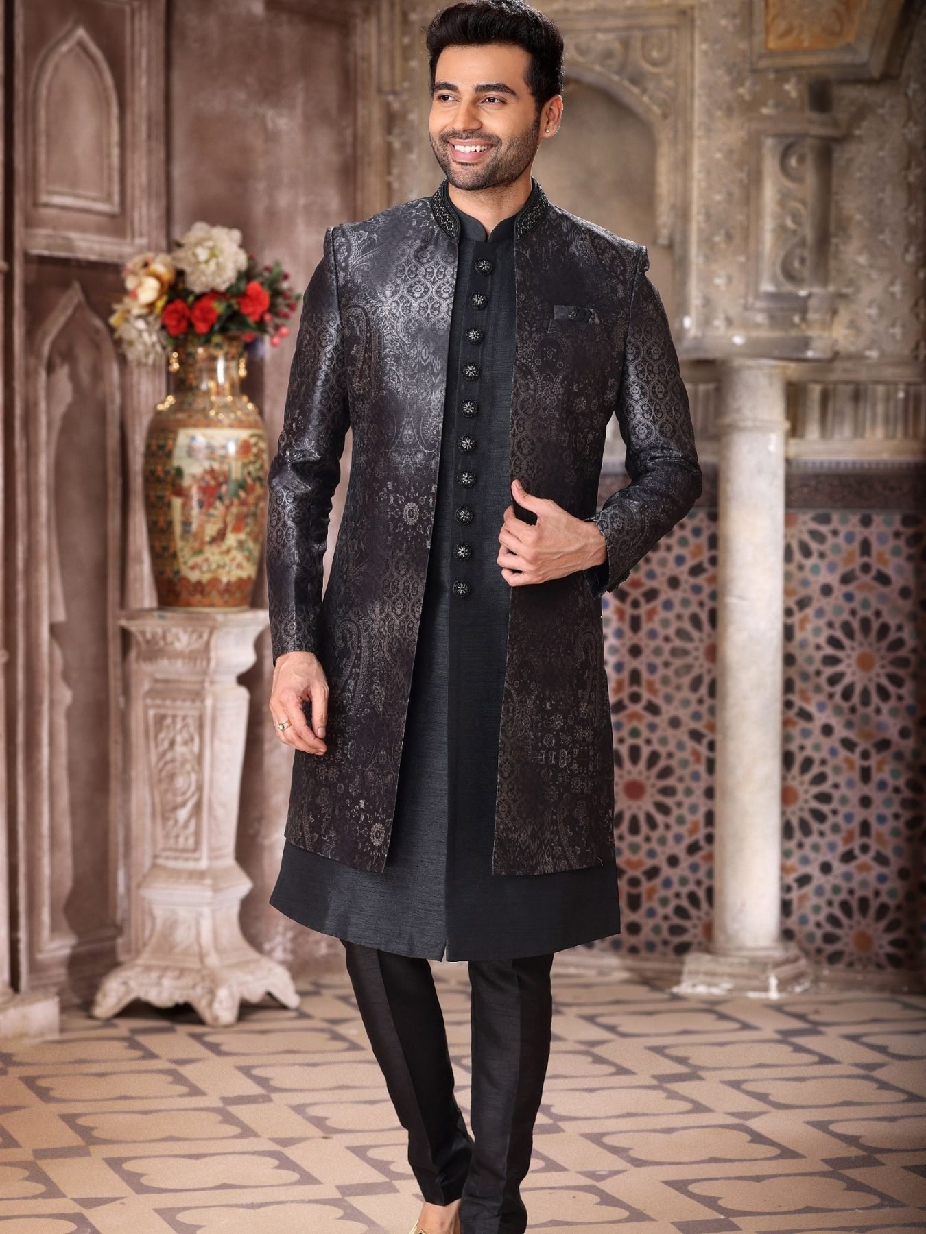 Premium 3 piece indo western jacket set crafted in art silk, velvet and banarasi jacquard fabrics with multiple designer variants. Comes with stylish jacket, kurta and aligarhi pant, perfect for wedding and festive wear.
