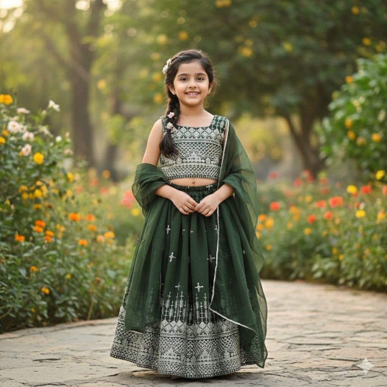 Customizable Green Georgette Kids Lehenga Set with Dupatta for Wedding Wear