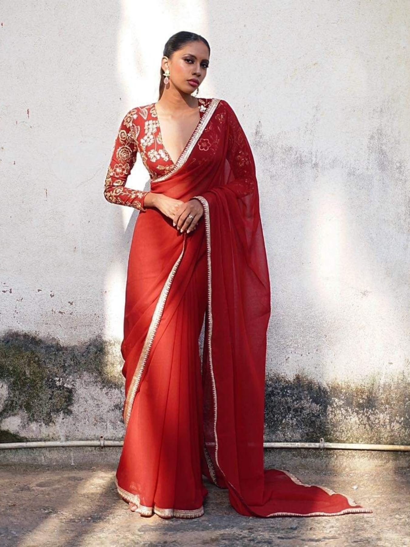 Customizable Red Georgette Saree with Sequence Embroidery Lace for Party Wear