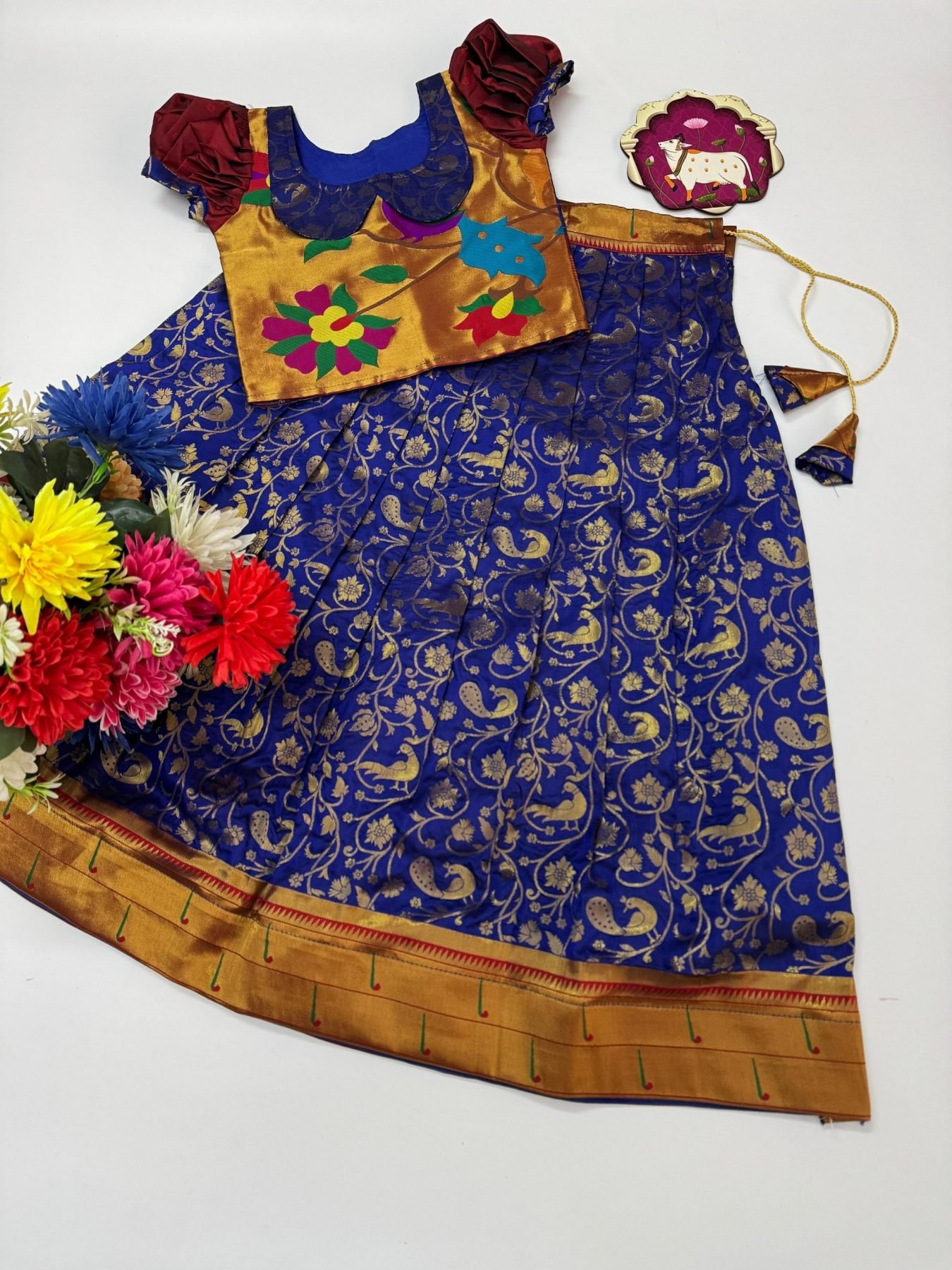 Elegant kids lehenga set featuring fancy meena and golden zari weaving work with a beautiful muniya border. Comes with a fully stitched blouse with zari detailing and fancy pasting, perfect for weddings and festive occasions.