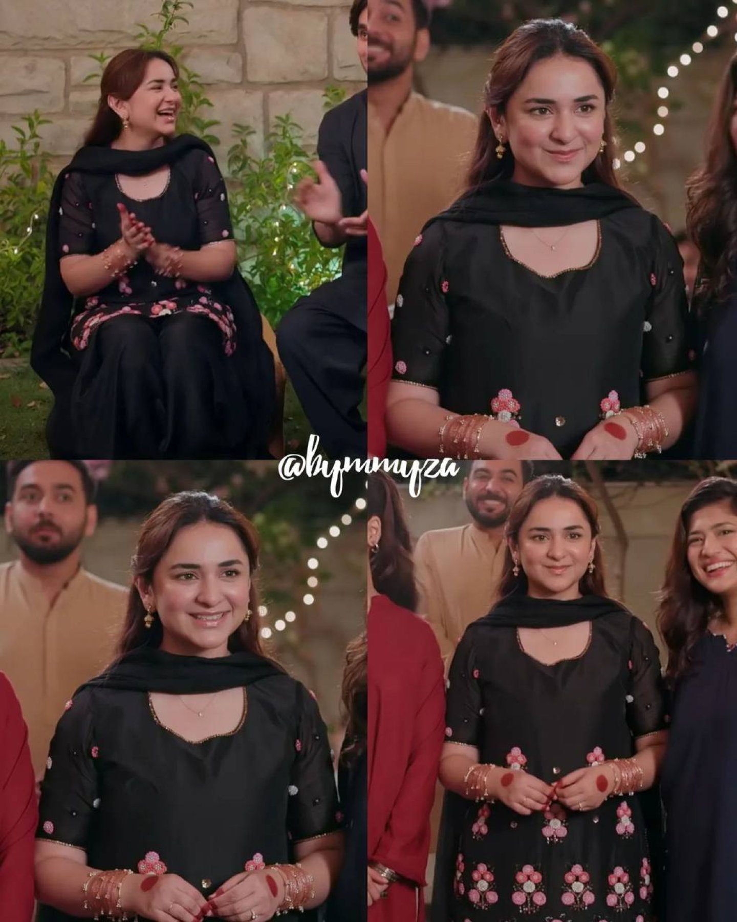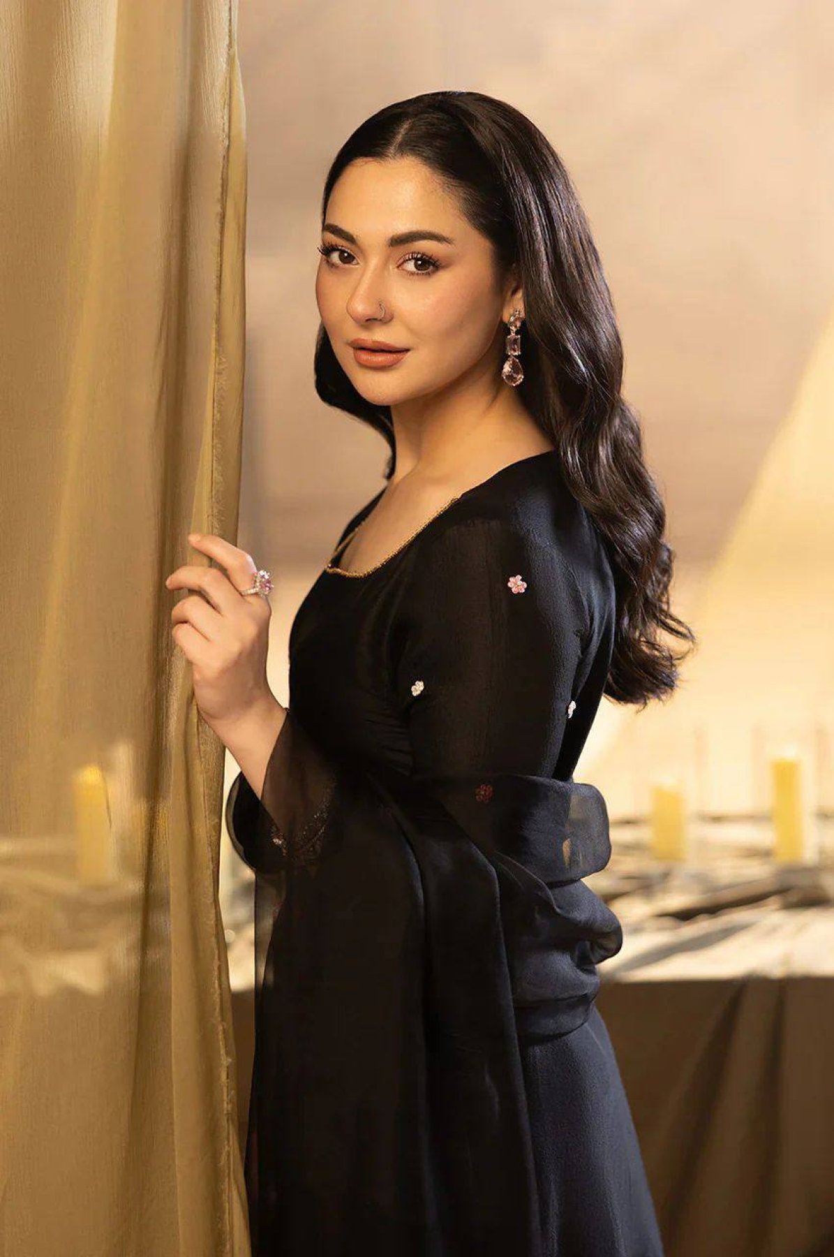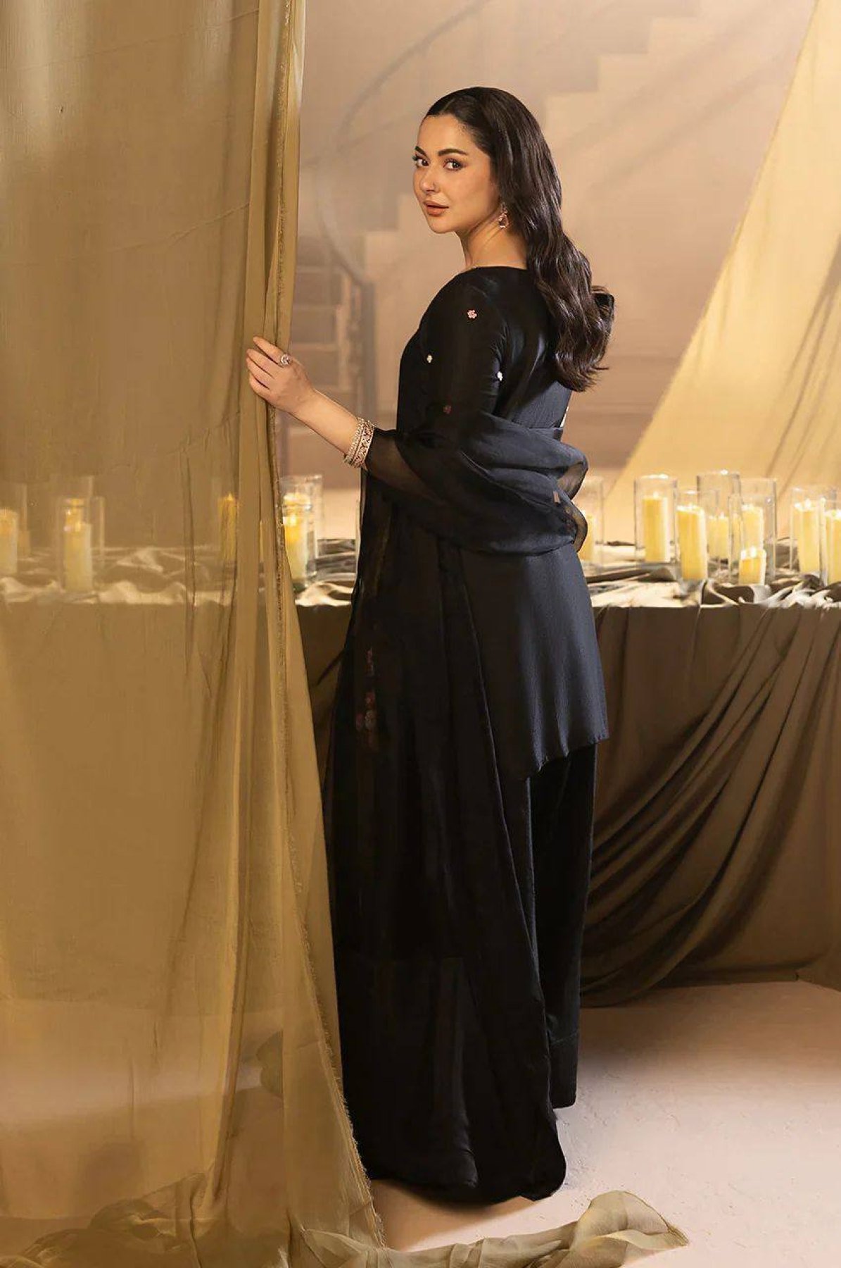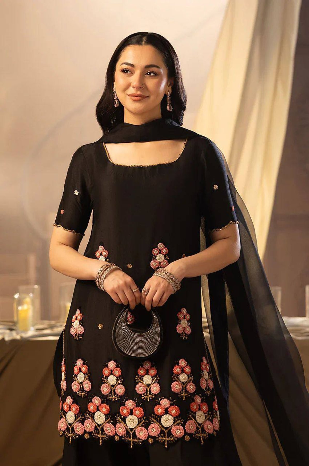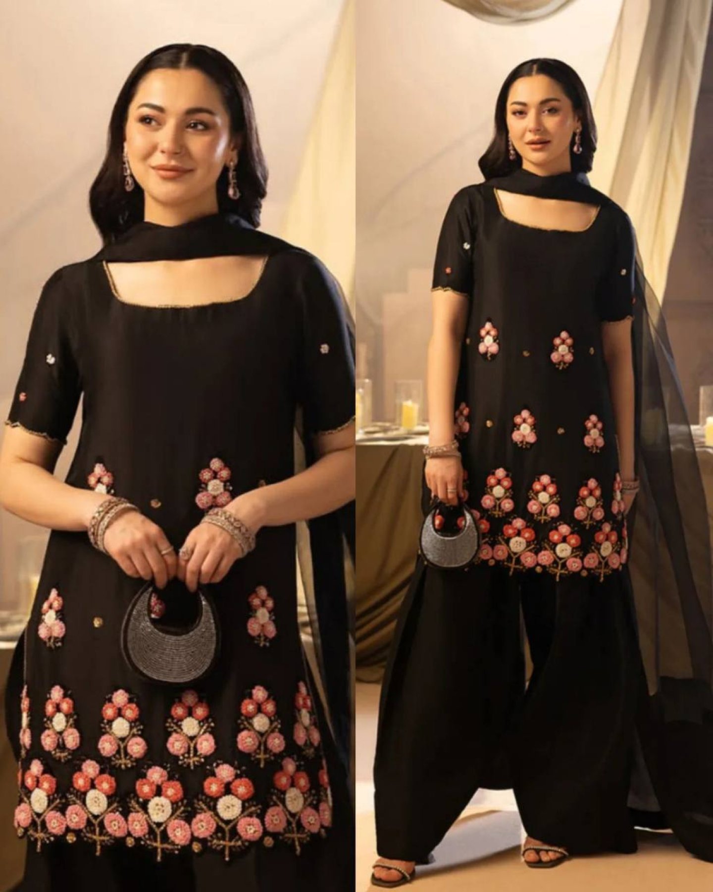 Hania Aamir inspired Pakistani style outfit featuring crape silk top with sequence embroidery, paired with stylish farsi salwar and soft organza dupatta. Perfect for festive wear, parties, and modern ethnic looks.