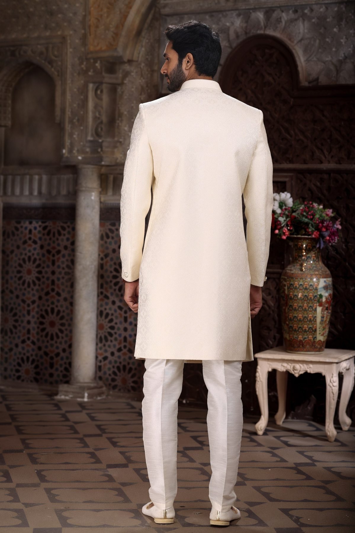 Premium Indo western set crafted in Banarasi jacquard with designer pattern work, paired with dupion art silk Aligarhi pants. Perfect for weddings and festive occasions.