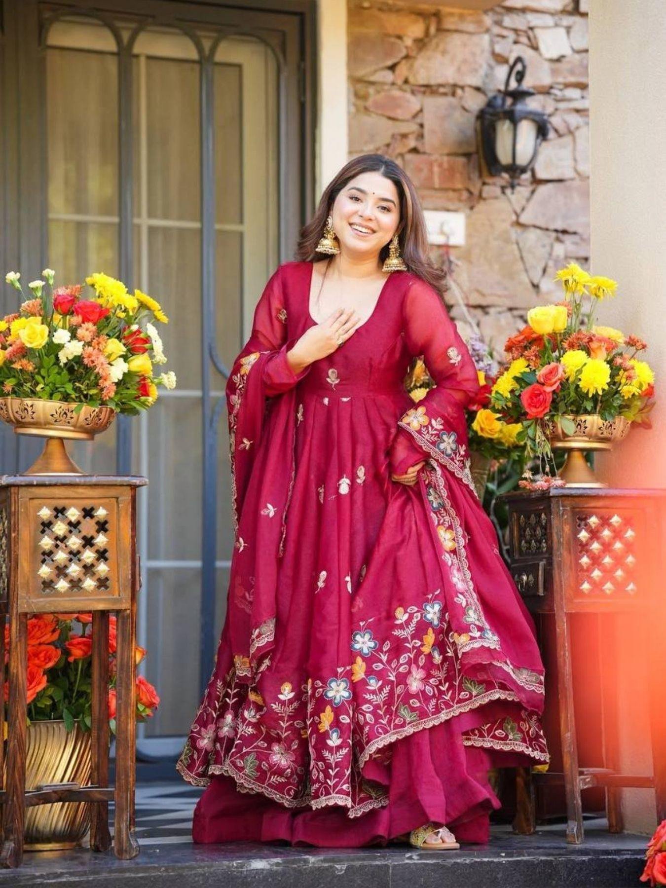 A regal deep red designer Anarkali suit that blends festive grace with premium craftsmanship — perfect for weddings, parties, and festive collections.
